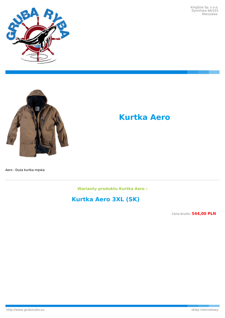 KingSize Sp. z o.o. Dymińska 6A/101 Warszawa Kurtka Aero Aero - Duża kurtka męska Warianty produktu Kurtka Aero : Kurtka Aero 3XL (SK) Cena brutto: http://www.grubaryba.eu 544,00 PLN sklep internetowy