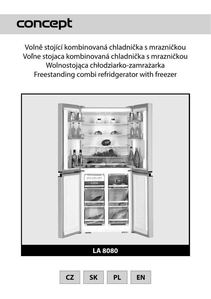 Volně stojící kombinovaná chladnička s mrazničkou Voľne stojaca kombinovaná chladnička s mrazničkou Wolnostojąca chłodziarko-zamrażarka Freestanding combi refridgerator with freezer LA 8080 CZ SK PL EN CZ PODĚKOVÁNÍ Děkujeme Vám, že jste si zakoupili výrobek značky Concept a přejeme Vám, abyste byli s naším výrobkem spokojeni po celou dobu jeho používání. Před prvním použitím prostudujte pozorně celý návod k obsluze a potom si jej uschovejte. Zajistěte, aby i ostatní osoby, které budou s výrobkem manipulovat, byly seznámeny s tímto návodem. OBSAH Technické parametry Důležitá upozornění Popis výrobku Návod k obsluze Orientační teploty, zásuvné výšky a časy pečení Čištění a údržba Běžné provozní zvuky Servis Ochrana životního prostředí 1 2 3 4 5 6 6 7 7 Technické parametry Napětí Třída energetické účinnosti Roční spotřeba energie Třída mrazničky Celkový objem (hrubý/užitný) Užitný objem (chladnička/mraznička) Mrazící kapacita Typ. chlazeni Rozměry (v x š x h) Klimatická třída Hlučnost 220-240 V / 50HZ A+ 314 kWh **** 408/388 litru 251/137 litru 6,5 kg / 24 hod 1 - kompresorová 1800 x 794 x 602 mm SN 42 (dB) Protože své výrobky vedené pod značkou CONCEPT neustále zlepšujeme, vyhrazujeme si právo na drobné změny, které považujeme za nevyhnutelné bez předem daného upozornění v tomto návodu k použití. LA 8080 1 CZ DŮLEŽITÁ UPOZORNĚNÍ: Při dodání spotřebiče • Ihned po dodání zkontrolujte obal a spotřebič, zda nevznikly škody při přepravě. • Pokud je spotřebič poškozen, nezprovozňujte ho. Co nejdříve se spojte s dodavatelem. • Před prvním použitím odstraňte ze spotřebiče všechny obaly a marketingové materiály. • Obalový materiál řádně zlikvidujte. Při instalaci • Nepoužívejte spotřebič jinak, než je popsáno v tomto návodu. • Ověřte zda připojované napětí odpovídá hodnotám na typovém štítku spotřebiče. • Nepoužívejte spotřebič, jste-li bosí. • Nesedejte si a nestoupejte na otevřena dvířka spotřebiče. • Osoby se sníženou pohybovou schopnosti, se sníženým smyslovým vnímáním, s nedostatečnou duševní způsobilostí nebo osoby neseznámené s obsluhou musí používat spotřebič jen pod dozorem zodpovědně seznámené osoby. • Nesahejte na spotřebič vlhkýma nebo mokrýma rukama. • V případě poruchy vypněte spotřebič a vytáhněte zástrčku ze zásuvky elektrického napětí. • Při vypojování spotřebiče ze zásuvky elektrického napětí nikdy netahejte za přívodní kabel, ale uchopte zástrčku a tahem ji vypojte. • Pravidelně kontrolujte spotřebič i přívodní kabel z důvodu poškození. Nezapínejte poškozeny spotřebič. • Nepoužívejte spotřebič, pokud jsou dvířka nebo těsnění dvířek poškozené. Nechte je opravit v autorizovaném servisu. • Neponořujte přívodní kabel nebo zástrčku do vody ani do jiné kapaliny. • Není-li spotřebič v provozu, dbejte na to, aby byly všechny jeho ovládací prvky ve vypnuté poloze. • Nepoužívejte příslušenství, které má poškozenou povrchovou úpravu, je opotřebované, případně má jiné defekty. • Před zapnutím nechte spotřebiče alespoň 4 hodiny stát, aby se usadil olej v kompresoru po přepravě. • Používejte spotřebič v místnosti, kde by se teplota mela pohybovat mezi +10°C až +32°C. • Neumísťujte spotřebič do blízkosti tepelných zdrojů, Může se tím zvýšit jeho spotřeba i životnost. • Ujistěte se, že kolem spotřebiče je dostatečný prostor pro volny oběh vzduchu • Nepokládejte žádné předměty na horní plochu spotřebiče, mohlo by dojít k jeho poškození • Neumísťujte do spotřebiče elektrické zařízení jako jsou mixéry atd. • Vnitřní prostor spotřebiče je zapotřebí před použitím otřít roztokem jedlé sody rozpuštěné ve vlažné vodě. Po očištění všechny části důkladně osušte. • Tento spotřebič může být používán v domácnostech a podobných prostorech, jako jsou: Kuchyňské kouty v obchodech, kancelářích a ostatních pracovištích; Spotřebiče • používané v zemědělství; Spotřebiče používané hosty v hotelích, motelech a jiných oblastech; Spotřebiče používané v podnicích zajišťujících nocleh se snídaní. • Tento spotřebič může být používán dětmi ve věku od 8 let výše • a osobami se sníženými fyzickými, smyslovými nebo duševními • schopnostmi, nebo bez patřičných zkušeností a znalostí, pokud • jsou pod dohledem nebo byli seznámeny s pokyny k použití • spotřebiče bezpečným způsobem a rozumí jeho rizikům. • Děti si nesmí hrát se spotřebičem. • Čištění a uživatelskou údržbu by neměli provádět děti, pokud jsou mladší než 8 let a nejsou pod dohledem. • udržujte zařízení a jeho kabel mimo dosah dětí mladších než 8 let. Nedodržíte-li pokyny výrobce, nemůže být případná oprava uznána jako záruční. 2 LA 8080 CZ Jsou-li v domácnosti děti • Nedovolte dětem a nesvéprávným osobám se spotřebičem manipulovat, používejte ho mimo jejich dosahu. • Osoby se sníženou pohybovou schopnosti, se sníženým smyslovým vnímáním, s nedostatečnou duševní způsobilosti nebo osoby neseznámené s obsluhou musí používat spotřebič jen pod dozorem zodpovědně seznámené osoby. • Dbejte zvýšené opatrnosti, pokud je spotřebič používán v blízkosti dětí. • Nedovolte, aby byl spotřebič používán jako hračka. • Nepoužívejte jiné příslušenství, než je doporučeno výrobcem POZOR! • Spotřebič otevírejte jen krátkodobě k vloženi nebo vyjmuti pokrmů, aby nedošlo ke zraněni např. klopýtnutím. • Děti by se mohly do spotřebiče zavřít (nebezpečí udušení) nebo být vystaveny jinému nebezpečí. Případné závady 