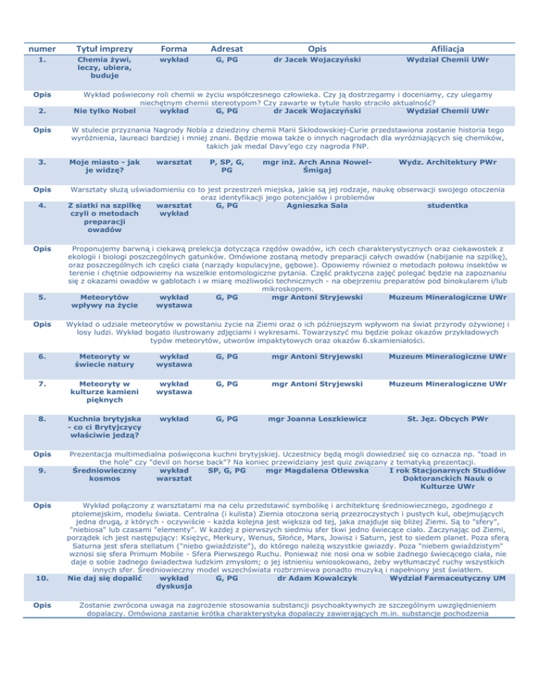 numer Tytuł imprezy Forma Adresat Opis Afiliacja