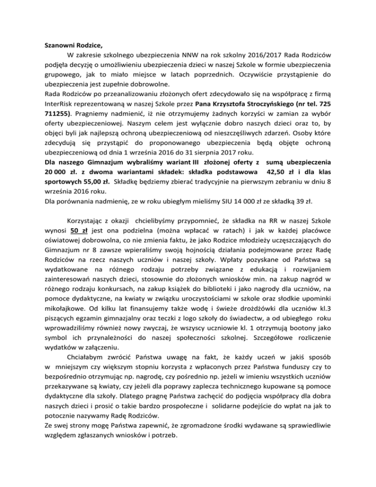Szanowni Rodzice, W zakresie szkolnego ubezpieczenia NNW na rok szkolny 2016/2017 Rada Rodziców podjęła decyzję o umożliwieniu ubezpieczenia dzieci w naszej Szkole w formie ubezpieczenia grupowego, jak to miało miejsce w latach poprzednich. Oczywiście przystąpienie do ubezpieczenia jest zupełnie dobrowolne. Rada Rodziców po przeanalizowaniu złożonych ofert zdecydowało się na współpracę z firmą InterRisk reprezentowaną w naszej Szkole przez Pana Krzysztofa Stroczyńskiego (nr tel. 725 711255). Pragniemy nadmienić, iż nie otrzymujemy żadnych korzyści w zamian za wybór oferty ubezpieczeniowej. Naszym celem jest wyłącznie dobro naszych dzieci oraz to, by objęci byli jak najlepszą ochroną ubezpieczeniową od nieszczęśliwych zdarzeń. Osoby które zdecydują się przystąpić do proponowanego ubezpieczenia będą objęte ochroną ubezpieczeniową od dnia 1 września 2016 do 31 sierpnia 2017 roku. Dla naszego Gimnazjum wybraliśmy wariant III złożonej oferty z sumą ubezpieczenia 20 000 zł. z dwoma wariantami składek: składka podstawowa 42,50 zł i dla klas sportowych 55,00 zł. Składkę będziemy zbierać tradycyjnie na pierwszym zebraniu w dniu 8 września 2016 roku. Dla porównania nadmienię, ze w roku ubiegłym mieliśmy SIU 14 000 zł ze składką 39 zł. Korzystając z okazji chcielibyśmy przypomnieć, że składka na RR w naszej Szkole wynosi 50 zł jest ona podzielna (można wpłacać w ratach) i jak w każdej placówce oświatowej dobrowolna, co nie zmienia faktu, że jako Rodzice młodzieży uczęszczających do Gimnazjum nr 8 zawsze wpieraliśmy swoją hojnością działania podejmowane przez Radę Rodziców na rzecz naszych uczniów i naszej szkoły. Wpłaty pozyskane od Państwa są wydatkowane na różnego rodzaju potrzeby związane z edukacją i rozwijaniem zainteresowań naszych dzieci, stosownie do złożonych wniosków min. na zakup nagród w różnego rodzaju konkursach, na zakup książek do biblioteki i jako nagrody dla uczniów, na pomoce dydaktyczne, na kwiaty w związku uroczystościami w szkole oraz słodkie upominki mikołajkowe. Od kilku lat finansujemy także wodę i świeże drożdżówki dla uczniów kl.3 piszących egzamin gimnazjalny oraz teczki z logo szkoły do świadectw, a od ubiegłego roku wprowadziliśmy również nowy zwyczaj, że wszyscy uczniowie kl. 1 otrzymują bootony jako symbol ich przynależności do naszej społeczności szkolnej. Szczegółowe rozliczenie wydatków w załączeniu. Chciałabym zwrócić Państwa uwagę na fakt, że każdy uczeń w jakiś sposób w mniejszym czy większym stopniu korzysta z wpłaconych przez Państwa funduszy czy to bezpośrednio otrzymując np. nagrodę, czy pośrednio np. jeżeli w imieniu wszystkich uczniów przekazywane są kwiaty, czy jeżeli dla poprawy zaplecza technicznego kupowane są pomoce dydaktyczne dla szkoły. Dlatego pragnę Państwa zachęcić do podjęcia współpracy dla dobra naszych dzieci i prosić o takie bardzo prospołeczne i solidarne podejście do wpłat na jak to potocznie nazywamy Radę Rodziców. Ze swej strony mogę Państwa zapewnić, że zgromadzone środki wydawane są sprawiedliwie względem zgłaszanych wniosków i potrzeb. Wydatki w roku szkolnym 2015/2016 Wpłaty na RR w roku szkolnym 2015/2016 IC IB IA ID IID IIB IIA IIC IIIA IIIC IIIB IIIA IIID zwrot ubezp. WARTA stroje od sponsora Ciesiółka Auto Group RAZEM 865,00 zł 600,00 zł 650,00 zł 650,00 zł 400,00 zł 300,00 zł 590,00 zł 520,00 zł 640,00 zł 430,00 zł 200,00 zł 640,00 zł 460,00 zł 1 082,13 zł 500,00 zł 8 527,13 zł Stan środków finansowych na dzień 08.09.2016 wydruk Plakaty kwiaty Dzień Edukacji kwiaty Dzień Edukacji drukarka prezent dla szkoły mikołaj dyplomy statuetki Książki - biblioteka Książki - biblioteka baton dla kl I baton dla kl III kwiaty zakończenie roku statuetka kart empik nagrody stroje sportowe plakat woda na egz. Gim. woda na egz. Gim. drożdżówki na egz. Gim. mam talent nagroda gra szkolna 1050 rocznica chrztu Polski nagrody za wpł. na RR 4562,18 zł Z poważaniem Przewodnicząca RR Gimnazjum Nr 8 Justyna Przewoźna 52,10 zł 80,00 zł 180,00 zł 358,00 zł 609,95 zł 390,40 zł 500,00 zł 557,32 zł 499,98 zł 156,83 zł 175,28 zł 541,00 zł 473,00 zł 100,00 zł 500,00 zł 6,83 zł 136,08 zł 24,30 zł 210,00 zł 110,00 zł 200,00 zł 200,00 zł 6 061,07 zł