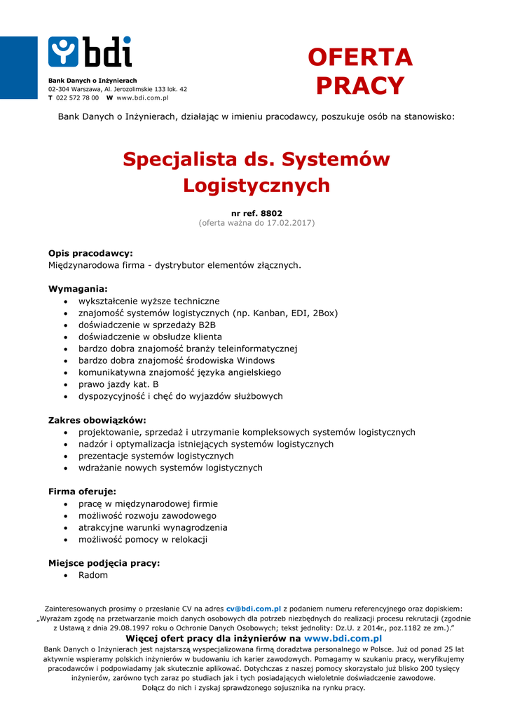 OFERTA PRACY Bank Danych o Inżynierach 02-304 Warszawa, Al. Jerozolimskie 133 lok. 42 T 022 572 78 00 W www.bdi.com.pl Bank Danych o Inżynierach, działając w imieniu pracodawcy, poszukuje osób na stanowisko: Specjalista ds. Systemów Logistycznych nr ref. 8802 (oferta ważna do 17.02.2017) Opis pracodawcy: Międzynarodowa firma - dystrybutor elementów złącznych. Wymagania: wykształcenie wyższe techniczne znajomość systemów logistycznych (np. Kanban, EDI, 2Box) doświadczenie w sprzedaży B2B doświadczenie w obsłudze klienta bardzo dobra znajomość branży teleinformatycznej bardzo dobra znajomość środowiska Windows komunikatywna znajomość języka angielskiego prawo jazdy kat. B dyspozycyjność i chęć do wyjazdów służbowych Zakres obowiązków: projektowanie, sprzedaż i utrzymanie kompleksowych systemów logistycznych nadzór i optymalizacja istniejących systemów logistycznych prezentacje systemów logistycznych wdrażanie nowych systemów logistycznych Firma oferuje: pracę w międzynarodowej firmie możliwość rozwoju zawodowego atrakcyjne warunki wynagrodzenia możliwość pomocy w relokacji Miejsce podjęcia pracy: Radom Zainteresowanych prosimy o przesłanie CV na adres [email protected] z podaniem numeru referencyjnego oraz dopiskiem: „Wyrażam zgodę na przetwarzanie moich danych osobowych dla potrzeb niezbędnych do realizacji procesu rekrutacji (zgodnie z Ustawą z dnia 29.08.1997 roku o Ochronie Danych Osobowych; tekst jednolity: Dz.U. z 2014r., poz.1182 ze zm.).” Więcej ofert pracy dla inżynierów na www.bdi.com.pl Bank Danych o Inżynierach jest najstarszą wyspecjalizowana firmą doradztwa personalnego w Polsce. Już od ponad 25 lat aktywnie wspieramy polskich inżynierów w budowaniu ich karier zawodowych. Pomagamy w szukaniu pracy, weryfikujemy pracodawców i podpowiadamy jak skutecznie aplikować. Dotychczas z naszej pomocy skorzystało już blisko 200 tysięcy inżynierów, zarówno tych zaraz po studiach jak i tych posiadających wieloletnie doświadczenie zawodowe. Dołącz do nich i zyskaj sprawdzonego sojusznika na rynku pracy.