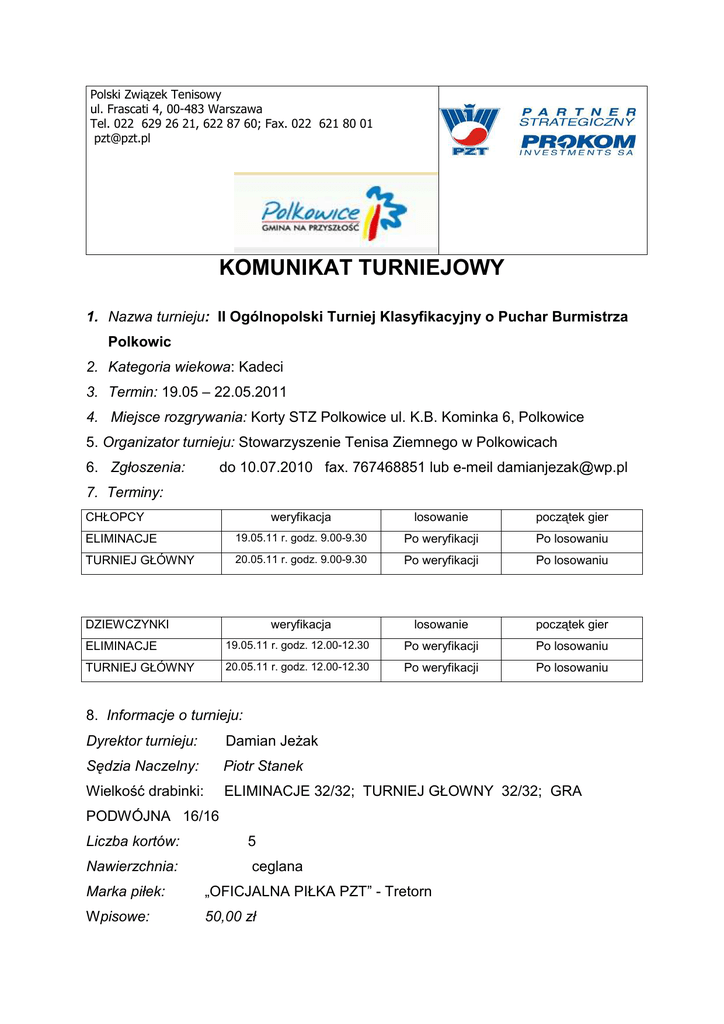 Polski Związek Tenisowy ul. Frascati 4, 00-483 Warszawa Tel. 022 629 26 21, 622 87 60; Fax. 022 621 80 01 [email protected] KOMUNIKAT TURNIEJOWY 1. Nazwa turnieju: II Ogólnopolski Turniej Klasyfikacyjny o Puchar Burmistrza Polkowic 2. Kategoria wiekowa: Kadeci 3. Termin: 19.05 – 22.05.2011 4. Miejsce rozgrywania: Korty STZ Polkowice ul. K.B. Kominka 6, Polkowice 5. Organizator turnieju: Stowarzyszenie Tenisa Ziemnego w Polkowicach 6. Zgłoszenia: do 10.07.2010 fax. 767468851 lub e-meil [email protected] 7. Terminy: CHŁOPCY weryfikacja losowanie początek gier ELIMINACJE 19.05.11 r. godz. 9.00-9.30 Po weryfikacji Po losowaniu TURNIEJ GŁÓWNY 20.05.11 r. godz. 9.00-9.30 Po weryfikacji Po losowaniu weryfikacja losowanie początek gier DZIEWCZYNKI ELIMINACJE 19.05.11 r. godz. 12.00-12.30 Po weryfikacji Po losowaniu TURNIEJ GŁÓWNY 20.05.11 r. godz. 12.00-12.30 Po weryfikacji Po losowaniu 8. Informacje o turnieju: Dyrektor turnieju: Damian JeŜak Sędzia Naczelny: Piotr Stanek Wielkość drabinki: ELIMINACJE 32/32; TURNIEJ GŁOWNY 32/32; GRA PODWÓJNA 16/16 Liczba kortów: 5 Nawierzchnia: ceglana Marka piłek: „OFICJALNA PIŁKA PZT” - Tretorn Wpisowe: 50,00 zł Polski Związek Tenisowy ul. Frascati 4, 00-483 Warszawa Tel. 022 629 26 21, 622 87 60; Fax. 022 621 80 01 [email protected] 9. MoŜliwości zakwaterowania: 1.Aqua Hotel S.A. - www.aquahotel.pl ul. Młyńska 6, Polkowice - 76 746 27 00 dla uczestników turnieju 160 zł pokój 2 osobowy z nieograniczonym wstępem do Aqua Parku 2. Hotel ul.Hubala 24, Polkowice 76 847 04 56 dwspit.pl 3. U Zenka. Zajazd ul. Tadeusza Babisza 2A, Polkowice76 722 22 22 10. Nagrody: pula nagród 5 000 zł 11. Inne informacje: Informacje o dopuszczeniu do turnieju od 12.05.2011 r. tel. 501 586 239 lub na stronie internetowej www.stz.polkowice.com.pl