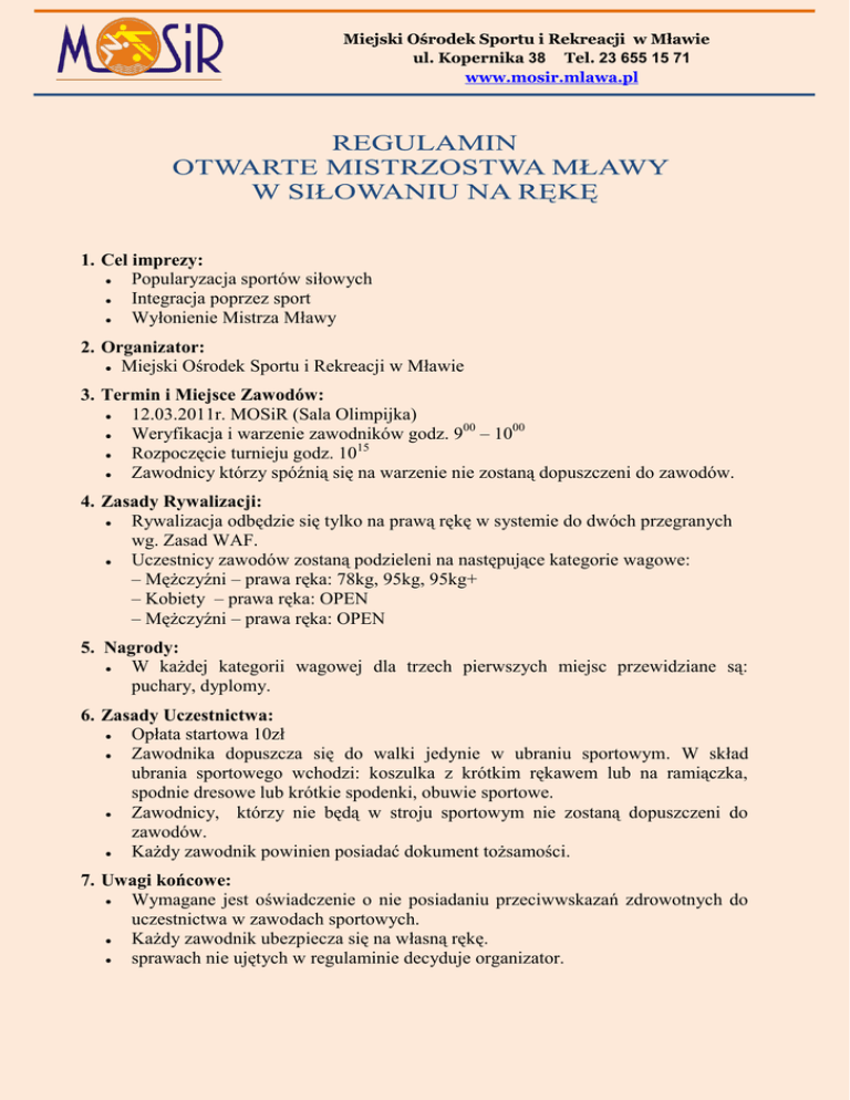 Miejski Ośrodek Sportu i Rekreacji w Mławie ul. Kopernika 38 Tel. 23 655 15 71 www.mosir.mlawa.pl 1. Cel imprezy: Popularyzacja sportów siłowych Integracja poprzez sport Wyłonienie Mistrza Mławy 2. Organizator: Miejski Ośrodek Sportu i Rekreacji w Mławie 3. Termin i Miejsce Zawodów: 12.03.2011r. MOSiR (Sala Olimpijka) Weryfikacja i warzenie zawodników godz. 900 – 1000 Rozpoczęcie turnieju godz. 1015 Zawodnicy którzy spóźnią się na warzenie nie zostaną dopuszczeni do zawodów. 4. Zasady Rywalizacji: Rywalizacja odbędzie się tylko na prawą rękę w systemie do dwóch przegranych wg. Zasad WAF. Uczestnicy zawodów zostaną podzieleni na następujące kategorie wagowe: – Mężczyźni – prawa ręka: 78kg, 95kg, 95kg+ – Kobiety – prawa ręka: OPEN – Mężczyźni – prawa ręka: OPEN 5. Nagrody: W każdej kategorii wagowej dla trzech pierwszych miejsc przewidziane są: puchary, dyplomy. 6. Zasady Uczestnictwa: Opłata startowa 10zł Zawodnika dopuszcza się do walki jedynie w ubraniu sportowym. W skład ubrania sportowego wchodzi: koszulka z krótkim rękawem lub na ramiączka, spodnie dresowe lub krótkie spodenki, obuwie sportowe. Zawodnicy, którzy nie będą w stroju sportowym nie zostaną dopuszczeni do zawodów. Każdy zawodnik powinien posiadać dokument tożsamości. 7. Uwagi końcowe: Wymagane jest oświadczenie o nie posiadaniu przeciwwskazań zdrowotnych do uczestnictwa w zawodach sportowych. Każdy zawodnik ubezpiecza się na własną rękę. sprawach nie ujętych w regulaminie decyduje organizator.