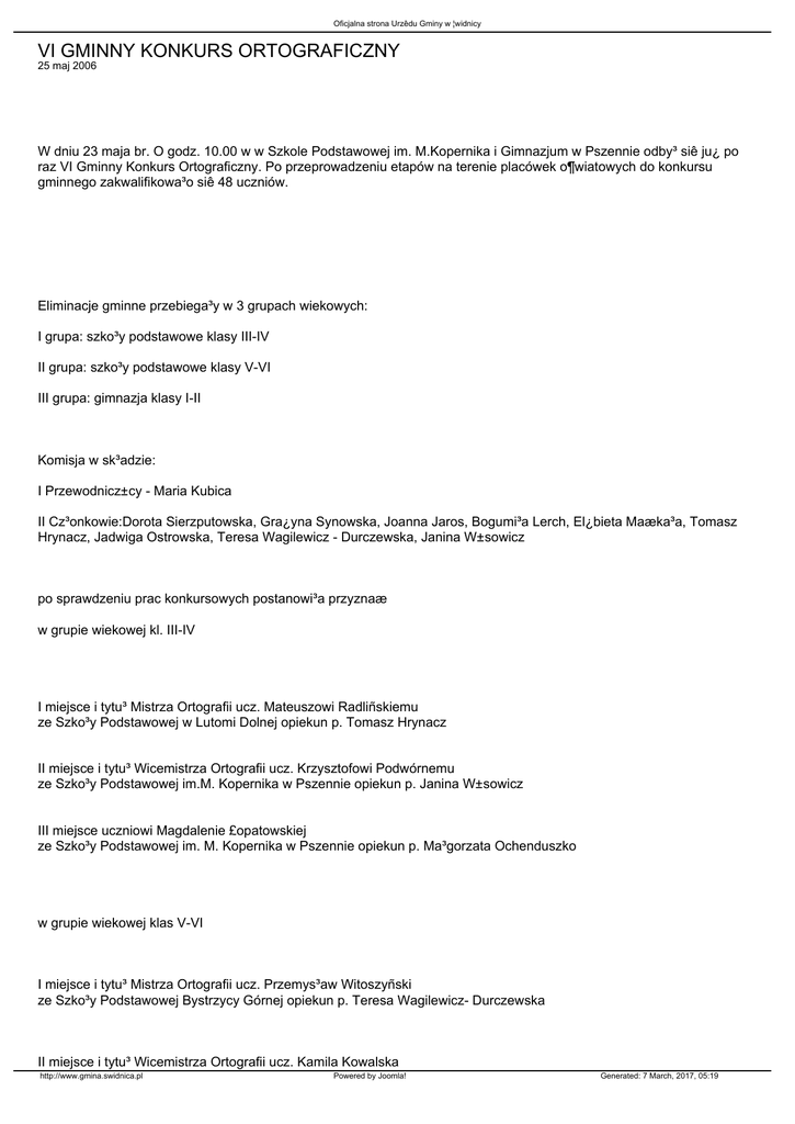Oficjalna strona Urzêdu Gminy w ¦widnicy VI GMINNY KONKURS ORTOGRAFICZNY 25 maj 2006 W dniu 23 maja br. O godz. 10.00 w w Szkole Podstawowej im. M.Kopernika i Gimnazjum w Pszennie odby³ siê ju¿ po raz VI Gminny Konkurs Ortograficzny. Po przeprowadzeniu etapów na terenie placówek o¶wiatowych do konkursu gminnego zakwalifikowa³o siê 48 uczniów. Eliminacje gminne przebiega³y w 3 grupach wiekowych: I grupa: szko³y podstawowe klasy III-IV II grupa: szko³y podstawowe klasy V-VI III grupa: gimnazja klasy I-II Komisja w sk³adzie: I Przewodnicz±cy - Maria Kubica II Cz³onkowie:Dorota Sierzputowska, Gra¿yna Synowska, Joanna Jaros, Bogumi³a Lerch, El¿bieta Maæka³a, Tomasz Hrynacz, Jadwiga Ostrowska, Teresa Wagilewicz - Durczewska, Janina W±sowicz po sprawdzeniu prac konkursowych postanowi³a przyznaæ w grupie wiekowej kl. III-IV I miejsce i tytu³ Mistrza Ortografii ucz. Mateuszowi Radliñskiemu ze Szko³y Podstawowej w Lutomi Dolnej opiekun p. Tomasz Hrynacz II miejsce i tytu³ Wicemistrza Ortografii ucz. Krzysztofowi Podwórnemu ze Szko³y Podstawowej im.M. Kopernika w Pszennie opiekun p. Janina W±sowicz III miejsce uczniowi Magdalenie £opatowskiej ze Szko³y Podstawowej im. M. Kopernika w Pszennie opiekun p. Ma³gorzata Ochenduszko w grupie wiekowej klas V-VI I miejsce i tytu³ Mistrza Ortografii ucz. Przemys³aw Witoszyñski ze Szko³y Podstawowej Bystrzycy Górnej opiekun p. Teresa Wagilewicz- Durczewska II miejsce i tytu³ Wicemistrza Ortografii ucz. Kamila Kowalska http://www.gmina.swidnica.pl Powered by Joomla! Generated: 7 March, 2017, 05:19 Oficjalna strona Urzêdu Gminy w ¦widnicy ze Szko³y Podstawowej w Lubachowie opiekun p. Maria Kubica III miejsce uczniowi Micha³ Pernet ze Szko³y Podstawowej w Lutomi Dolnej opiekun p. Tomasz Hrynacz w grupie wiekowej Gimnazjum kl. I-II I miejsce i tytu³ Mistrza Ortografii ucz. Bartoszowi Czarnottcie z Gimnazjum w Pszennie opiekun p. Izabella Kozio³ II miejsce i tytu³ Wicemistrza Ortografii ucz. Agnieszce Ch³oñ z Gimnazjum w ¯arowie opiekun p. El¿bieta Maæka³a III miejsce uczniowi Jagodzie Czarnottcie z Gimnazjum w Pszennie opiekun p. Urszula Bogus³awska Wszyscy uczestnicy konkursu musieli zmagaæ siê z trudnymi zasadami polskiej ortografii. Oto fragment dyktanda: "Nie pierwszy to przecie¿ raz, znu¿ony szkoln± harówk± zanurzam siê w fantazjach o ¶ródziemnomorskich pla¿ach, woja¿ach po górach i lesistych wy¿ynach. By³oby mi³o ju¿ tam byæ, korzystaæ ze s³oñca i wody, harcowaæ w morskiej pianie. W cieniu palm albo chocia¿ hoi le¿eæ beztrosko na be¿owobia³ych kamieniach, popijaæ sobie sok z mi±¿szu ró¿owych grejpfrutów (grapefruitów) i zajadaæ lody o smaku wanilii. Mo¿na by te¿ surfowaæ sobie na desce, balansuj±c cia³em, wychylaæ siê zza ¿agla. Waham siê jednak, czy nie zrezygnowaæ z windsurfingu na rzecz nurkowania, które jest nie mniejsz± atrakcj±, ale wymaga sporych kwalifikacji i nietaniego sprzêtu". Laureaci konkursu otrzymali pióra, a wszyscy uczestnicy dyplomy z wyró¿nieniami. Wszystkie nagrody ufundowa³ Gminny Zespó³ O¶wiaty. http://www.gmina.swidnica.pl Powered by Joomla! Generated: 7 March, 2017, 05:19