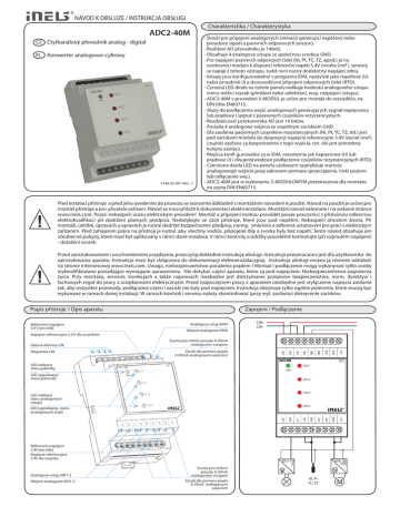 NÁVOD K OBSLUZE / Instrukcja obsługi Charakteristika / Charakterystyka ADC2-40M CZ Čtyřkanálový převodník analog - digital PL Konwerter analogowo-cyfrowy 3148-02-001 Rev.: 1 - Slouží pro připojení analogových snímačů generující napěťový nebo proudový signál a pasivních odporových senzorů. - Rozlišení AD převodníku je 14bitů. - Obsahuje 4 analogové vstupy se společnou svorkou GND. - Pro napájení pasivních odporoých čidel (Ni, Pt, TC, TZ, apod.) je na svorkovnici modulu k dispozici referenční napětí 5.4V (svorka Uref ), senzory se napájí z tohoto výstupu, tudíž není nutný dodatečný napájecí zdroj. - Vstupy jsou konfigurovatelné v programu IDM, nezávislé jako napěťové (U) nebo proudové (I) a dvouvodičové připojení odporových čidel (RTD). - Červená LED dioda na čelním panelu indikuje hodnotu analogového vstupu mimo měřící rozsah (přetížení nebo odlehčení, resp. rozpojení vstupu). - ADC2-40M v provedení 3-MODUL je určen pro montáž do rozvaděče, na DIN lištu EN60715. - Służy do podłączenia wejść analogowych generujących sygnał napięciowy lub prądowy i sygnał z pasywnych czujników rezystancyjnych. - Rozdzielczość przetwornika AD jest 14 bitów. - Posiada 4 analogowe wejścia ze wspólnym zaciskiem GND. - Dla zasilania pasywnych czujników rezystancyjnych (Ni, Pt, TC, TZ, itd.) jest pod zaciskami modułu do dyspozycji napięcie referencyjne 5.4V (zacisk Uref ), czujniki zasilane są bezpośrednio z tego wyjścia, tzn. nie jest potrzebny kolejny zasilacz. - Wejścia konfi gurowalne są w IDM, niezależnie jak napięciowe (U) lub prądowe (I) i dwuprzewodowe podłączenie czujników rezystancyjnych (RTD). - Czerwona dioda LED na panelu czołowym sygnalizuje wartość analogowego wejścia poza zakresem pomiaru (przeciążenie, niski poziom lub odłączenie wej.). - ADC2-40M jest w wykonaniu 3-MODUŁOWYM przeznaczona dla montażu na szynę DIN EN60715. Před instalací přístroje a před jeho uvedením do provozu se seznamte důkladně s montážním návodem k použití. Návod na použití je určen pro montáž přístroje a pro uživatele zařízení. Návod se musí přiložit k dokumentaci elektroinstalace. Montážní návod naleznete i na webové stránce www.inels.com. Pozor, nebezpečí úrazu elektrickým proudem! Montáž a připojení mohou provádět pouze pracovníci s příslušnou odbornou elektrokvalifikací při dodržení platných předpisů. Nedotýkejte se částí přístroje, které jsou pod napětím. Nebezpečí ohrožení života. Při montáži, údržbě, úpravách a opravách je nutné dodržet bezpečnostní předpisy, normy, směrnice a odborná ustanovení pro práci s elektrickým zařízením. Před zahájením práce na přístroji je nutné, aby všechny vodiče, připojené díly a svorky byly bez napětí. Tento návod obsahuje jen všeobecné pokyny, které musí být aplikovány v rámci dané instalace. V rámci kontroly a údržby pravidelně kontrolujte (při vypnutém napájení) - dotažení svorek. Przed zainstalowaniem i uruchomieniem urządzenia, przeczytaj dokładnie instrukcję obsługi. Instrukcja przeznaczona jest dla użytkownika do zainstalowania aparatu. Instrukcja musi być dołączona do dokumentacji elektroinstalacyjnej. Instrukcje obsługi można ją również odnaleźć na stronie internetowej www.inels.com. Uwaga, niebezpieczeństwo porażenia prądem ! Montaż i podłączenie mogą wykonywać tylko osoby wykwalifikowane posiadające wymagane uprawnienia. Nie dotykać części aparatu, które są pod napięciem. Niebezpieczeństwo zagrożenia życia. Przy montażu, serwisie, korekcjach a także naprawach niezbędne jest dotrzymanie przepisów bezpieczeństwa, norm, dyrektyw i fachowych reguł do pracy z urządzeniami elektrycznymi. Przed rozpoczęciem pracy z aparatem niezbędne jest wyłączenie napięcia zasilania tak, aby wszystkie przewody, podłączone części i zaciski nie były pod napięciem. Instrukcja obejmuje tylko ogólne polecenia, które muszą być wykonane w ramach danej instalacji. W ramach kontroli i serwisu należy skontrolować (przy wył. zasilaniu) dokręcenie zacisków. Popis přístroje / Opis aparatu Referenční napájení 5.4 V pro čidla Napięcie referencyjne 5.4 V dla czujników Datová sběrnice CIB Magistrala CIB Zapojení / Podłączenie Analogový vstup AIN4 Wejscie analogowe AIN4 CIB+ CIB - Svorka pro měření proudu 0-20mA analogovým vstupem Zacisk dla pomiaru prądu 0-20mA analogowym wejściem LED indikace stavu jednotky LED sygnalizacja stanu jednostki LED indikace stavu analogových vstupů LED sygnalizacja stanu analogowych wejść Referenční napájení 5.4V pro čidla Napięcie referencyjne 5.4V dla czujnika Analogový vstup AIN1-3 Wejście analogowe AIN1-3 Svorka pro měření proudu 0-20mA analogovým vstupem Zacisk dla pomiaru prądu 0-20mA analogowym wejściem 0(4)-20 mA 0(1)-10 V Ni, Pt TC, TZ Technické parametry / Parametry techniczne Analogové vstupy Počet vstupů: Galv. oddělení od vnitřních obvodů: Diagnostika: Společný vodič: Typ převodníku: Rozlišení převodníku: Vstupní odpor (pro napěťové rozsahy): Typy vstupů / Měřící rozsahy (volitelné pro každý vstup individuálně konfigurací v uživatelském programu IDM): Instalační sběrnice: Indikace stavu jednotky: Napájecí napětí/jm. proud: Připojení Svorkovnice: Pracovní teplota: Skladovací teplota: Stupeň krytí: Kategorie přepětí: Stupeň znečištění: Pracovní poloha: Instalace: Provedení: Rozměry: Hmotnost: 4 Ne Indikace přetížení ve stavovém slově a LED diodou GND aproximační 14 bitů cca 200 kΩ Napěťový (U) : 0 ÷ +10 V (U) 0 ÷ +5 V (U) 0 ÷ +2 V (U) 0 ÷ +1 V (U) 0 ÷ +0.5 V (U) Proudový (I) : 0 ÷ +20 mA (I) 4 ÷ +20 mA (I) Měřicí odpor (RTD) : Ni1000, Pt1000, Pt100 (RTD), OV1000, TC, TZ CIB zelená LED RUN 27 V DC/50 mA, ze sběrnice CIB max. 2.5 mm2/1.5 mm2 s