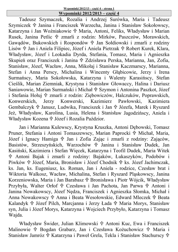 Wypominki 2012/13 – część 4 – strona 1 Wypominki 2012/2013 – część 4 Tadeusz Szymaczek, Rozalia i Andrzej Surówka, Maria i Tadeusz Szymiczek Janina i Franciszek Warzecha, Janina i Stanisław Sokołowscy, Katarzyna i Jan Woźniakowie Maria, Antoni, Feliks, Władysław i Marian Rusek, Janina Petlic zmarli z rodzin: Mirków, Paszczów, Morawskich, Gawądów, Bukowskich i Rospondów Jan Sołdiowski i zmarli z rodziny Lisów Jan i Aniela Filipiec, Józef i Aniela Pietrzak Robert Kurek, Klara, Władysław, Józef i Leokadia Dyrda, Stefania, Tomasz, Maria i Agnieszka Skupień oraz Franciszek i Janina Zdzisława Perska, Marianna, Jan, Zofia, Stanisław, Józef, Wacław, Anna, Mikołaj i Stanisław Kaczmarscy, Marianna, Stefan i Anna Perscy, Michalina i Wincenty Głąbicowie, Jerzy i Irena Surmańscy, Maria Sokołowska, Katarzyna i Walenty Karasińscy, Stefan Cieślik, Marian Ziemniak, Krystyna i Stanisław Głowaccy, Halina i Dariusz Saniawowie, Marian Surmański i Michał Szymon i Antonina Paszkot, Józef i Stefania Hołuj zmarli z rodzin: Ziębowiczów, Halczuków, Poprawskich, Konwerskich, Jerzy Konwerski, Kazimierz Pawłowski, Kazimiera Gembalczyk Janusz, Ludwika, Franciszek i Jan Józefa, Marek i Ryszard Jeż, Władysław, Karolina, Lusia, Helena i Stanisław Jagodzińscy, Aniela i Władysław Kozena Józef i Rozalia Paździor. Jan i Marianna Kulewscy, Krystyna Kruszka, Antoni Dębowski, Tomasz Pruner, Stefania i Antoni Tomaszewscy, Marian Paprocki Michał, Maria, Józef i Ignacy Hamiga Jan i Zofia Zając i zmarli z rodziny: Zająców, Basistów, Strzeszyńskich, Warzochów Janina i Stanisław Dudek, Jan Kasiński, Kazimiera i Stefan Więcek, Katarzyna i Teofil Dudek, Maria Witek Antoni Bajak i zmarli z rodziny: Bajaków, Łukaszyków, Podobów i Piwków Józef, Maria, Bronisław i Józef Chodnik ks. Józef Jachimczak, ks. Jan, ks. Eugeniusz, ks. Roman, Jan i Aniela - rodzice, Czesław brat i Wiktoria Walkosz, Wacław, Michalina, Stefan i Ryszard Pląskowscy, Janina Korzeniowska, Maria i Jan Barabasz Bronisława i Piotr Wójcik, Władysław Przybyła, Walter Orłof Czesława i Jan Pachota, Jan Parwa Antoni i Janina Nowakowscy, Józef Nędza, Franciszek i Agnieszka Słomka, Michał i Anna Nowakowscy Anna i Beata Wesołowskie, Edward Mleczek Beata Kalandyk Józef Pilch, Marcjanna i Jerzy Łada Maria Morys, Stanisław syn, Julia i Józef Morys, Katarzyna i Wojciech Przybyło, Katarzyna i Tomasz Wajda. Władysław Świder, Julian Klimowski Antoni Kuc, Ewa i Franciszek Malinowie Bogdan Grabarz, Jan i Czesława Kożuchowicz Maria i Stanisław Jamróz Katarzyna i Paweł Grela, Tekla i Stanisław Stachurscy Wypominki 2012/13 – część 4 – strona 2 Edward Pal, Antonina i Ludwik Pal i zmarli z rodziny Palów, Antonina i Franciszek Huczek i zmarli z rodziny Huczków, Bolesław Pachel, Józefa i Andrzej Pachel i zmarli z rodziny Pachlów, Rozalia i Józef Młynarczyk i zmarli z rodziny Młynarczyków Maria i Józef Pietraszko, Zenon Kurek, Helena i Leon Siedleczko, Józefa i Władysław Kurek Wiktoria, Rudolf i Józef Jaroszowie Maria i Andrzej Bartosz, Józefa i Józef Cieślak Stanisława i Franciszek Grabowscy, Salomea i Paweł Domanus i zmarli z tych rodzin Franciszek i Zofia Kosibowie, Marek i Jerzy Kosiba, Marianna Wójcikiewicz, Jan Plaskoła Stanisław i Franciszka Podoleccy, Wiktoria, Jan, Stanisława i Fryderyk Podoleccy Józef, Antonina, Henryk i Wiesław Kostur, Leokadia i Józef Kostur, Mariusz i Marta Turoń, Stanisław Lesk, Anna i Antoni Socha. Irena i Kazimierz Kubala-Chytagiński, Marek, Karolina i Piotr Wcisło, Michał Korczyński, Kazimierz Tlarke, Anna i Andrzej Tyrpa Maria i Franciszek Węglarz Jan Stępiński Wiktoria, Józef, Piotr Joniec, Maria, Helena i Stanisław Pajor, Maria, Andrzej i Tadeusz Cikała, Jadwiga, Bolesław, Krystyna i Ireneusz Samborek Anna, Franciszek Czekajscy, Edward Gumola Zofia i Jan Gudyka, Stanisław Wojtas, Alina Trzyna Józef Motor, Stanisław Dybczyk Emilia i Karol Malczyk, Krystyna Kowalyszyn, Stefania i Józef Madoń Wiktoria, Józef, Kazimierz i Tadeusz Klimek, Franciszek Koniarz Mieczysława Kruczek Stanisław Żaba, Henryk, Anna i Antoni Ślazyk, Stanisław, Włodzimierz i Halina Krzysztoń i zmarli z rodzin Żabów, Kowalskich, Dziulrów, Kaflów, Jan Werbiłowicz, Tadeusz Golda, Wiola Krzyżak, Marta Kollar, Siostra Bronisława, ks. Józef Życiński, Kazimierz Śliwiński, Siostry i Księża pracujący w naszej Parafii, Znajomi i Przyjaciele, Sąsiedzi oraz polegli w Katastrofie Smoleńskiej Józef, Maria i Piotr Burdek, Helena, Stanisław, Henryk i Witold Krakowscy Helena i Bolesław Borkowicz, Genowefa i Eugeniusz Pawlak. Władysław i Magdalena Zapała, Józef Wsolak Stefania i Andrzej Adamczyk, Edward syn, Maria i Piotr Klita, Stanisława i Franciszek Łydek, Józefa Wróbel, ks. kanonik Aleksander Windak, Fryderyk Krzanik, Helena Dudziak Stanisława, Władysław, Leszek i Andrzej Łojanowicz, Maria, Bronisław i Mieczysław Szarkowscy, Zofia i Jan Duda; Lidia Zapolnik, Krystyna Gawęcka, Władysława Zbieska Władysław i Katarzyna Trznadel Antoni, Stefania, Danuta Kaczmarczyk, Helena i Michał Świrkowscy Maria i Franciszek Krajnik i zmarli z rodziny Nawalany Sylwester i Jacek Kozioł Emilia Jasińska, Cecylia, Helena i Jan Suchanek, Wiesław Grudzień Kazimiera i Leon Poniewierscy, Maria i Józef Zegar Marianna i Julian Wypominki 2012/13 – część 4 – strona 3 Grodowscy, Józefa i Stefan Radomscy, Krystyna Tabasz, Aniela Wojciechowska Matylda Źrebiec Józef Jończyk Marian i zmarli z rodzin Szymaszków i Podgórskich Stanisław i Stanisława Mech, Anna, Władysław, Stanisław i Kazimierz Sumara Helena, Piotr i Bronisława Wójcik, Jan i Julia Bracha i zmarli z rodziny. Teresa, Władysław, Aniela i Władysław Koperscy, Bolesław, Bronisława i Józef Rzeszowscy, Jan, Marek, Feliks i Helena Dąbrowscy, Maria, Władysław, Piotr i Aleksander Obirek Marcin, Zofia i Antoni Wcisło Jan i Helena Pamuła, Piotr i An