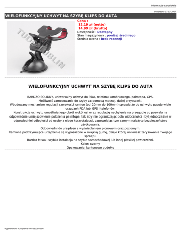Informacje o produkcie Utworzono 07-03-2017 WIELOFUNKCYJNY UCHWYT NA SZYBĘ KLIPS DO AUTA Cena : 12,19 zł (netto) 14,99 zł (brutto) Dostępność : Dostępny Stan magazynowy : poniżej średniego Średnia ocena : brak recenzji WIELOFUNKCYJNY UCHWYT NA SZYBĘ KLIPS DO AUTA BARDZO SOLIDNY, uniwersalny uchwyt do PDA, telefonu komórkowego, palmtopa, GPS. Możliwość zamocowania do szyby za pomocą mocnej, dużej przyssawki. Wbudowany mechanizm regulacji szerokości ramion (od 20mm do 100mm) sprawia że do uchwytu pasuje wiele urządzeń PDA lub GPS i telefonów. Konstrukcja uchwytu umożliwia jego obrót wokół osi oraz regulację nachylenia na przegubie co pozwala na odpowiednie umiejscowienie położenia palmtopa, tak aby nie ograniczając pola widoczności i był jednocześnie w odpowiedniej odległości od osoby z niego korzystającej, zapewniając tym samym należyte bezpieczeństwo użytkowania. Odpowiedni do urządzeń z wyświetlaniem pionowym oraz poziomym. Ramiona podtrzymujące urządzenie są wyposażone w miękką gumę, dzięki której unikniesz zarysowania Twojego sprzętu. Bardzo łatwa i szybka instalacja na szybie samochodowej lub innej płaskiej powierzchni. Kolor: czarny Opakowanie: kartonowe pudełko Wygenerowano w programie www.oscGold.com