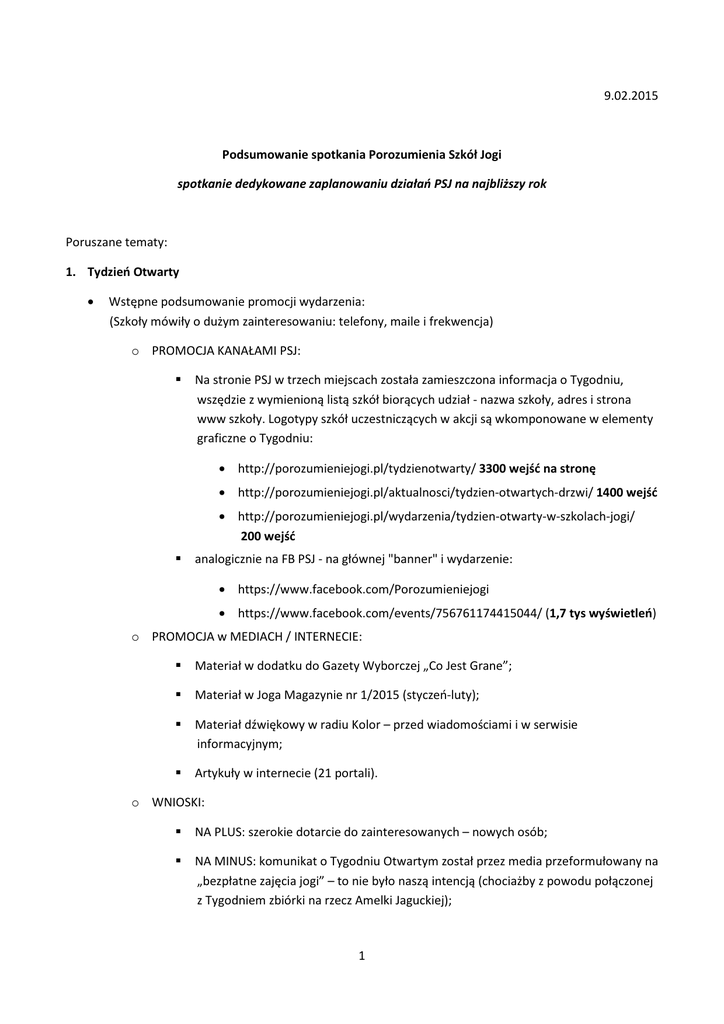 9.02.2015 Podsumowanie spotkania Porozumienia Szkół Jogi spotkanie dedykowane zaplanowaniu działań PSJ na najbliższy rok Poruszane tematy: 1. Tydzień Otwarty • Wstępne podsumowanie promocji wydarzenia: (Szkoły mówiły o dużym zainteresowaniu: telefony, maile i frekwencja) o PROMOCJA KANAŁAMI PSJ: Na stronie PSJ w trzech miejscach została zamieszczona informacja o Tygodniu, wszędzie z wymienioną listą szkół biorących udział - nazwa szkoły, adres i strona www szkoły. Logotypy szkół uczestniczących w akcji są wkomponowane w elementy graficzne o Tygodniu: • http://porozumieniejogi.pl/tydzienotwarty/ 3300 wejść na stronę • http://porozumieniejogi.pl/aktualnosci/tydzien-otwartych-drzwi/ 1400 wejść • http://porozumieniejogi.pl/wydarzenia/tydzien-otwarty-w-szkolach-jogi/ 200 wejść analogicznie na FB PSJ - na głównej "banner" i wydarzenie: • https://www.facebook.com/Porozumieniejogi • https://www.facebook.com/events/756761174415044/ (1,7 tys wyświetleń) o PROMOCJA w MEDIACH / INTERNECIE: Materiał w dodatku do Gazety Wyborczej „Co Jest Grane”; Materiał w Joga Magazynie nr 1/2015 (styczeń-luty); Materiał dźwiękowy w radiu Kolor – przed wiadomościami i w serwisie informacyjnym; Artykuły w internecie (21 portali). o WNIOSKI: NA PLUS: szerokie dotarcie do zainteresowanych – nowych osób; NA MINUS: komunikat o Tygodniu Otwartym został przez media przeformułowany na „bezpłatne zajęcia jogi” – to nie było naszą intencją (chociażby z powodu połączonej z Tygodniem zbiórki na rzecz Amelki Jaguckiej); 1 • Wynagrodzenie dla Ireny Musiałkiewicz za działania promocyjne: zgodnie z założeniami – umowa o dzieło, 500zł netto + podatek 50zł. • Efekty finansowe zbiórki publicznej [aktualizacja z 26.02.2015 r.] – łącznie wszystkie szkoły biorące udział w Tygodniu Otwartym uzbierały 11.950,21 zł. Cała kwota została przelana z konta PSJ na konto Amelki Jaguckiej w Fundacji Dzieciom „Zdążyć z Pomocą”. Cała kwota wpłacona na konto Fundacji trafi do opiekunów Amelki Jaguckiej. 2. PRZYSZŁOŚĆ PSJ • dyskusja - omawiamy propozycję Leszka (zaprezentowaną na poprzednim spotkaniu – 26.02.2015) – główny cel działań to wzmocnienie szkół, by coraz efektywniej funkcjonowały na rynku; • prezentacja i omówienie planu działań PSJ na 2015/2016 r. 3. Kolejne spotkanie robocze PSJ – 2 marca 2015 r. w AYS, ul. Gałczyńskiego 4 w Warszawie. 2
