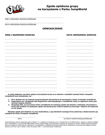 Zgoda opiekuna grupy na korzystanie z Parku JumpWorld