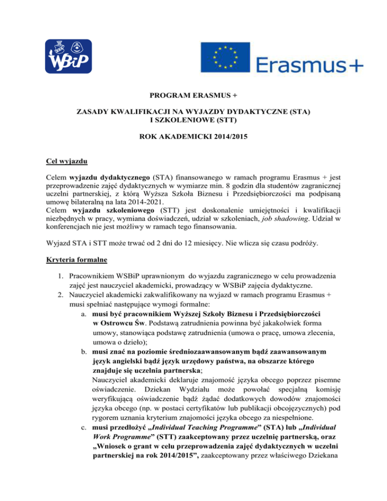 PROGRAM ERASMUS + ZASADY KWALIFIKACJI NA WYJAZDY DYDAKTYCZNE (STA) I SZKOLENIOWE (STT) ROK AKADEMICKI 2014/2015 Cel wyjazdu Celem wyjazdu dydaktycznego (STA) finansowanego w ramach programu Erasmus + jest przeprowadzenie zajęć dydaktycznych w wymiarze min. 8 godzin dla studentów zagranicznej uczelni partnerskiej, z którą Wyższa Szkoła Biznesu i Przedsiębiorczości ma podpisaną umowę bilateralną na lata 2014-2021. Celem wyjazdu szkoleniowego (STT) jest doskonalenie umiejętności i kwalifikacji niezbędnych w pracy, wymiana doświadczeń, udział w szkoleniach, job shadowing. Udział w konferencjach nie jest możliwy w ramach tego finansowania. Wyjazd STA i STT może trwać od 2 dni do 12 miesięcy. Nie wlicza się czasu podróży. Kryteria formalne 1. Pracownikiem WSBiP uprawnionym do wyjazdu zagranicznego w celu prowadzenia zajęć jest nauczyciel akademicki, prowadzący w WSBiP zajęcia dydaktyczne. 2. Nauczyciel akademicki zakwalifikowany na wyjazd w ramach programu Erasmus + musi spełniać następujące wymogi formalne: a. musi być pracownikiem Wyższej Szkoły Biznesu i Przedsiębiorczości w Ostrowcu Św. Podstawą zatrudnienia powinna być jakakolwiek forma umowy, stanowiąca podstawę zatrudnienia (umowa o pracę, umowa zlecenia, umowa o dzieło); b. musi znać na poziomie średniozaawansowanym bądź zaawansowanym język angielski bądź język urzędowy państwa, na obszarze którego znajduje się uczelnia partnerska; Nauczyciel akademicki deklaruje znajomość języka obcego poprzez pisemne oświadczenie. Dziekan Wydziału może powołać specjalną komisję weryfikującą oświadczenie bądź żądać dodatkowych dowodów znajomości języka obcego (np. w postaci certyfikatów lub publikacji obcojęzycznych) pod rygorem uznania kryterium znajomości języka obcego za niespełnione. c. musi przedłożyć „Individual Teaching Programme” (STA) lub „Individual Work Programme” (STT) zaakceptowany przez uczelnię partnerską, oraz „Wniosek o grant w celu przeprowadzenia zajęć dydaktycznych w uczelni partnerskiej na rok 2014/2015”, zaakceptowany przez właściwego Dziekana Wydziału (w przypadku aplikowania przez Dziekana Wydziału wniosek akceptuje Rektor Uczelni) oraz Uczelnianego Koordynatora Programu Erasmus +. Wymagane dokumenty i terminy: Wnioski zgłoszeniowe (formularze STA i STT dostępne na stronie www.wsbip.edu.pl) należy składać u Uczelnianego Koordynatora Programu Erasmus + w terminie wyznaczonym dla danego naboru. Integralną część wniosku stanowi Individual Teaching Programme (STA) lub Individual Work Programme (STT) – formularz dostępny na stronie www.wsbip.edu.pl) ustalony i zatwierdzony w porozumieniu z uczelnią przyjmującą. Program określa zakładane cele, zawartość programu zajęć lub form pracy w ramach STT oraz oczekiwane rezultaty. Wniosek bez załączonego Indywidualnego Programu Nauczania/ Programu Pracy nie może być brany pod uwagę w postępowaniu kwalifikacyjnym Nabór na wyjazdy prowadzony jest w następujących terminach: I nabór – do 5 październia 2014 r. (osoby, które zgłosiły chęć wyjazdu do 30 czerwca 2014 r.) II nabór – do 30 listopada 2014 r. Jeśli uczelnia dysponuje wolnymi środkami po zakończeniu pierwszego naboru, dopuszcza się i nabór uzupełniający. Termin składania wniosków styczeń – luty 2015 roku. Procedura rekrutacji: 1. Kwalifikacja kadry na wyjazdy zagraniczne przeprowadzana jest w ciągu dwóch tygodni od terminu składania wniosków, do wyczerpania środków finansowych przeznaczonych na organizację wyjazdów w roku 2014/2015. 2. Preferencyjnie rozpatrywane są wnioski o wyjazdy zagraniczne pracowników uczelni: a. wchodzących w skład minimum kadrowego na danym kierunku; b. mających udział w zawarciu umowy partnerskiej z uczelnią zagraniczną; c. wykazujących się w pracy aktywnością i prowadzących ponadobowiązkową działalność na rzecz Uczelni (na podstawie opinii Kierownika Katedry lub Dziekana Wydziału); d. starających się o wyjazd zagraniczny po raz pierwszy od momentu zatrudnienia w Uczelni. Zawarcie umowy i wypłata stypendium: 1. Z każdym pracownikiem uczelni zakwalifikowanym na wyjazd w programie Erasmus + zostanie sporządzona pisemna umowa. 2. Przekazanie stypendium może nastąpić tylko pod warunkiem zaakceptowania wszystkich warunków umowy. a. stypendium zostanie wypłacone gotówką w formie zaliczki przed wyjazdem, lub przelewem na podane konto walutowe; b. stypendium jest przeznaczone na pokrycie dodatkowych kosztów związanych z wyjazdem i pobytem na uczelni partnerskiej (zwiększone koszty utrzymania za granicą, koszty podróży, ubezpieczenia). Stypendium nie musi pokrywać pełnych kosztów podróży i pobytu na uczelni partnerskiej. 3. Osoba wyjeżdżająca powinna wystąpić do Narodowego Funduszu Zdrowia o dokument uprawniający do korzystania z opieki zdrowotnej na terytorium UE (Europejską Kartę Ubezpieczenia Zdrowotnego). Każdy wyjeżdżający powinien być ubezpieczony (koszty leczenia i następstwa nieszczęśliwych wypadków) na czas podróży i pobytu w uczelni partnerskiej. Alokacja środków na poszczególne wyjazdy w roku akademickim 2014/2015: 1. wyjazdy w ramach STA i STT – liczba wyjazdów: 9 2. Wysokość stawek wg Komunikatu Narodowej Agencji Programu Erasmus + Zobowiązania stypendysty Programu 1. Warunkiem rozliczenia wyjazdu STA jest przedstawienie oryginału otrzymanego z uczelni przyjmującej pisemnego zaświadczenia o okresie pobytu w tej uczelni wraz z informacją o liczbie przeprowadzonych godzin zajęć dydaktycznych. Zaświadczenie to powinno być sporządzone na papierze firmowych uczelni przyjmującej. W przypadku wyjazdu w ramach STT wymagane jest zaświadczenie o okresie pobytu w instytucji przyjmującej z informacją o rodzaju i charakterze pobytu. 2. Po powrocie z uczelni partnerskiej nauczyciel akademicki sporządza sprawozdanie z wyjazdu (wzór sprawozdania dostępny jest na stronie www.