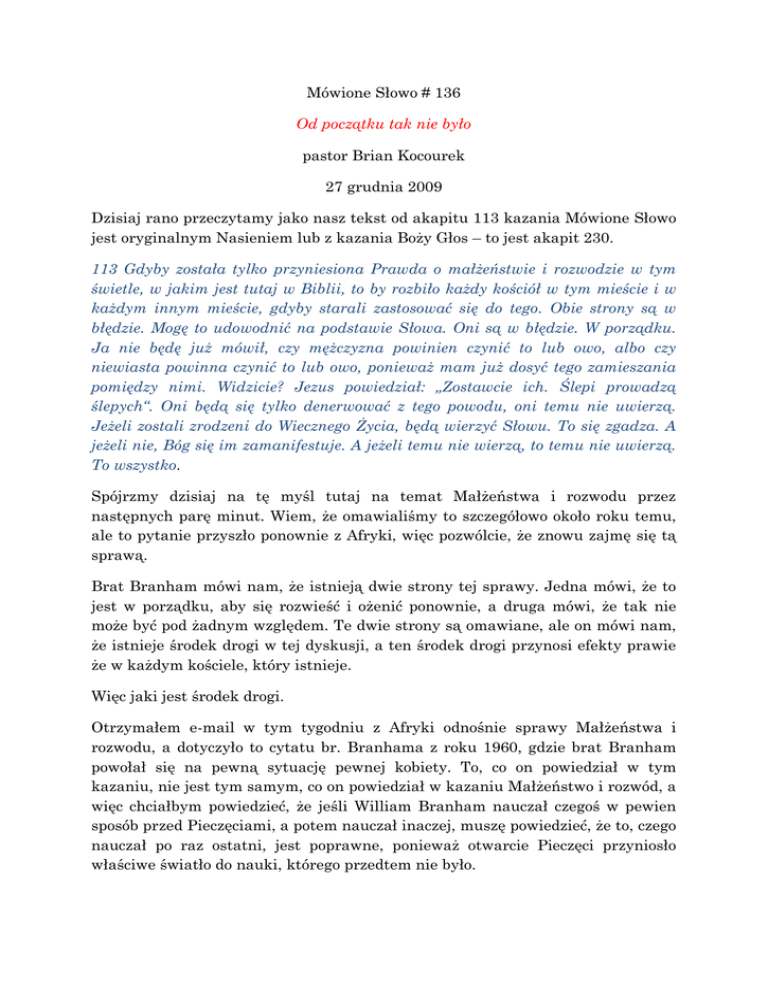 Mówione Słowo # 136 Od początku tak nie było pastor Brian Kocourek 27 grudnia 2009 Dzisiaj rano przeczytamy jako nasz tekst od akapitu 113 kazania Mówione Słowo jest oryginalnym Nasieniem lub z kazania Boży Głos – to jest akapit 230. 113 Gdyby została tylko przyniesiona Prawda o małżeństwie i rozwodzie w tym świetle, w jakim jest tutaj w Biblii, to by rozbiło każdy kościół w tym mieście i w każdym innym mieście, gdyby starali zastosować się do tego. Obie strony są w błędzie. Mogę to udowodnić na podstawie Słowa. Oni są w błędzie. W porządku. Ja nie będę już mówił, czy mężczyzna powinien czynić to lub owo, albo czy niewiasta powinna czynić to lub owo, ponieważ mam już dosyć tego zamieszania pomiędzy nimi. Widzicie? Jezus powiedział: „Zostawcie ich. Ślepi prowadzą ślepych“. Oni będą się tylko denerwować z tego powodu, oni temu nie uwierzą. Jeżeli zostali zrodzeni do Wiecznego Życia, będą wierzyć Słowu. To się zgadza. A jeżeli nie, Bóg się im zamanifestuje. A jeżeli temu nie wierzą, to temu nie uwierzą. To wszystko. Spójrzmy dzisiaj na tę myśl tutaj na temat Małżeństwa i rozwodu przez następnych parę minut. Wiem, że omawialiśmy to szczegółowo około roku temu, ale to pytanie przyszło ponownie z Afryki, więc pozwólcie, że znowu zajmę się tą sprawą. Brat Branham mówi nam, że istnieją dwie strony tej sprawy. Jedna mówi, że to jest w porządku, aby się rozwieść i ożenić ponownie, a druga mówi, że tak nie może być pod żadnym względem. Te dwie strony są omawiane, ale on mówi nam, że istnieje środek drogi w tej dyskusji, a ten środek drogi przynosi efekty prawie że w każdym kościele, który istnieje. Więc jaki jest środek drogi. Otrzymałem e-mail w tym tygodniu z Afryki odnośnie sprawy Małżeństwa i rozwodu, a dotyczyło to cytatu br. Branhama z roku 1960, gdzie brat Branham powołał się na pewną sytuację pewnej kobiety. To, co on powiedział w tym kazaniu, nie jest tym samym, co on powiedział w kazaniu Małżeństwo i rozwód, a więc chciałbym powiedzieć, że jeśli William Branham nauczał czegoś w pewien sposób przed Pieczęciami, a potem nauczał inaczej, muszę powiedzieć, że to, czego nauczał po raz ostatni, jest poprawne, ponieważ otwarcie Pieczęci przyniosło właściwe światło do nauki, którego przedtem nie było. W rzeczywistości, kiedy on pracował nad książką Wieki kościoła z br. Vayle, było parę doktrynalnych spraw, które wyszły na jaw, i ta książka była użyta przez br. Branhama, żeby ustanowić ostatecznie niektóre sprawy, których nie ustalił wcześniej przed napisaniem tej książki. Nie chciałbym wchodzić do tego tak dogłębnie, bo studiowaliśmy to szczegółowo w zeszłym roku, ale oto, co chcę – wejść dzisiejszego poranka do tematu odnośnie Małżeństwa i rozwodu w taki sposób, że jeżeli będziemy tylko czytać nasze Biblie i wierzyć w to, co czytamy, otrzymamy odpowiedzi tak jasne, jak druk w naszych Bibliach. Więc istnieją dwie szkoły myślenia o tej sprawie: jedna wierzy, iż rozwód jest dopuszczalny, a druga wierzy, że nie jest dopuszczalny w żadnych okolicznościach. Prawda tej sprawy jest taka, że jest jedno słowo, którym posłużył się Jezus – która opowiada całkowitą historię i daje jasną odpowiedź. Jednak stwierdzamy, że ten temat jest bardzo ważny, bo 3 ewangeliści nadmienili o tym w swoich pismach. Więc przejdźmy do Biblii, aby zobaczyć, czym jest to Słowo, które mówi nam historię odnośnie Małżeństwa i rozwodu. I weźmy po prostu to Słowo, jak idzie po kolei. Najpierw przeczytajmy z Ew. Mateusza 19:1 A gdy Jezus dokończył tych mów, odszedł z Galilei i przyszedł na pogranicze Judei, po drugiej stronie Jordanu. 2 I szło za nim mnóstwo ludu, a On ich tam uzdrawiał. 3 I przyszli do niego faryzeusze, kusząc go i mówiąc: (słowo peirazo oznacza wypróbować, albo poddać próbie, aby zobaczyć, jak się ostoi w tej trudnej sprawie.) Czy wolno odprawić żonę swoją dla każdej przyczyny? (Widzicie, aby Jezus odpowiedział na to pytanie, postawiło go to w takiej sytuacji wobec ludzi, bo żeby powiedzieć to właściwie, zrani to uczucia wielu ludzi, a skoro istnieją dwa poglądy odnośnie małżeństwa i rozwodu, oni próbowali rozdzielić jego naśladowników na dwie grupy, bo uważali, że będą musieli zająć albo jedną, albo drugą stronę. Ale istnieje jedno słowo, które wyjaśnia całą sprawę. Po prostu jedno słowo.) 4 A On, odpowiadając, rzekł: Czyż nie czytaliście, że Stwórca od początku stworzył mężczyznę i kobietę? (Chcę, żebyście zwrócili uwagę nato, jak Jezus przyprowadza ich prosto na początek, a to jest to jedno słowo, które jest tak ważne, aby zrozumieć tę sprawę, ponieważ pytanie jest takie czy Mojżesz pozwolił na rozwód, a jednak Jezus mówi: Dobrze, jeżeli mamy odpowiedzieć na to poprawnie, powróćmy do podstaw Małżeństwa, powróćmy na początek, i spójrzmy na to, dlaczego zostało ustanowione małżeństwo.) 5 I rzekł: Dlatego opuści człowiek ojca i matkę i połączy się z żoną swoją, i będą ci dwoje jednym ciałem. 6 A tak już nie są dwoje, ale jedno ciało. Co tedy Bóg złączył, człowiek niechaj nie rozłącza. 7 Mówią mu: Czemuż jednak Mojżesz nakazał dać list rozwodowy i odprawić? 8 Rzecze im: Mojżesz pozwolił wam odprawiać swoje żony ze względu na zatwardziałość serc waszych, ale od początku tak nie było. 9 A powiadam wam: Ktokolwiek by odprawił żonę swoją, z wyjątkiem przyczyny wszeteczeństwa, i poślubił inną, cudzołoży, a kto by odprawioną poślubił, cudzołoży. Przeczytajmy teraz z Ewangelii Marka 10:1 I wstał, i udał się stamtąd w granice Judei oraz na drugą stronę Jordanu; i znowu schodziły się rzesze do niego, a On je znowu nauczał, jak to miał w zwyczaju. 2 I przystąpiwszy faryzeusze pytali go, kusząc: Czy wolno mężowi rozw