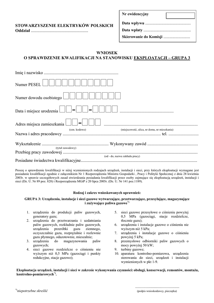 Nr ewidencyjny Data wpływu .............................................. STOWARZYSZENIE ELEKTRYKÓW POLSKICH Oddział ..................................................... Data wpłaty ................................................ Skierowanie do Komisji ........................... WNIOSEK O SPRAWDZENIE KWALIFIKACJI NA STANOWISKU EKSPLOATACJI – GRUPA 3 Imię i nazwisko ..................................................................... Numer PESEL -- - Numer dowodu osobistego Data i miejsce urodzenia .................................................. ....................................................................................... Adres miejsca zamieszkania (ozn. kodowe) (miejscowość, ulica, nr domu, nr mieszkania) Nazwa i adres pracodawcy ........................................................................................... tel. ............................ Wykształcenie .............................................................. Wykonywany zawód ............................................... (tytuł zawodowy) Przebieg pracy zawodowej ............................................................................................................................. (od - do, nazwa zakładu pracy) Posiadane świadectwa kwalifikacyjne............................................................................................................ Proszę o sprawdzenie kwalifikacji w niżej wymienionych rodzajach urządzeń, instalacji i sieci, przy których eksploatacji wymagane jest posiadanie kwalifikacji zgodnie z załącznikiem Nr 1 Rozporządzenia Ministra Gospodarki , Pracy i Polityki Społecznej z dnia 28 kwietnia 2003r. w sprawie szczegółowych zasad stwierdzania posiadania kwalifikacji przez osoby zajmujące się eksploatacją urządzeń, instalacji i sieci (Dz. U. Nr 89 poz. 828) i Rozporządzenia MGiP z 20 lipca 2005r. (Dz. U. Nr 141 poz.1189). Rodzaj i zakres wnioskowanych uprawnień: GRUPA 3: Urządzenia, instalacje i sieci gazowe wytwarzające, przetwarzające, przesyłające, magazynujące i zużywające paliwa gazowe*) 1. 2. 3. 4. urządzenia do produkcji paliw gazowych, generatory gazu; urządzenia do przetwarzania i uzdatniania paliw gazowych, rozkładnie paliw gazowych, urządzenia przeróbki gazu ziemnego, oczyszczalnie gazu, rozprężalnie i rozlewnie gazu płynnego, odazotownie, mieszalnie; urządzenia do magazynowania paliw gazowych; sieci gazowe rozdzielcze o ciśnieniu nie wyższym niż 0,5 MPa (gazociągi i punkty redukcyjne, stacje gazowe); 5. sieci gazowe przesyłowe o ciśnieniu powyżej 0,5 MPa (gazociągi, stacje rozdzielcze, tłocznie gazu); 6. urządzenia i instalacje gazowe o ciśnieniu nie wyższym niż 5 kPa; 7. urządzenia i instalacje gazowe o ciśnieniu powyżej 5 kPa; 8. przemysłowe odbiorniki paliw gazowych o mocy powyżej 50 kW; 9. turbiny gazowe; 10. aparatura kontrolno-pomiarowa, urządzenia sterowania do sieci, urządzeń i instalacji wymienionych w pkt 1-9. Eksploatacja urządzeń, instalacji i sieci w zakresie wykonywania czynności: obsługi, konserwacji, remontów, montażu, kontrolno-pomiarowych*). *) niepotrzebne skreślić ................................................. (podpis wnioskodawcy, pieczątka) ............................................, dnia .......................... ............................................ (pieczęć Komisji Kwalifikacyjnej) PROTOKÓŁ NR ................................................. z egzaminu sprawdzającego znajomość przepisów i zasad w zakresie eksploatacji na stanowisku EKSPLOATACJI ............................................................................................................................ (imię i nazwisko egzaminowanego) 1. Wynik egzaminu ze znajomości przepisów i zasad: Lp. Wyszczególnienie zakresu 1. 2. Zasady budowy, działania oraz warunki techniczne obsługi urządzeń, instalacji i sieci Zasady eksploatacji oraz instrukcje eksploatacji urządzeń, instalacji i sieci 3. Zasady i warunki wykonywania prac kontrolno-pomiarowych i montażowych 4. Zasady i wymagania bezpieczeństwa pracy i ochrony przeciwpożarowej oraz umiejętności udzielania pierwszej pomocy Instrukcje postępowania w razie awarii, pożaru lub innego zagrożenia bezpieczeństwa obsługi urządzeń lub zagrożenia życia, zdrowia i środowiska 5. Wynik 2. Wynik ogólny egzaminu: pozytywny – negatywny*) 3. W wyniku egzaminu stwierdzono, że egzaminowany spełnia (nie spełnia)*) wymagania kwalifikacyjne do wykonywania prac na stanowisku Eksploatacji w zakresie: obsługi, konserwacji, remontów, montażu, kontrolno-pomiarowym*) dla następujących rodzajów urządzeń, instalacji i sieci wymienionych we wniosku pod pozycją: .................................................................................................................................................................. .................................................................................................................................................................. .................................................................................................................................................................. .................................................................................................................................................................. ………………………………………………………………………………………………………….. 4. Wydano świadectwo nr ............................................ 5. Uprawnienia są ważne do ......................................... 6. Sprawdzono tożsamość: PESEL Dowód osobisty: ....................................................... Wynik egzaminu przyjąłem do wiadomości .............................................. (podpis egzaminowanego) *) niepotrzebne skreślić Członkowie Zespołu Egzaminacyjnego Przewodniczący Zespołu Egzaminacyjnego