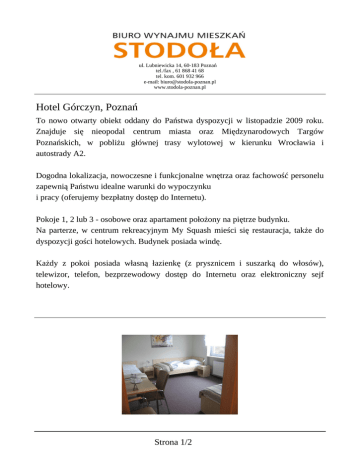 ul. Lubniewicka 14, 60-183 Poznań tel./fax , 61 868 41 68 tel. kom. 601 932 966 e-mail: [email protected] www.stodola-poznan.pl Hotel Górczyn, Poznań To nowo otwarty obiekt oddany do Państwa dyspozycji w listopadzie 2009 roku. Znajduje się nieopodal centrum miasta oraz Międzynarodowych Targów Poznańskich, w pobliżu głównej trasy wylotowej w kierunku Wrocławia i autostrady A2. Dogodna lokalizacja, nowoczesne i funkcjonalne wnętrza oraz fachowość personelu zapewnią Państwu idealne warunki do wypoczynku i pracy (oferujemy bezpłatny dostęp do Internetu). Pokoje 1, 2 lub 3 - osobowe oraz apartament położony na piętrze budynku. Na parterze, w centrum rekreacyjnym My Squash mieści się restauracja, także do dyspozycji gości hotelowych. Budynek posiada windę. Każdy z pokoi posiada własną łazienkę (z prysznicem i suszarką do włosów), telewizor, telefon, bezprzewodowy dostęp do Internetu oraz elektroniczny sejf hotelowy. Strona 1/2 Hotel Górczyn, Poznań Strona 2/2
