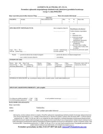 JANSSEN-CILAG POLSKA SP. Z O. O. Formularz zgłoszenia niepożądanego działania/wady jakościowej produktu leczniczego wersja 3 z dnia 09/02/2015 Imię i nazwisko pracownika Janssen-Cilag: __________________________ Data otrzymania informacji: ________________ - POUFNE Data urodzenia/wiek Inicjały PACJENT: Płeć: K M □ □ data wystąpienia objawów OPIS OBJAWÓW NIEPOŻĄDANYCH: Klasyfikacja (o ile dotyczy) Ciężkie działanie niepożądane .................................. □ – zgon □ – zagrożenie życia □ – trwałe lub znaczące inwalidztwo lub upośledzenie sprawności □ – hospitalizacja lub jej przedłużenie □ – inne, które lekarz według swojego stanu wiedzy uzna za ciężkie Leczenie ambulatoryjne □ Nr statystyczny przyczyny zgonu Leczenie szpitalne □ .................................................... Ciąża - Tak □ Nie □ Jeśli tak – tydzień ciąży .......... Wynik: Masa ciała – powrót do zdrowia bez trwałych następstw – powrót do zdrowia z trwałymi następstwami – jest w trakcie leczenia objawów – niewiadomy STOSOWANE LEKI Nazwa leku (lek firmy Lek Janssen-Cilag i inne leki podejrzany stosowane jednocześnie) zaznacz „P” Dawka dobowa Droga podania Data rozpoczęcia podawania Data zakończenia podawania Przyczyna użycia lub nr statystyczny choroby 1. 2. 3. INFORMACJE DODATKOWE: np. wcześniejsze reakcje na lek, czynniki ryzyka, wyniki badań dodatkowych OPIS WADY JAKOŚCIOWEJ PRODUKTU, jeśli wystąpiła: Czy dołączono próbkę produktu? □ TAK Czy lek był podany pacjentowi? □ TAK □ NIE □ NIE nr serii produktu leczniczego: .............................................. DANE OSOBY ZGŁASZAJĄCEJ: Imię i nazwisko: Adres: Telefon/fax: e-mail: data i podpis (pieczątka lekarza): ___________________________________ Informujemy, że dane osobowe zebrane w związku z Pana/Pani zgłoszeniem niepożądanego działania produktu leczniczego, będą przetwarzane przez Janssen-Cilag Polska Sp. z o.o. z siedzibą w Warszawie przy ul. Iłżeckiej 24, zgodnie z ustawą z dnia 29 sierpnia 1997 r. o ochronie danych osobowych (Dz. U. z 2002 r. Nr 101, poz. 926, ze zm.) wyłącznie do celów związanych z realizacją obowiązku monitorowania bezpieczeństwa produktów leczniczych. Każdej osobie przysługuje prawo dostępu do treści swoich danych oraz ich poprawiania. Podanie danych osobowych przez osoby zobowiązane do dokonywania zgłoszeń niepożądanych działań produktów leczniczych jest obowiązkowe i wynika z przepisów ustawy z dnia 6 września 2001 r. Prawo farmaceutyczne (Dz. U. z 2008 r. Nr 45, poz. 271 ze zm.) oraz innych przepisów prawa. W przypadku pozostałych osób podanie danych osobowych jest dobrowolne, ale niezbędne do przyjęcia zgłoszenia Formularz przesyłamy na faks: 0-22 237 6037 lub mail: [email protected]