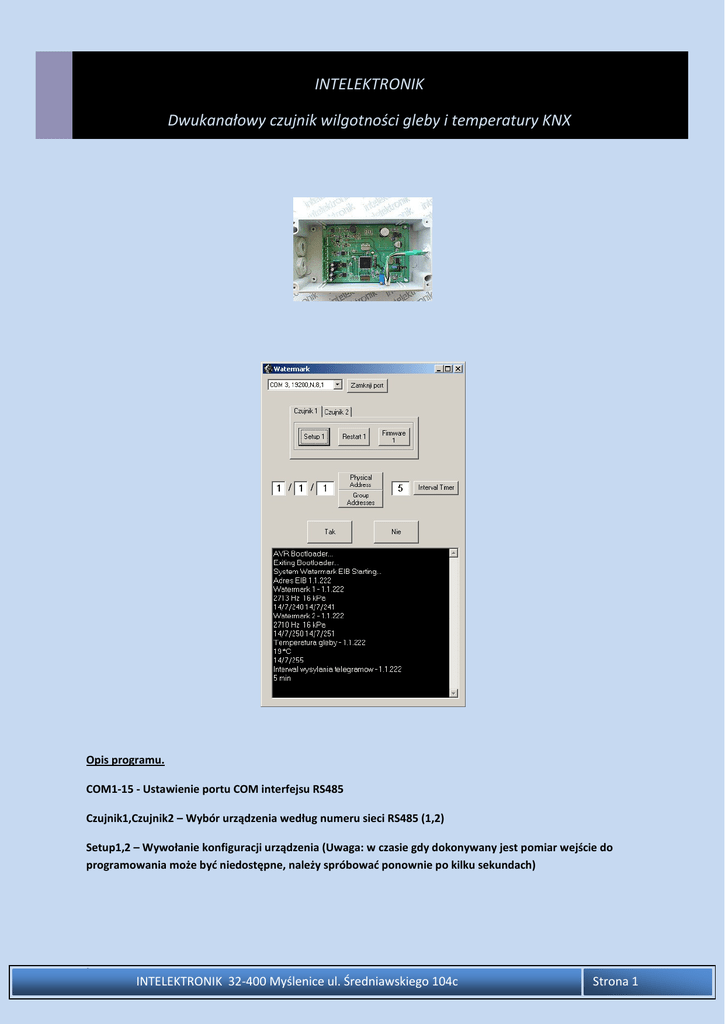 INTELEKTRONIK Dwukanałowy czujnik wilgotności gleby i temperatury KNX Opis programu. COM1-15 - Ustawienie portu COM interfejsu RS485 Czujnik1,Czujnik2 – Wybór urządzenia według numeru sieci RS485 (1,2) Setup1,2 – Wywołanie konfiguracji urządzenia (Uwaga: w czasie gdy dokonywany jest pomiar wejście do programowania może byd niedostępne, należy spróbowad ponownie po kilku sekundach) I INTELEKTRONIK 32-400 Myślenice ul. Średniawskiego 104c Strona 1 Restart1,2 – Restart urządzenia (1,2). Po restarcie jednorazowo wyświetlane są parametry i ustawienia urządzenia Firmware1,2 – Wgrywanie nowej wersji oprogramowania 1/1/1 – Okno zapisu adresu psychicznego urządzenia lub adresu grupowego KNX 5 – Okno zapisu interwału wysyłania telegramów (1-250 minut) Tak – Potwierdzenie zapisu parametrów po podaniu parametru Nie – Brak potwierdzenia zapisu parametru (przejście do następnej pozycji ustawieo) Programowanie. Uwaga: Po wejściu do ustawieo należy przejśd wszystkie parametry do RESTART (stosując przycisk NIE można nie podawad parametrów i przechodzid do kolejnych ustawieo). Na ekranie pojawiają się komunikaty o ustawianych parametrach. 1. 2. 3. 4. 5. 6. 7. Uruchomid program i wybrad port COM Setup1 – nacisnąd TAK Wpisad adres psychiczny urządzenia i nacisnąd PHYSICAL ADDRESS, potwierdzid TAK Wpisad adres grupowy i nacisnąd GROUP ADRESSES, potwierdzid TAK Wpisad kolejne adresy grupowe Podad interwał wysyłania telegramów w minutach, nacisnąd INTERVAL TIMER, potwierdzid TAK Restart – TAK Parametry do programowania. 1.Adres urządzenia 2. Ciśnienie sondy I w Pascalach - 2 byte EIS5 3. Status wilgotności sondy I - 01 (mokra) 02 (średnia) 03 (sucha) 1 byte EIS6 4. Awaria sondy I - 1bit EIS1 5. Ciśnienie sondy II w Pascalach - 2 byte EIS5 6. Status wilgotności sondy II - 01 (mokra) 02 (średnia) 03 (sucha) 1 byte EIS6 7. Awaria sondy II - 1bit EIS1 8. Temperatura gleby , jeśli urządzenie jest pod ziemią (zalecane) 2 byte EIS5.Zalecane jest umieszczenie urządzenia pod ziemią aby kompensowad pomiar sond zależnie od temperatury gleby 9. Awaria sondy I,II - EIS15 String np."!W2:1.11.1" czyli sonda II urządzenie o adresie 1.11.1 10.Interwał wysyłania telegramów 1-250 minut I INTELEKTRONIK 32-400 Myślenice ul. Średniawskiego 104c Strona 2 Czujnik wilgotności WaterMark Opis instalowania Czujniki wilgotności gleby Watermark zawsze przed zainstalowaniem powinny zostad przygotowane do użytku. Dlatego należy na noc pozostawid je w wodzie, i następnie zupełnie wysuszyd. Proces ten powinien zostad powtórzony dwa razy. Przed instalacją czujników w glebie muszą byd one w każdym razie całkowicie wilgotne, tzn: należy je przed instalacją znowu na kilka godzin namoczyd w wodzie. Dobrze przygotowane do użytku czujniki Watermark już od początku szybko reagują na zmieniające się warunki wilgotnościowe w glebie. Gdyby czujniki zostały nie przygotowane do użytku, ale były nasycone wodą, wtedy ich reakcja na zmieniające sie warunki wilgotnościowe w glebie będzie zauważalna dopiero po kilku dniach. Na początku należy wybrad miejsce pomiaru. Powinno byd ono reprezentatywne dla całej powierzchni przebiegu wilgotności gleby. Brzegi albo inne nietypowe miejsca pola nie brane są pod uwagę. Następnie rośliny w bezpośrednim sąsiedztwie miejsca pomiaru powinne wygląd przeciętnie, a więc byd nie za słabe i nie za silne. Do zainstalowania trzeba wywiercid otwór na odpowiednią głębokośd (średnica 25 do 30 mm). Do tego nadaje się np: laska do pobierania prób glebowych. Na koniec z pobranego materiału glebowego i wody sporządza się gęstą papkę, i małą jej porcję (ok. 0,1 litra) wlewa się do otworu glebowego. Następnie za pomocą cienkiego pręta czujnik należy wcisnąd do wywierconego otworu na odpowiednią głębokośd. Ważne jest przy tym aby czujnik miał dobry kontakt z glebą, a więc był całkowicie zalany papką. I INTELEKTRONIK 32-400 Myślenice ul. Średniawskiego 104c Strona 3 Na koniec otwór nad czujnikiem należy całkowicie zalad pozostałą papką z gleby. Poza tym utarło się już w praktyce, aby drut do Watermark Monitor zakopad w glebie na głębokośd około 10 cm, aby ochronid go przed uszkodzeniem podczas prac polowych oraz przed gryzoniami. Ułatwienie montażu zapewni zastosowanie rur instalacyjnych. Podłączenie : Opis zacisków (od lewej) + - plus magistrali KNX/EIB – - minus magistrali KNX/EIB A - sygnał A sieci RS485 B - sygnał B sieci RS485 RS – masa W2 – czujnik II wilgotności gleby W1 – czujnik I wilgotności gleby Uwagi: Czujniki zainstalowad zgodnie z załączoną instrukcją obsługi. Przepusty kablowe (dławki) należy po podłączeniu zabezpieczyd USZCZELNIACZEM SILIKONOWYM -50 °C do 180 °C (zalecany parametr wydłużenia przy zerwaniu 700%). Dodatkowo przed zakręceniem obudowy lekko posmarowad uszczelki gumowe. UWAGA! W przypadku zdjęcia wtyczek z zabezpieczonych złącz serwisowych urządzenie przestanie poprawnie pracowad do momentu naprawy urządzenia. Intelektronik Watermark KNX Wersja 1.1 (2012-06) I INTELEKTRONIK 32-400 Myślenice ul. Średniawskiego 104c Strona 4