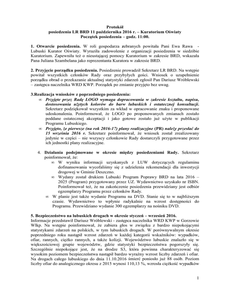 Protokół posiedzenia LR BRD 11 października 2016 r. – Kuratorium Oświaty Początek posiedzenia – godz. 11:00. 1. Otwarcie posiedzenia. W roli gospodarza zebranych powitała Pani Ewa Rawa Lubuski Kurator Oświaty. Wyraziła zadowolenie z organizacji posiedzenia w siedzibie Kuratorium. Zapewniła też o nieustającej pomocy Kuratorium w zakresie BRD, wskazała Pana Juliana Szambelana jako reprezentanta Kuratora w zakresie BRD. 2. Przyjęcie porządku posiedzenia. Posiedzenie prowadził Sekretarz LR BRD. Na wstępie powitał wszystkich członków Rady oraz przybyłych gości. Wniosek o uzupełnienie porządku obrad o przekazanie aktualnej statystyki zdarzeń zgłosił Pan Dariusz Wróblewski – zastępca naczelnika WRD KWP. Porządek po zmianie przyjęto bez uwag. 3.Realizacja wniosków z poprzedniego posiedzenia: • Przyjęte przez Radę LOGO wymaga dopracowania w zakresie kształtu, napisu, dostosowania użytych kolorów do barw lubuskich i ostatecznej konsultacji. Sekretarz podziękował wszystkim za wkład w opracowanie znaku i proponowane udoskonalenia. Poinformował, że LOGO po proponowanych zmianach zostało poddane ostatecznej akceptacji i jako gotowe zostało już użyte w publikacji Programu Lubuskiego. • Przyjęto, że pierwsze (na rok 2016-17) plany realizacyjne (PR) należy przesłać do 15 września 2016 r. Sekretarz poinformował, że wniosek został zrealizowany jedynie w części – nie wszyscy członkowie Rady dostarczyli przygotowane przez ich jednostki plany realizacyjne. 4. Działania podejmowane w okresie między posiedzeniami Rady. Sekretarz poinformował, że: • W wyniku informacji uzyskanych z LUW dotyczących regulaminu dofinansowania wycofaliśmy się z udzielenia rekomendacji dla inwestycji drogowej w Gminie Deszczno. • Wydany został drukiem Lubuski Program Poprawy BRD na lata 2016 – 2025 (Program) przygotowany przez UZ. Wydawnictwo uzyskało nr ISBN. Poinformował też, że na zakończenie posiedzenia przewidziany jest odbiór egzemplarzy Programu przez członków Rady. • W planie jest także wydanie Programu na DVD. Stanie się to w najbliższym czasie. Wydawnictwo to wpłynie radykalnie na wzrost dostępności do Programu. Przewidziano wydanie 300 egzemplarzy na nośniku DVD. 5. Bezpieczeństwo na lubuskich drogach w okresie styczeń – wrzesień 2016. Informacje przedstawił Dariusz Wróblewski - zastępca naczelnika WRD KWP w Gorzowie Wlkp. Na wstępie poinformował, że zabiera głos w związku z bardzo niepokojącymi statystykami zdarzeń na polskich, w tym lubuskich drogach. W porównywalnym okresie poprzedniego roku nastąpił wzrost zdarzeń w każdej kategorii wskaźników: wypadków, ofiar, rannych, ciężko rannych, a także kolizji. Województwo lubuskie znalazło się w większościowej grupie województw, gdzie statystyki bezpieczeństwa pogorszyły się. Szczególnie niepokojące jest, że na drodze S3, która powinna charakteryzować się wysokim poziomem bezpieczeństwa nastąpił bardzo wyraźny wzrost liczby zdarzeń i ofiar. Na drogach całego lubuskiego do dnia 11.10.2016 śmierć poniosło już 88 osób. Poziom liczby ofiar do analogicznego okresu z 2015 wynosi 110,13 %, wzrosła ciężkość wypadków 1 wyrażana liczbą ofiar na 100 wypadków. Obecnie lubuski wskaźnik jest najwyższy w kraju. Najwięcej ofiar odnotowuje się na DK. Aż 78 % ofiar jest wynikiem zdarzeń poza terenem zabudowanym. Wzrosła kumulacja zdarzeń i ofiar w dwóch największych miastach województwa. W połowie zdarzeń winę ponoszą piesi, w drugiej kierujący. Podobnie jest ze zdarzeniami z rowerzystami. Połowa jest z winy rowerzystów, pozostałe z winy kierujących innymi pojazdami. Zaobserwowano niepoprawne zachowania rowerzystów polegające na gwałtownym wjeżdżaniu pod nadjeżdżające pojazdy. Problemem narastającym jest brak oświetlenia i odblasków tak u rowerzystów, jak i pieszych. Odnotowano wyraźną zmianę przyczyn zdarzeń. Wcześniej dominowała prędkość, obecnie główne przyczyny to nieprawidłowe wyprzedzanie i nadmierna prędkość. Spadek bezpieczeństwa na drogach dał się zauważyć już na początku roku. W związku z tym została podjęta decyzja o zwiększeniu dozoru policyjnego w miejscach, gdzie często dochodzi do zdarzeń. Dotyczy to terenu całego garnizonu. 6. Wdrożenie Programu Realizacyjnego na lata 2016 - 2017. Sekretarz Rady przypomniał, że w życie wchodzi Lubuski Program Poprawy BRD na lata 2016 – 2025. Program Realizacyjny na lata 2016 – 2017 jest pierwszym etapem realizacji Programu. Oba te dokumenty są jedynymi kompleksowymi materiałami określającymi plany lubuskich działań BRD przygotowanych przez wszystkich członków Rady. Przypomniał, że wcześniejszy Gambit 2005-2015 nigdy nie doczekał się programów realizacyjnych, stąd też jego wykonanie było przypadkowe, a ocena realizacji opisana przez autorów z UZ w Lubuskim Programie jest negatywna. Ponieważ nie wszyscy członkowie Rady przygotowali programy realizacyjne, Sekretarz podkreślił, że nie można powtórzyć błędu, aby z tej samej przyczyny obecny Program podzielił los poprzedniego. Nie można zostawić tak istotnej dziedziny przypadkowi. Sekretarz podziękował tym członkom Rady, którzy przygotowali swoje programy realizacyjne. Tymi członkami Rady są: • Generalna Dyrekcja Dróg Krajowych i Autostrad • Kuratorium Oświaty • Policja • Straż Graniczna • Uniwersytet Zielonogórski • Zarząd Dróg Wojewódzkich • Wojewódzki Ośrodek Ruchu Drogowego Gorzów Wlkp. • Wojewódzki Ośrodek Ruchu Drogowego Zielona Góra. Otrzymane od ww. członków Rady materiały cząstkowe do Programu Realizacyjnego na 2016 – 2017 zostały przesłane do wszystkich członków Rady w celu zapoznania się z nimi. Sekretarz przypomniał, że Rada powołana jest między innymi po to, żeby wskazywać najlepsze kierunki działań. Celem Programu jest systemowa, planowa poprawa BRD uwzględniająca pomoc społe