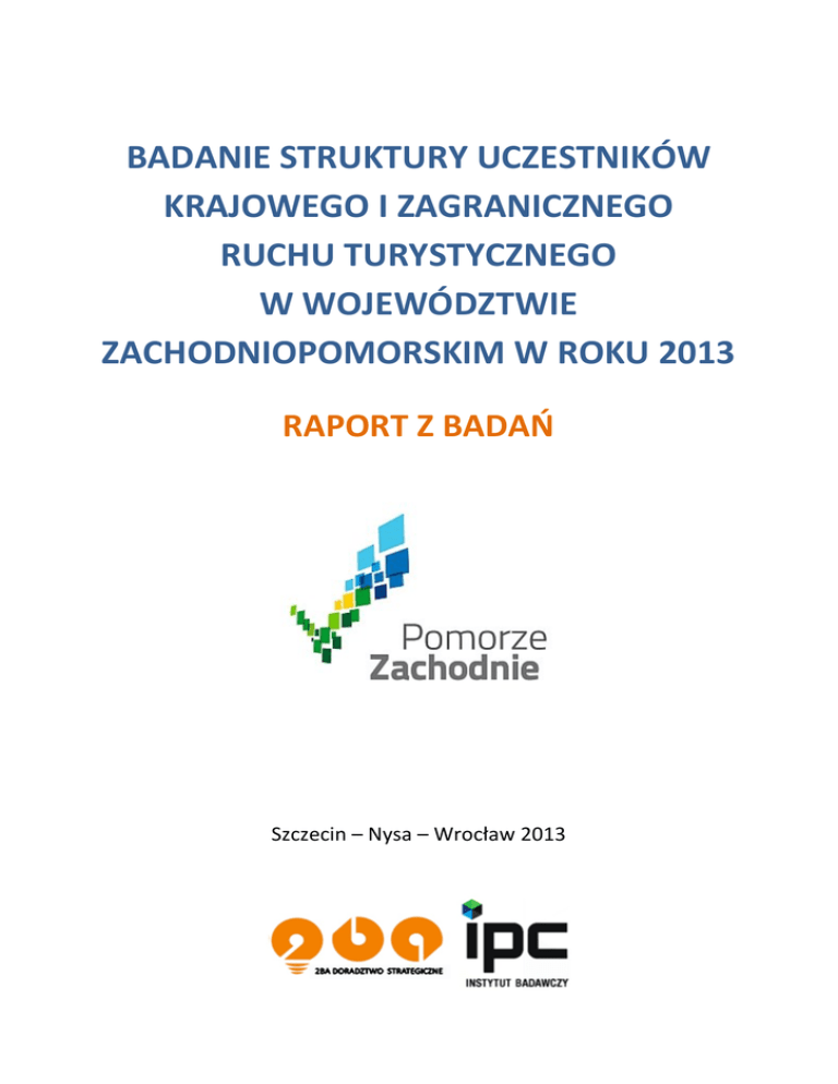 BADANIE STRUKTURY UCZESTNIKÓW KRAJOWEGO I ZAGRANICZNEGO RUCHU TURYSTYCZNEGO W WOJEWÓDZTWIE ZACHODNIOPOMORSKIM W ROKU 2013 RAPORT Z BADAŃ Szczecin – Nysa – Wrocław 2013 ©2013 2BA doradztwo strategiczne i Instytut Badawczy IPC Sp. z o.o. „Badanie struktury uczestników krajowego i zagranicznego ruchu turystycznego w Województwie Zachodniopomorskim w roku 2013 wraz z opracowaniem raportu z badań” opracowywał zespół ekspertów konsorcjum 2BA doradztwo strategiczne i Instytut Badawczy IPC Sp. z o.o. w składzie: Artur Kotliński – kierownik projektu badawczego, dyrektor zarządzający Instytutu Badawczego IPC Sp. z o.o., Agnieszka Nowak – zastępca kierownika projektu badawczego, dyrektor zarządzający 2BA doradztwo strategiczne, Jarosław Sawicki – specjalista ds. badań jakościowych i ilościowych, dyrektor ds. badań Instytutu Badawczego IPC Sp. z o.o., Leszek Nowak – specjalista ds. badań jakościowych, dyrektor zarządzający 2BA doradztwo strategiczne, dr Marcin Zieliński – ekspert 2BA doradztwo strategiczne, dr Marcin Haberla – ekspert Instytutu Badawczego IPC Sp. z o.o., Leszek Piechocki – specjalista ds. badań 2BA doradztwo strategiczne, Anna Gabory – specjalista ds. badań Instytutu Badawczego IPC Sp. z o.o., Żaneta Rosiak – manager ds. badań Instytutu Badawczego IPC Sp. z o.o. Redakcja merytoryczna Raportu : Agnieszka Nowak 2BA doradztwo strategiczne 2BA doradztwo strategiczne Podzamcze B10/17 48–300 Nysa Tel.: 77 551 17 14 Instytut Badawczy IPC Sp. z o.o. ul. A. Ostrowskiego 30 53–38 Wrocław Tel.: 71 79 49 249 -2- Spis treści Spis treści ......................................................................................................................................................... 3 Wprowadzenie ................................................................................................................................................. 6 I. Metodologiczne założenia badania .......................................................................................................... 8 1. Metodologiczne założenia badania .................................................................................................. 8 2. Przedmiot i cele badania ................................................................................................................. 9 3. Zakres podmiotowy i przestrzenny badania .................................................................................. 11 4. Metody i techniki badacze ............................................................................................................. 15 5. Metoda doboru próby ................................................................................................................... 16 5.1 Metoda doboru próby w badaniu PAPI.......................................................................................... 17 5.2 Metoda doboru próby w badaniach IDI, TDI, EWS oraz panel ekspertów ...................................... 21 5.3 Metoda doboru próby w badaniu „Mystery Client” („Tajemniczy Klient”) .................................... 22 5.4 Metoda doboru próby w badaniu CATI .......................................................................................... 22 6. Realizacja badania ......................................................................................................................... 23 II. Wielkość i rozkład ruchu turystycznego w Województwie Zachodniopomorskim ................................... 26 1. Wielkość i rozkład ruchu turystycznego ......................................................................................... 26 1.1. Wielkość ruchu turystycznego ....................................................................................................... 26 1.2. Rozkład sezonowy ruchu turystycznego ........................................................................................ 29 1.3. Rozkład przestrzenny ruchu turystycznego .................................................................................... 32 2. Ruch turystyczny w Województwie Zachodniopomorskim na tle ruchu turystycznego w Polsce ... 36 3. Baza noclegowa Województwa Zachodniopomorskiego ............................................................... 41 III. Uczestnicy krajowego i zagranicznego ruchu turystycznego (wyniki badania PAPI) ........................... 44 1. Charakterystyka uczestnika ruchu turystycznego w Województwie Zachodniopomorskim ........... 45 1.1. Cechy demograficzne i społeczne uczestników krajowego i zagranicznego ruchu turystycznego, w tym sylwetka badanych w życiu prywatnym .............................................................................. 45 1.1.1. Uczestnicy krajowego ruchu .......................................................................................................... 45 1.1.2. Uczestnicy zagranicznego ruchu .................................................................................................... 49 1.2. Cele przyjazdów do Województwa Zachodniopomorskiego .......................................................... 53 1.2.1. Uczestnicy krajowego ruchu .......................................................................................................... 53 1.2.2. Uczestnicy zagranicznego ruchu .................................................................................................... 54 2. Preferencje uczestników ruchu turystycznego ............................................................................... 54 2.1. Preferowany sposób organizacji przyjazdu .................................................................................... 54 2.1.1. Uczestnicy krajowego ruchu .......................................................................................................... 55 2.1.2. Uczestnicy zagranicznego ruchu ...................................................................................................