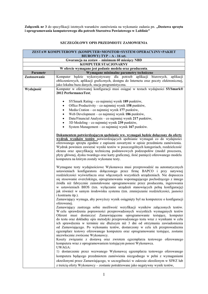 Załącznik nr 3 do specyfikacji istotnych warunków zamówienia na wykonanie zadania pn. „Dostawa sprzętu i oprogramowania komputerowego dla potrzeb Starostwa Powiatowego w Lublinie” SZCZEGÓŁOWY OPIS PRZEDMIOTU ZAMOWIENIA ZESTAW KOMPUTEROWY (KOMPUTER+MONITOR+SYSTEM OPERACYJNY+PAKIET BIUROWY) TYP – A - 16 szt. Gwarancja na zestaw – minimum 60 miesięcy NBD KOMPUTER STACJONARNY W ofercie wymagane jest podanie modelu oraz producenta. Parametr Wymagane minimalne parametry techniczne Komputer będzie wykorzystywany dla potrzeb aplikacji biurowych, aplikacji Zastosowanie obliczeniowych, aplikacji graficznych, dostępu do Internetu oraz poczty elektronicznej, jako lokalna baza danych, stacja programistyczna. Komputer w oferowanej konfiguracji musi osiągać w testach wydajności SYSmark® Wydajność 2012 PerformanceTest; SYSmark Rating – co najmniej wynik 189 punktów, Office Productivity – co najmniej wynik 158 punktów, Media Cration – co najmniej wynik 177 punktów, Web Development – co najmniej wynik 186 punktów, Data/Financial Analysis – co najmniej wynik 217 punktów, 3D Modeling – co najmniej wynik 239 punktów, System Management – co najmniej wynik 167 punktów. Dokumentem potwierdzającym spełnianie ww. wymagań będzie dołączony do oferty wydruk wyników testów potwierdzających spełnianie wymagań co do wydajności oferowanego sprzętu zgodnie z zapisami zawartymi w opisie przedmiotu zamówienia. Wydruk powinien zawierać wyniki testów w poszczególnych kategoriach, rozdzielczość ekranu oraz specyfikację techniczną podstawowych podzespołów (model procesora, płyty głównej, dysku twardego oraz karty graficznej, ilość pamięci) oferowanego modelu komputera na którym zostały wykonane testy. Wymagane testy wydajnościowe Wykonawca musi przeprowadzić na automatycznych ustawieniach konfiguratora dołączonego przez firmę BAPCO i przy natywnej rozdzielczości wyświetlacza oraz włączonych wszystkich urządzeniach. Nie dopuszcza się stosowanie overclokingu, oprogramowania wspomagającego pochodzącego z innego źródła niż fabrycznie zainstalowane oprogramowanie przez producenta, ingerowania w ustawieniach BIOS (tzn. wyłączanie urządzeń stanowiących pełną konfigurację) jak również w samym środowisku systemu (tzn. zmniejszanie rozdzielczości, jasności i kontrastu itp.). Zamawiający wymaga, aby powyższy wynik osiągnięty był na komputerze o konfiguracji oferowanej. Zamawiający zastrzega sobie możliwość weryfikacji wyników załączonych testów. W celu sprawdzenia poprawności przeprowadzonych wszystkich wymaganych testów Oferent musi dostarczyć Zamawiającemu oprogramowanie testujące, komputer do testu oraz dokładny opis metodyki przeprowadzonego testu wraz z wynikami w celu ich sprawdzenia w terminie nie dłuższym niż 3 dni od otrzymania zawiadomienia od Zamawiającego. Po wykonaniu testów, dostarczony w celu ich przeprowadzenia egzemplarz testowy oferowanego komputera oraz oprogramowanie testujące, zostanie niezwłocznie zwrócone Wykonawcy. Koszty związanie z dostawą oraz zwrotem egzemplarza testowego oferowanego komputera wraz z oprogramowaniem testującym ponosi Wykonawca. UWAGA: 1) dostarczenie przez wezwanego Wykonawcę egzemplarza testowego oferowanego komputera będącego przedmiotem zamówienia niezgodnego w pełni z wymaganiami określonymi przez Zamawiającego, w szczególności w zakresie określonym w SIWZ lub z treścią oferty Wykonawcy – zostanie potraktowane jako negatywny wynik testów, 1 Procesor Pamięć operacyjna RAM Pojemność pamięci masowej Grafika Wyposażenie multimedialne Obudowa 2) niedostarczenie przez wezwanego Wykonawcę egzemplarza testowego oferowanego komputera będącego przedmiotem zamówienia w terminie 3 dni roboczych od daty przekazania Wykonawcy ww. wezwania – zostanie potraktowane jako negatywny wynik testów, 3) negatywny wynik przeprowadzonych testów, które nie potwierdzą, że oferowane przez Wykonawcę dostawy odpowiadają wymaganiom określonym przez Zamawiającego w SIWZ w szczególności nie potwierdzą pełnej zgodności wszystkich wymogów oferowanych komputerów wyspecyfikowanych w SIWZ, a także poprawnej współpracy oferowanych komputerów ze sprzętem oraz oprogramowaniem eksploatowanym przez Zamawiającego lub wystąpienie którejkolwiek z okoliczności, o których mowa w pkt. 1 lub 2, skutkować będzie odrzuceniem oferty takiego Wykonawcy, na podstawie art. 89 ust. 1 pkt. 2 ustawy, jako niezgodnej z treścią SIWZ. Procesor wielordzeniowy ze zintegrowaną grafiką, osiągający w teście Passmark CPU Mark wynik nie gorszy niż 7230 punktów, według wyników ze strony http://www.cpubenchmark.net. Do oferty należy załączyć wydruk ze strony potwierdzający ww. wynik (w języku angielskim bez tłumaczenia na język polski). W ofercie wymagane podanie producenta i modelu procesora. Co najmniej 4 GB (1x4096MB), taktowanie minimum 1600 MHz, możliwość rozbudowy do co najmniej 16GB. Minimum jeden slot wolny. Min. 500 GB SATA 7200 obr./min. Grafika zintegrowana z procesorem powinna umożliwiać pracę dwumonitorową ze wsparciem DirectX 11.1, OpenGL 4.0, OpenCL 1.2; pamięć współdzielona z pamięcią RAM, dynamicznie przydzielana do min. 1,7GB, obsługująca rozdzielczości: 3840x2160 @ 60Hz (cyfrowo), 2560x1600 @ 60Hz (cyfrowo), 4096x2304 @ 24Hz (cyfrowo), 1920x1200 @ 60Hz (analogowo i cyfrowo), 1920x1080 @ 60Hz (cyfrowo). Oferowana karta graficzna musi osiągać w teście PassMark Performance Test co najmniej wynik 719 punktów w G3D Rating, wynik dostępny na stronie: http://www.videocardbenchmark.net/gpu_list.php. Do oferty należy załączyć wydruk ze strony potwierdzający ww. wynik (w języku angielskim bez tłumaczenia na język polski). Min 24-bitowa karta dźwiękowa zintegrowana z płytą główną, zgodna z High Definition, wewnętrzny głośnik o mocy minimum 2W w obudowie komputera. Porty słuchawek i mikrofonu na przednim oraz