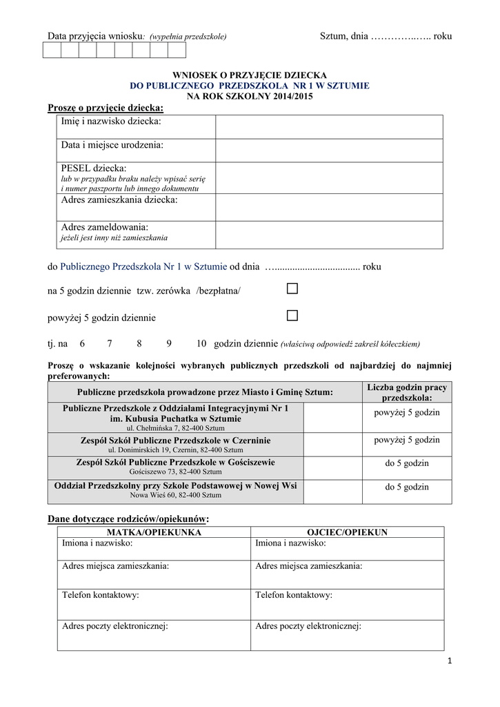 Data przyjęcia wniosku: (wypełnia przedszkole) Sztum, dnia …………..….. roku WNIOSEK O PRZYJĘCIE DZIECKA DO PUBLICZNEGO PRZEDSZKOLA NR 1 W SZTUMIE NA ROK SZKOLNY 2014/2015 Proszę o przyjęcie dziecka: Imię i nazwisko dziecka: Data i miejsce urodzenia: PESEL dziecka: lub w przypadku braku należy wpisać serię i numer paszportu lub innego dokumentu Adres zamieszkania dziecka: Adres zameldowania: jeżeli jest inny niż zamieszkania do Publicznego Przedszkola Nr 1 w Sztumie od dnia ….................................. roku □ □ na 5 godzin dziennie tzw. zerówka /bezpłatna/ powyżej 5 godzin dziennie tj. na 6 7 8 9 10 godzin dziennie (właściwą odpowiedź zakreśl kółeczkiem) Proszę o wskazanie kolejności wybranych publicznych przedszkoli od najbardziej do najmniej preferowanych: Liczba godzin pracy Publiczne przedszkola prowadzone przez Miasto i Gminę Sztum: przedszkola: Publiczne Przedszkole z Oddziałami Integracyjnymi Nr 1 powyżej 5 godzin im. Kubusia Puchatka w Sztumie ul. Chełmińska 7, 82-400 Sztum Zespół Szkół Publiczne Przedszkole w Czerninie powyżej 5 godzin ul. Donimirskich 19, Czernin, 82-400 Sztum Zespół Szkół Publiczne Przedszkole w Gościszewie Gościszewo 73, 82-400 Sztum Oddział Przedszkolny przy Szkole Podstawowej w Nowej Wsi Nowa Wieś 60, 82-400 Sztum do 5 godzin do 5 godzin Dane dotyczące rodziców/opiekunów: MATKA/OPIEKUNKA Imiona i nazwisko: OJCIEC/OPIEKUN Imiona i nazwisko: Adres miejsca zamieszkania: Adres miejsca zamieszkania: Telefon kontaktowy: Telefon kontaktowy: Adres poczty elektronicznej: Adres poczty elektronicznej: 1 KRYTERIA PRZYJĘĆ (w przypadku spełniania danego kryterium proszę postawić znak „X”) Kryteria obowiązkowe (art. 20c ust. 2 ustawy z dnia 7 września 1991 r. o systemie oświaty (tekst jednolity: Dz. U. z 2004 r. nr 256 poz. 2572 późn. zm.) 1. Wielodzietność rodziny kandydata załącznik: oświadczenie o wielodzietności rodziny kandydata. 2. Niepełnosprawność kandydata załącznik: orzeczenie o potrzebie kształcenia specjalnego wydane ze względu na niepełnosprawność, orzeczenie o niepełnosprawności lub o stopniu niepełnosprawności lub orzeczenie równoważne w rozumieniu przepisów ustawy z dnia 27 sierpnia 1997 r .o rehabilitacji zawodowej i społecznej oraz zatrudnianiu osób niepełnosprawnych (Dz. U. z 2011 r. nr 127, poz. 721 z późn. zm.). 3. Niepełnosprawność jednego z rodziców kandydata załącznik: orzeczenie o potrzebie kształcenia specjalnego wydane ze względu na niepełnosprawność, orzeczenie o niepełnosprawności lub o stopniu niepełnosprawności lub orzeczenie równoważne w rozumieniu przepisów ustawy z dnia 27 sierpnia 1997 r .o rehabilitacji zawodowej i społecznej oraz zatrudnianiu osób niepełnosprawnych (Dz. U. z 2011 r. nr 127, poz. 721 z późn. zm.). 4. Niepełnosprawność obojga rodziców kandydata załącznik: orzeczenie o potrzebie kształcenia specjalnego wydane ze względu na niepełnosprawność, orzeczenie o niepełnosprawności lub o stopniu niepełnosprawności lub orzeczenie równoważne w rozumieniu przepisów ustawy z dnia 27 sierpnia 1997 r .o rehabilitacji zawodowej i społecznej oraz zatrudnianiu osób niepełnosprawnych (Dz. U. z 2011 r. nr 127, poz. 721 z późn. zm.). 5. Niepełnosprawność rodzeństwa kandydata załącznik: orzeczenie o potrzebie kształcenia specjalnego wydane ze względu na niepełnosprawność, orzeczenie o niepełnosprawności lub o stopniu niepełnosprawności lub orzeczenie równoważne w rozumieniu przepisów ustawy z dnia 27 sierpnia 1997 r .o rehabilitacji zawodowej i społecznej oraz zatrudnianiu osób niepełnosprawnych (Dz. U. z 2011 r. nr 127, poz. 721 z późn. zm.). 6. Samotne wychowywanie kandydata w rodzinie załącznik: prawomocny wyrok sądu rodzinnego orzekający rozwód lub separację lub akt zgonu oraz oświadczenie o samotnym wychowywaniu dziecka oraz niewychowywaniu żadnego dziecka wspólnie z jego rodzicem). 7. Objęcie kandydata pieczą zastępczą załącznik: dokument potwierdzający objęcie dziecka pieczą zastępczą zgodnie z ustawą z dnia 9 czerwca 2011 r. o wspieraniu rodziny i systemie pieczy zastępczej (Dz.U. z 2013 r. poz.135 z późn. zm.). Kryteria dodatkowe: 1. Dziecko pięcioletnie (ur. w 2009 r.) oraz dziecko sześcioletnie (ur. w II 2. połowie 2008 r.) ubiegające się o przyjęcie do przedszkola lub oddziału przedszkolnego w szkole podstawowej Oboje rodzice pracujący albo rodzic samotnie wychowujący dziecko pracujący: załącznik: oświadczenie o zatrudnieniu lub o gospodarczej/gospodarstwa rolnego) prowadzeniu działalności 3. Jeden z rodziców pracujący: 4. załącznik: oświadczenie o zatrudnieniu lub o prowadzeniu działalności gospodarczej/gospodarstwa rolnego) Rodzeństwo dziecka uczęszczające do Publicznego Przedszkola Nr 1 w Sztumie 1. 2. (podać imię i nazwisko dziecka) 5. Deklarowany czas pobytu w przedszkolu dłuższy niż realizacja podstawy programowej (powyżej 5 godz.) 2 Do karty należy dołączyć wymagane załączniki potwierdzające spełnianie kryteriów. 1. Oświadczam, iż dane w niniejszej karcie są zgodne ze stanem faktycznym. 2. Zobowiązuję się do informowania dyrektora przedszkola o każdorazowej zmianie powyższych danych. 3. Wyrażam zgodę na przetwarzanie danych osobowych zawartych we wniosku do celów rekrutacji, oraz celów związanych z realizacją przez Przedszkole zadań statutowych, zgodnie z ustawą o ochronie danych osobowych z dnia 29 sierpnia 1997 r. (Dz. U. z 2002 r. nr 101, poz. 926 ze zm.). ................................................................. (podpis rodzica/opiekuna prawnego) DECYZJA KOMISJI REKRUTACYJNEJ: (wypełnia komisja rekrutacyjna) 1. Komisja Rekrutacyjna powołana Zarządzeniem Nr ………. Dyrektora Publicznego Przedszkola Nr 1 w Sztumie z dnia ………………….. roku w sprawie powołania komisji rekrutacyjnej po rozpatrzeniu wniosku na posiedzeniu w dniu ......................