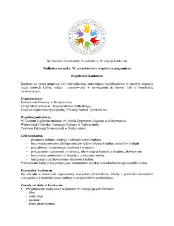 Serdecznie zapraszamy do udziału w IV edycji konkursu Podlaska mozaika. W poszukiwaniu wspólnoty pogranicza Regulamin konkursu Konkurs na pracę grupową lub indywidualną, pokazującą współistnienie w naszym regionie ludzi różnych kultur, religii i narodowości w nawiązaniu do historii lub w kontekście teraźniejszym. Organizatorzy Kuratorium Oświaty w Białymstoku Urząd Marszałkowski Województwa Podlaskiego Poseł na Sejm Rzeczypospolitej Polskiej Robert Tyszkiewicz Współorganizatorzy VI Liceum Ogólnokształcące im. Króla Zygmunta Augusta w Białymstoku Wojewódzki Ośrodek Animacji Kultury w Białymstoku Centrum Edukacji Nauczycieli w Białymstoku Cele konkursu − poznanie kultury, tradycji i obrzędowości regionu − budowanie postawy dialogu między ludźmi różnych kultur, narodów i religii − pogłębianie wzajemnego zaufania i sympatii − poszerzanie wzajemnej otwartości, ułatwiającej kontakt z drugim człowiekiem − budowanie gotowości do kontaktu z nieznaną osobą − integracja z zachowaniem odrębności kultur. Preferowane będą prace pokazujące różnorodne aspekty wielokulturowego współistnienia. Uczestnicy konkursu Do udziału w konkursie zapraszamy wszystkie przedszkola, szkoły i placówki oświatowe oraz gminne i miejskie domy kultury z województwa podlaskiego. Zasady udziału w konkursie 1. Przyjmowane będą prace wykonane w następujących formach: - film - wideoklip - spektakl - praca przestrzenna - praca plastyczna - fotoreportaż - tekst – reportaż, wywiad, opowiadanie, wiersz. 2. Prace powstałe w ramach konkursu muszą być, przed ich wysłaniem na konkurs, zaprezentowane w szkole; preferowane będą prace zaprezentowane w środowisku lokalnym – w przestrzeni osiedla, wsi, miasta, instytucji lub w Internecie – na publicznie dostępnej stronie internetowej czy portalu. 3. Do każdej pracy należy dołączyć jej metryczkę (wg wzoru) oraz dokumentację dotyczącą prezentacji pracy w środowisku lokalnym (krótki opis, zdjęcia, w przypadku strony internetowej – print screen strony); nadesłanie prac jest równoznaczne z wyrażeniem zgody na ich wykorzystanie przez organizatorów konkursu w celach związanych z tematyką konkursu oraz na wykorzystanie danych osobowych autorów prac do celów związanych z przeprowadzeniem konkursu. Metryczkę pracy należy dodatkowo przesłać w wersji elektronicznej na adres [email protected] , wpisując w temacie nazwę szkoły (placówki). 4. Prace powinny dotyczyć działań realizowanych w latach 2013/2014 i 2014/2015 i nienagrodzonych we wcześniejszych edycjach konkursu. 5. Konkurs trwa do końca marca 2015 r. 6. Nieprzekraczalny termin nadsyłania prac: 10 kwietnia 2015 r.; prace, które wpłyną po tym terminie, nie będą uwzględnione. 7. Prace należy nadsyłać na adres: VI Liceum Ogólnokształcące im. Króla Zygmunta Augusta w Białymstoku ul. Warszawska 8 15-063 Białystok z dopiskiem: „praca konkursowa” 8. Prace oceni komisja konkursowa, w skład której będą wchodzić osoby wskazane przez organizatorów. 9. Dla autorów najlepszych prac gwarantujemy atrakcyjne nagrody indywidualne i zespołowe. 10. Organizatorzy zastrzegają sobie prawo wykorzystania prac konkursowych, w tym prac nagrodzonych i wyróżnionych, do promocji idei konkursu. Po ogłoszeniu wyników konkursu autorzy pozostałych prac mogą je odebrać nie później niż 25 czerwca 2015 r. Po tym terminie o przeznaczeniu nieodebranych prac zdecydują organizatorzy. Załącznik do regulaminu konkursu „Podlaska mozaika. W poszukiwaniu wspólnoty pogranicza” Metryczka pracy konkursowej (proszę uzupełnić drukowanymi literami) Tytuł pracy: Imię i nazwisko autora (imiona i nazwiska autorów): Klasa: Imię i nazwisko nauczyciela (opiekuna): Krótki opis pracy (w wypadku filmu także czas jego trwania): Dane adresowe szkoły: pełna nazwa szkoły (łącznie z patronem szkoły): miejscowość: kod pocztowy: nazwa ulicy i numer: numer telefonu: Imię i nazwisko dyrektora szkoły: Oświadczenia rodzica (prawnego opiekuna) ucznia lub pełnoletniego ucznia – autora pracy: Wyrażam zgodę na wykorzystanie mojej pracy* / pracy mojego dziecka**, złożonej na konkurs „PODLASKA MOZAIKA. W POSZUKIWANIU WSPÓLNOTY POGRANICZA”, przez organizatorów konkursu w celach związanych z jego tematyką. Wyrażam zgodę na wykorzystanie moich danych osobowych* / danych osobowych mojego dziecka** w celach związanych z organizacją konkursu. * dotyczy osoby pełnoletniej; ** dotyczy rodziców (prawnych opiekunów) osoby niepełnoletniej ………………………………………………………. czytelny podpis rodzica (prawnego opiekuna) ucznia lub pełnoletniego ucznia