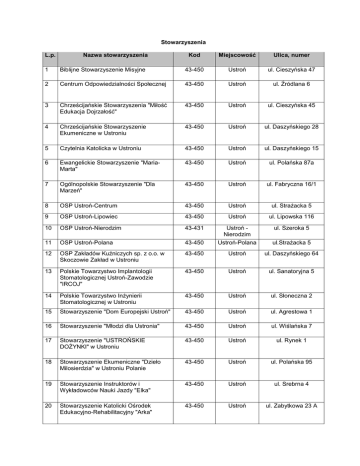 Stowarzyszenia L.p. Nazwa stowarzyszenia Kod Miejscowość Ulica, numer 1 Biblijne Stowarzyszenie Misyjne 43-450 Ustroń ul. Cieszyńska 47 2 Centrum Odpowiedzialności Społecznej 43-450 Ustroń ul. Źródlana 6 3 Chrześcijańskie Stowarzyszenia "Miłość Edukacja Dojrzałość" 43-450 Ustroń ul. Cieszyńska 45 4 Chrześcijańskie Stowarzyszenie Ekumeniczne w Ustroniu 43-450 Ustroń ul. Daszyńskiego 28 5 Czytelnia Katolicka w Ustroniu 43-450 Ustroń ul. Daszyńskiego 15 6 Ewangelickie Stowarzyszenie "MariaMarta" 43-450 Ustroń ul. Polańska 87a 7 Ogólnopolskie Stowarzyszenie "Dla Marzeń" 43-450 Ustroń ul. Fabryczna 16/1 8 OSP Ustroń-Centrum 43-450 Ustroń ul. Strażacka 5 9 OSP Ustroń-Lipowiec 43-450 Ustroń ul. Lipowska 116 10 OSP Ustroń-Nierodzim 43-431 ul. Szeroka 5 11 OSP Ustroń-Polana 43-450 Ustroń Nierodzim Ustroń-Polana ul.Strażacka 5 12 OSP Zakładów Kuźniczych sp. z o.o. w Skoczowie Zakład w Ustroniu 43-450 Ustroń ul. Daszyńskiego 64 13 Polskie Towarzystwo Implantologii Stomatologicznej Ustroń-Zawodzie "IRCOJ" 43-450 Ustroń ul. Sanatoryjna 5 14 Polskie Towarzystwo Inżynierii Stomatologicznej w Ustroniu 43-450 Ustroń ul. Słoneczna 2 15 Stowarzyszenie "Dom Europejski Ustroń" 43-450 Ustroń ul. Agrestowa 1 16 Stowarzyszenie "Młodzi dla Ustronia" 43-450 Ustroń ul. Wiślańska 7 17 Stowarzyszenie "USTROŃSKIE DOŻYNKI" w Ustroniu 43-450 Ustroń ul. Rynek 1 18 Stowarzyszenie Ekumeniczne "Dzieło Milosierdzia" w Ustroniu Polanie 43-450 Ustroń ul. Polańska 95 19 Stowarzyszenie Instruktorów i Wykładowców Nauki Jazdy "Elka" 43-450 Ustroń ul. Srebrna 4 20 Stowarzyszenie Katolicki Ośrodek Edukacyjno-Rehabilitacyjny "Arka" 43-450 Ustroń ul. Zabytkowa 23 A 21 Stowarzyszenie Kierowców i Sympatyków Radio-Taxi Zdrój 43-450 Ustroń ul. Daszyńskiego 43 22 Stowarzyszenie Krzewienia Idei Sebastiana Kneippa 43-450 Ustroń ul. Zdrojowa 5 23 Stowarzyszenie Kulturalne "RÓWNICA" 43-450 Ustroń ul. Partyzantów 2 a 24 Stowarzyszenie Miłośników Kultury Ludowej "Czantoria" 43-450 Ustroń ul. Daszyńskiego 28 25 Stowarzyszenie Miłośników Wypoczynku Pod Skalicą - Mała Wisełka w Ustroniu 43-450 Ustroń ul. Nadrzeczna 19 26 Stowarzyszenie Na Rzecz Dzieci i Rodzin "Ponad Granicami" 43-450 Ustroń ul. Dominikańska 14 27 Stowarzyszenie Parafialny Chór "AVE" 43-450 Ustroń ul. Daszyńskiego 15 28 Stowarzyszenie Pomocy Dzieciom i Rodzinie "Można Inaczej" 43-450 Ustroń ul. Wantuły 47 29 Stowarzyszenie Pomocy Śląskiemu Centrum Rehabilitacji w Ustroniu "SZPITAL Z SERCEM" 43-450 Ustroń ul. Zdrojowa 6 30 Stowarzyszenie Promocji i Rozwoju Ustronia Stowarzyszenie Przyjaciół Zwierząt "AS" Animals Security 43-450 Ustroń ul. Rynek 2 43-450 Ustroń ul. Rynek 4 32 Stowarzyszenie Silesia Folk & Country 43-450 Ustroń ul. Daszyńskiego 28 33 Stowarzyszenie Twórcze "BRZIMY" 43-450 Ustroń Rynek 1 34 Stowarzyszenie Gromada Górali Na Śląsku Cieszyńskim Stowarzyszenie Miłośników Kuźni Ustronia Tow. Wsp.Starań o Przyznanie Org. Igrzysk Olimpijskich w 2006 r. RP 43-450 Ustroń ul. Hutnicza 3 43-450 Ustroń ul. Hutnicza 3 43-450 Ustroń Rynek 1 37 Towarzystwo "Tęczowy Ogród" 43-450 Ustroń ul. Strażacka 2 38 Towarzystwo Kontaktów Zagranicznych 43-450 Ustroń Rynek 1 39 Towarzystwo Kształcenia Artystycznego 43-450 Ustroń Rynek 1 40 Towarzystwo Miłośników Ustronia 43-450 Ustroń ul. Rynek 3A 41 Towarzystwo Opieki nad Niepełnosprawnymi 43-450 Ustroń Rynek 1 31 35 36 40 Towarzystwo Upiększania Miasta 43-450 Ustroń Rynek 1 41 Towarzystwo Wędkarskie "Ustroń" 43-450 Ustroń ul. Sportowa 21 42 Ustrońskie Stowarzyszenie "Szansa" 43-450 Ustroń ul. Stroma 6 43 Ustrońskie Stowarzyszenie Trzeźwości Klub Abstynenta "RODZINA" w Ustroniu 43-450 Ustroń ul. Słoneczna 9 Kod Miejscowość Ulica, numer Oddziały i Koła stowarzyszeń L.p. Nazwa stowarzyszenia 1 Ogólnokrajowe Stowarzyszenie Kombatantów Polskich Sił Zbrojnych na Zachodzie Oddział Regionalny w Ustroniu 43-450 Ustroń ul. Konopnickiej 32/9 2 Pol. Tow. Balneologii, Bioklimatologii i Med. Fizykalnej - Oddz. 43-450 Ustroń ul. Mickiewicza 2 3 Polski Klub Ekologiczny - Koło w Ustroniu Polski Komitet Pomocy Społecznej Oddział Polski Związek Byłych Więźniów Politycznych Hitlerowskich Więzień i Obozów Koncentracyjncyh - Koło w Ustroniu 43-450 Ustroń Rynek 1 43-450 Ustroń ul. Cieszyńska 6 43-450 Ustroń ul. Daszyńskiego 28 6 Polski Związek Hodowców Gołębi Pocztowych - Oddział Cieszyn 43-450 Ustroń ul. Szeroka 83 7 Polski Związek Wędkarski - Koło UstrońWisła 43-450 Ustroń ul. Wiślańska 1 8 Polskie Towarzystwo Reumatologiczne 43-450 Ustroń ul. Szpitalna 11 9 Polskie Towarzystwo Techników Dentystycznych - Oddział 43-450 Ustroń ul. Słoneczna 2 10 Stowarzyszenie Kombatantów Polskich Sił Zbrojnych na Zachodzie - Koło Rejonowe w Ustroniu 43-450 Ustroń ul. Konopnickiej 32/9 4 5 11 Towarzystwo Społeczno-Kulturalne Niemieców Województwa Śląskiego Zarząd Oddziału Ustroń 43-450 Ustroń ul. 9 listopada 18 12 Związek Inwalidów Wojennych - Oddział Ustroń 43-450 Ustroń ul. Daszyńskiego 28 Kod Miejscowość Ulica, numer Stowarzyszenia Zwykłe L.p. Nazwa stowarzyszenia 1 Klub AWS 43-450 Ustroń ul. Daszyńskiego 28 2 Stowarzyszenie "Zielona Inicjatywa" 43-450 Ustroń ul. Dębowa 6 Stowarzyszenia i Związki Sportowe L.p. Nazwa stowarzyszenia Kod Miejscowość Ulica, numer 1 Klub Sportowy "Kuźnia" 43-450 Ustroń ul. Sportowa 5 2 Klub Sportowy "Nierodzim" w Ustroniu 43-450 Ustroń ul. Kreta 2 3 Ludowy Klub Sportowy "Równica" 43-431 4 Międzyszklony Klub Sportowy Ustroń 43-450 UstrońNierodzim Ustroń ul. Daszyńskiego 31 5 Polski Otwarty Związek Stowarzyszeń Sportu Psich Zaprzęgów 43-450 Ustroń ul. Graniczna 5 6 Stowarzyszenie Rekreacyjno-Sportowe "Czantoria" Ustroń 43-450 Ustroń ul. 3 Maja 130 7 Towarzystwo Narciarskie "Marabu-Ski Club" Towarzystwo Rekreacyjno-Sportowe "Siła" 43-450 Ustroń ul.3 Maja 49 43-450 Ustroń Rynek 1/2 9 Ustroński Klub Sportowy "BUSTERS