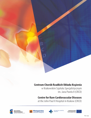 Centrum Chorób Rzadkich Układu Krążenia w Krakowskim Szpitalu Specjalistycznym im. Jana Pawła II (CRCD) Centre for Rare Cardiovascular Diseases at the John Paul II Hospital in Krakow (CRCD) 2015 Centre for Rare Cardiovascular Diseases at the John Paul II Hospital in Krakow, Poland Redaktorzy/ Editors Grzegorz Kopeć, Marcin Waligóra, Dominika Gryszówka, Piotr Podolec Projekt/ Project Piotr Sera n Druk/ Print Fabryka Magika s.c. Drugie wydanie/ Second edition Projekt Współ nansowany przez Unię Europejską w ramach Małopolskiego Regionalnego Programu Operacyjnego na lata 2007-2013 Project co- nanced by the European Regional Development Fund under the Małopolska Regional Operational Programme for 2007-2013 CRCD - Centrum Chorób Rzadkich Układu Krążenia/ Centre for Rare Cardiovascular Diseases Spis treści Table of Contents 1. Choroby rzadkie układu krążenia – de nicja i klasy kacja. Cele i zadania Centrum Chorób Rzadkich Układu Krążenia. Prof. dr hab. n. med. Piotr Podolec 2. Krakowski Szpital Specjalistyczny im. Jana Pawła II w Krakowie. Dr n. med. Anna Prokop-Staszecka 3. Utworzenie i Rozszerzenie Europejskiej Sieci Współpracy w zakresie tzw.„Sierocych” Chorób Kardiologicznych. Struktura Projektu. Dr hab. n. med. Grzegorz Kopeć, Dominika Gryszówka 4. Krajowi i międzynarodowi eksperci. 5. Partnerzy oraz Ośrodki Konsultujące. 6. Choroby rzadkie krążenia systemowego. Prof. UJ. dr hab. n. med. Anna Kabłak-Ziembicka, Dr n. med. Jakub Podolec 7. Choroby rzadkie krążenia płucnego. Dr hab. n. med. Grzegorz Kopeć 8. Choroby rzadkie serca (Kardiomiopatie). Dr n. med. Paweł Rubiś 9. Rzadkie wady wrodzone serca. Dr hab. n. med. Lidia Tomkiewicz-Pająk 10. Rzadkie arytmie. Lek. med. Jakub Stępniewski 11. Guzy serca i choroby układu krążenia w chorobach nowotworowych. Dr hab. n. med. Monika Komar 12. Choroby układu krążenia u ciężarnych. Dr n. med. Agata Leśniak-Sobelga 13. Program szkolenia z zakresu chorób rzadkich dla studentów wydziałów lekarskich uczelni medycznych. Dr hab. n. med. Grzegorz Kopeć 14. Informatyczny system rejestracji chorób rzadkich układu krążenia dla województwa małopolskiego. Dr hab. n. med. Grzegorz Kopeć 15. Model zarządzania ruchem chorych cierpiących na choroby rzadkie. Dr hab. n. med. Grzegorz Kopeć 16. Międzynarodowe konferencje chorób rzadkich układu krążenia. Dr n. med. Paweł Rubiś 17. Satelitarne sympozja Centrum Chorób Rzadkich Układu Krążenia w trakcie Kongresów Europejskiego Towarzystwa Kardiologicznego. Dr n. med. Paweł Rubiś 18. Videotelekonsultacje Centrum Chorób Rzadkich Układu Krążenia. Lek. med. Jakub Stępniewski 19. Biuro Wspierania Badań i Rozwoju. Dominika Gryszówka 20. Wsparcie Informatyczne oraz obsługa telekonferencji. Małgorzata Rusin 21. Strona internetowa: www.crcd.eu Dr n. med. Jakub Podolec 22. Journal of Rare Cardiovascular Diseases. Prof. dr hab. n. med. Piotr Podolec 23. Podręcznik chorób rzadkich układu krążenia. Prof. dr hab. n. med. Piotr Podolec 1. Rare cardiovascular diseases – definition and classi cation. Objectives and activities of Centre for Rare Cardiovascular Diseases. Prof. dr hab. n. med. Piotr Podolec 2. The John Paul II Hospital in Krakow. Dr n. med. Anna Prokop-Staszecka 3. Establishing and Extension a European Network for Orphan Cardiovascular Diseases. Structure of the Project. Dr hab. n. med. Grzegorz Kopeć, Dominika Gryszówka 4. National and international experts. 5. Partners and Consulting Centers. 6. Rare diseases of systemic circulation. Prof. UJ. dr hab. n. med. Anna Kabłak-Ziembicka, Dr n. med. Jakub Podolec 7. Rare diseases of pulmonary circulation. Dr hab. n. med. Grzegorz Kopeć 8. Rare diseases of the heart (cardiomyopathies). Dr n. med. Paweł Rubiś 9. Rare Congenital Cardiovascular Diseases. Dr hab. n. med. Lidia Tomkiewicz-Pająk 10. Rare arrhytmias. Lek. med. Jakub Stępniewski 11. Cardiac tumors and cardiovascular diseases in malignancy. Dr hab. n. med. Monika Komar 12. Cardiovascular diseases in pregnancy. Dr n. med. Agata Leśniak-Sobelga 13. The Curriculum in the Field of Rare Diseases for Medical Students. Dr hab. n. med. Grzegorz Kopeć 14. The computer system for registration of rare diseases of the circulatory system for the province of Malopolska. Dr hab. n. med. Grzegorz Kopeć 15. Model of Referring Patients Suffering from Rare Diseases. Dr hab. n. med. Grzegorz Kopeć 16. International Conferences on Rare Cardiovascular Diseases in Krakow, Poland. Dr n. med. Paweł Rubiś 17. Satellite Symposia of the Centre for Rare Cardiovascular Diseases during ESC Congresses. Dr n. med. Paweł Rubiś 18. Videoteleconferences of the Center for Rare Cardiovascular Diseases. Lek. med. Jakub Stępniewski 19. Research and Development Office. Dominika Gryszówka 20. IT support and teleconference services. Małgorzata Rusin 21. Website: www.crcd.eu Dr n. med. Jakub Podolec 22. Journal of Rare Cardiovascular Diseases. Prof. dr hab. n. med. Piotr Podolec 23. Textbook on rare cardiovascular diseases. Prof. dr hab. n. med. Piotr Podolec Centre for Rare Cardiovascular Diseases at the John Paul II Hospital in Krakow, Poland Department of Cardiac and Vascular Diseases Ul. Prądnicka 80, 31-202 Krakow, Poland CRCD - Centrum Chorób Rzadkich Układu Krążenia/ Centre for Rare Cardiovascular Diseases Phone: +48 12 614 22 87, + 48 12 614 33 99 Fax: +48 12 423 43 76 e-mail: [email protected] webpage: www.crcd.eu 1 Centrum Chorób Rzadkich Układu Krążenia w Krakowskim Szpitalu Specjalistycznym im. Jana Pawła II (CRCD)/ Center for Rare Cardiovascular Diseases at the John Paul II Hospital in Krakow (CRCD) Cele i Działalność/ Objectives and Activities Choroby rzadkie zwane też sierocymi to choroby o małym rozpowszechnieniu (<1:2000 propozycję pierwszej Klasy kacji Chorób Rzadkich Układu Krążenia. Główne grupy Klasy kacji zostały populacji), których właściwe rozpoznanie oraz leczenie wymaga niestandardowego i komp
