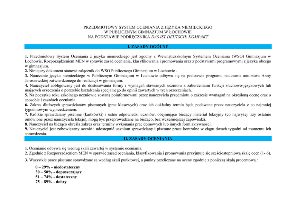 PRZEDMIOTOWY SYSTEM OCENIANIA Z JĘZYKA NIEMIECKIEGO W PUBLICZNYM GIMNAZJUM W ŁOCHOWIE NA PODSTAWIE PODRĘCZNIKA DAS IST DEUTSCH! KOMPAKT I. ZASADY OGÓLNE 1. Przedmiotowy System Oceniania z języka niemieckiego jest zgodny z Wewnątrzszkolnym Systemem Oceniania (WSO) Gimnazjum w Łochowie, Rozporządzeniem MEN w sprawie zasad oceniania, klasyfikowania i promowania oraz z podstawami programowymi z języka obcego w gimnazjum. 2. Niniejszy dokument stanowi załącznik do WSO Publicznego Gimnazjum w Łochowie . 3. Nauczanie języka niemieckiego w Publicznym Gimnazjum w Łochowie odbywa się na podstawie programu nauczania autorstwa Anny Jaroszewskiej zatwierdzonego do realizacji w gimnazjum. 4. Nauczyciel zobligowany jest do dostosowania formy i wymagań stawianych uczniom z zaburzeniami funkcji słuchowo-językowych lub mających orzeczenia o potrzebie kształcenia specjalnego do opinii zawartych w tych orzeczeniach. 5. Na początku roku szkolnego uczniowie zostaną poinformowani przez nauczyciela przedmiotu o zakresie wymagań na określoną ocenę oraz o sposobie i zasadach oceniania. 6. Zakres dłuższych sprawdzianów pisemnych (prac klasowych) oraz ich dokładny termin będą podawane przez nauczyciela z co najmniej tygodniowym wyprzedzeniem. 7. Krótkie sprawdziany pisemne (kartkówki) i ustne odpowiedzi uczniów, obejmujące bieżący materiał lekcyjny (co najwyżej trzy ostatnie omówione przez nauczyciela lekcje), mogą być przeprowadzane na bieżąco, bez wcześniejszej zapowiedzi. 8. Nauczyciel na bieżąco określa zakres oraz terminy wykonania prac domowych lub innych form aktywności. 9. Nauczyciel jest zobowiązany ocenić i udostępnić uczniom sprawdziany i pisemne prace kontrolne w ciągu dwóch tygodni od momentu ich sprawdzenia. II. ZASADY OCENIANIA 1. Ocenianie odbywa się według skali zawartej w systemie oceniania. 2. Zgodnie z Rozporządzeniem MEN w sprawie zasad oceniania, klasyfikowania i promowania przyjmuje się sześciostopniową skalę ocen (1- 6). 3. Wszystkie prace pisemne sprawdzane są według skali punktowej, a punkty przeliczane na oceny zgodnie z poniższą skalą procentową : 0 – 29% - niedostateczny 30 – 50% - dopuszczający 51 – 74% - dostateczny 75 – 89% - dobry 90 – 99% - bardzo dobry 100% - celujący 4. Uczeń ma możliwość zgłoszenia jednego nieprzygotowania przy jednej godzinie tygodniowo języka niemieckiego, dwóch nieprzygotowań przy dwóch godzinach tygodniowo języka niemieckiego. Nieprzygotowania nie można zgłosić w przypadku sprawdzianu lub zapowiedzianej kartkówki. 5. Nieprzygotowanie do zajęć, brak zadania domowego, podręcznika, zeszytu przedmiotowego uczeń zobowiązany jest zgłosić nauczycielowi na samym początku lekcji. 6. Odpowiedź ustna może być punktowana na oceny albo na plusy i minusy - o formie oceny uczeń jest zawsze informowany. 7. Nauczyciel przewiduje po każdym, kolejno omówionym rozdziale, sprawdzian. 8. Jeżeli z przyczyn losowych uczeń nie może napisać sprawdzianu z całą klasą, to powinien to uczynić w terminie uzgodnionym z nauczycielem (w przypadku nieobecności usprawiedliwionej termin zaliczenia wynosi 2 tygodnie od daty napisania sprawdzianu przez klasę, przy dłuższej nieobecności ucznia termin zaliczenia uczeń uzgadnia z nauczycielem). 9. Sprawdzian napisany na ocenę niesatysfakcjonującą, uczeń może poprawić. Poprawa jest dobrowolna i odbywa się w ciągu 1 tygodnia od dnia podania informacji o ocenie. Dla wszystkich chętnych ustala się jeden termin poprawy. Ocenę można poprawiać tyko jeden raz. Formę sprawdzianu poprawkowego wybiera nauczyciel. 10. Przy nieobecności nieusprawiedliwionej uczeń może być rozliczony ze sprawdzianu na następnej lekcji. 11. Sprawdziany pisemne, odpowiedzi ustne i zadania domowe są obowiązkowe. W każdym semestrze przewiduje się 1-4 sprawdziany. Ilość kartkówek i zadań domowych nie jest określona i wynika z bieżącej pracy uczniów. 12. Za brak pracy domowej, podręcznika, zeszytu przedmiotowego uczeń otrzymuje minus. Trzy minusy dają ocenę niedostateczną. 13. Za wyjątkową aktywność na lekcji lub dobrze odrobioną pracę domową uczeń może otrzymać plus. Pięć plusów daje ocenę bardzo dobrą. 14. Sukcesy osiągnięte przez ucznia w konkursach przedmiotowych wpływają na podwyższenie oceny z przedmiotu. 15. O ocenie śródrocznej i rocznej decyduje hierarchia ważności ocen cząstkowych, uwzględniających wiedzę i obowiązujące formy aktywności, oraz terminowe wywiązywanie się ucznia z wykonywania zadawanych prac w danym semestrze. 16. Na ocenę semestralną i końcową składają się: a) oceny ze sprawdzianów pisemnych b) oceny z kartkówek c) odpowiedź ustna d) praca projektowa e) aktywność, praca w grupie, przygotowanie do lekcji 17. Zgodnie z Rozporządzeniem MEN w sprawie zasad oceniania, klasyfikowania i promowania uczeń może być nieklasyfikowany z powodu nieobecności na zajęciach edukacyjnych, przekraczających połowę czasu przeznaczonego na te zajęcia w szkolnym planie nauczania, a także wtedy, gdy nie uzyskał minimum trzech ocen z języka obcego. 18. Uczeń na bieżąco jest informowany o uzyskanych ocenach. Tryb informowana rodziców o ocenach cząstkowych, ocenie semestralnej i końcowo rocznej oraz sposobie jej poprawiania precyzuje WSO. III. KRYTERIA OCENIANIA OSIĄGNIĘĆ UCZNIÓW OCENA CELUJĄCA ROZUMIENIE TEKSTU SŁUCHANEGO/CZYTANEGO SPRAWNOŚĆ MÓWIENIA - uczeń rozumie wszystkie polecenia i wypowiedzi nauczyciela w języku niemieckim, - tworzy wypowiedzi zawierające bogate słownictwo i skomplikowane struktury gramatyczne wykraczające poza obowiązujący materiał i podstawę programową, - rozumie teksty słuchane i pisane, których słownictwo, struktury gramatyczne wykraczają poza program nauczania, - na podstawie przeczytanego lub wysłuchanego tekstu określa główna myśl, wyszukuje wymagane informacje, określa intencje autora tekstu, - potrafi opowie