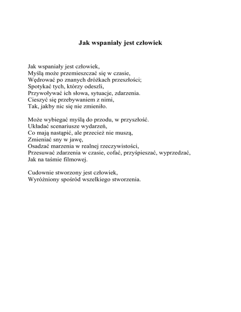 Jak wspaniały jest człowiek Jak wspaniały jest człowiek, Myślą może przemieszczać się w czasie, Wędrować po znanych dróżkach przeszłości; Spotykać tych, którzy odeszli, Przywoływać ich słowa, sytuacje, zdarzenia. Cieszyć się przebywaniem z nimi, Tak, jakby nic się nie zmieniło. Może wybiegać myślą do przodu, w przyszłość. Układać scenariusze wydarzeń, Co mają nastąpić, ale przecież nie muszą, Zmieniać sny w jawę, Osadzać marzenia w realnej rzeczywistości, Przesuwać zdarzenia w czasie, cofać, przyśpieszać, wyprzedzać, Jak na taśmie filmowej. Cudownie stworzony jest człowiek, Wyróżniony spośród wszelkiego stworzenia.