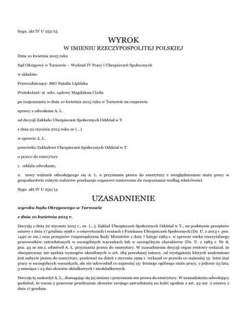 Sygn. akt IV U 252/15 WYROK W IMIENIU RZECZYPOSPOLITEJ POLSKIEJ Dnia 10 kwietnia 2015 roku Sąd Okręgowy w Tarnowie – Wydział IV Pracy i Ubezpieczeń Społecznych w składzie: Przewodniczący: SSO Natalia Lipińska Protokolant: st. sekr. sądowy Magdalena Cieśla po rozpoznaniu w dniu 10 kwietnia 2015 roku w Tarnowie na rozprawie sprawy z odwołania A. L. od decyzji Zakładu Ubezpieczeń Społecznych Oddział w T. z dnia 22 stycznia 2015 roku nr (...) w sprawie A. L. przeciwko Zakładowi Ubezpieczeń Społecznych Oddział w T. o prawo do emerytury 1. oddala odwołanie; 2. nowy wniosek odwołującego się A. L. o przyznanie prawa do emerytury z uwzględnieniem stażu pracy w gospodarstwie rolnym rodziców przekazuje organowi rentowemu do rozpoznania według właściwości. Sygn. akt IV U 252/15 UZASADNIENIE wyroku Sądu Okręgowego w Tarnowie z dnia 10 kwietnia 2015 r. Decyzją z dnia 22 stycznia 2015 r., nr (...), Zakład Ubezpieczeń Społecznych Oddział w T., na podstawie przepisów ustawy z dnia 17 grudnia 1998 r. o emeryturach i rentach z Funduszu Ubezpieczeń Społecznych (Dz. U. z 2013 r. poz. 1440 ze zm.) oraz przepisów rozporządzenia Rady Ministrów z dnia 7 lutego 1983 r. w sprawie wieku emerytalnego pracowników zatrudnionych w szczególnych warunkach lub w szczególnym charakterze (Dz. U. z 1983 r. Nr 8, poz. 43 ze zm.), odmówił A. L. przyznania prawa do emerytury. W uzasadnieniu decyzji organ rentowy wskazał, że ubezpieczony nie spełnia wymogów określonych w art. 184 powołanej ustawy, od wystąpienia których uzależnione jest nabycie prawa do emerytury, ponieważ na dzień 1 stycznia 1999 r. wykazał co prawda co najmniej 15- letni staż pracy w szczególnych warunkach, ale nie udowodnił co najmniej 25- letniego ogólnego stażu pracy, a jedynie 23 lata, 3 miesiące i 23 dni okresów składkowych i nieskładkowych. Decyzję tę zaskarżył A. L., domagając się jej zmiany i przyznania mu prawa do emerytury. W uzasadnieniu odwołujący podniósł, że wnosi o ponowne przeliczenie okresów swojego zatrudnienia na kolei zgodnie z art. 43 ust. 2 ustawy z dnia 17 grudnia 1998 r. o emeryturach i rentach z FUS, gdyż przez cały ten okres był maszynistą. W odpowiedzi na odwołanie organ rentowy wniósł o jego oddalenie. W uzasadnieniu podał, że po przeprowadzeniu rozmowy telefonicznej z pracownikiem Przedsiębiorstwa (...) Spółka z o.o. ustalił, że odwołujący był zatrudniony w tym Przedsiębiorstwie jako maszynista maszyn budowalnych i nie ma do niego zastosowania przelicznik określony z art. 43 ust. 2 ustawy z dnia 17 grudnia 1998 r. o emeryturach i rentach z FUS. Bezsporne w niniejszej sprawie było, że odwołujący A. L., urodzony (...) r., w dniu (...) r. osiągnął 60 lat życia. Na dzień 1 stycznia 1999 r. ubezpieczony udokumentował okres pracy w szczególnych warunkach w wymiarze 21 lat, 4 miesięcy i 5 dni z tytułu zatrudnienia w Przedsiębiorstwie (...) Spółka z o.o. od 28 sierpnia 1975 r. do 31 grudnia 1998 r. na stanowiskach: starszego rzemieślnika (od 28 sierpnia 1978 r. do 31 marca 1976 r.), maszynisty maszyn (od 1 kwietnia 1976 r. do 31 grudnia 1992 r.) i specjalisty maszynisty maszyn (od 1 stycznia 1993 r. do 13 grudnia 1998 r.). Przed organem rentowym wykazał również na dzień 1 stycznia 1999 r. 23 lata, 2 miesiące i 13 dni okresów składkowych oraz 1 miesiąc i 10 dni okresów nieskładkowych, tj. łącznie 23 lata, 3 miesiące i 23 dni okresów składkowych i nieskładkowych. W ogólnym stażu pracy organ rentowy uwzględnił wnioskodawcy okres zatrudnienia w Przedsiębiorstwie (...) Spółka z o.o. od 28 sierpnia 1975 r. do 31 grudnia 1998 r., w tym okres odbywania zasadniczej służby wojskowej od 23 kwietnia 1976 r. do 10 kwietnia 1978 r. Ze stażu pracy ZUS wyłączył wnioskodawcy okres przerwy pomiędzy zakończeniem odbywania zasadniczej służby wojskowej, a podjęciem zatrudnienia od 11 kwietnia 1978 r. do 24 kwietnia 1978 r., tj. 14 dni. We wniosku z dnia 19 stycznia 2015 r. ubezpieczony wniósł o przyznanie mu prawa do emerytury. Zaskarżoną decyzją z dnia 22 stycznia 2015 r. ZUS Oddział w T. odmówił A. L. przyznania prawa do tego świadczenia, ponieważ na dzień 1 stycznia 1999 r. wnioskodawca nie udowodnił co najmniej 25- letniego ogólnego stażu pracy, a jedynie 23 lata, 3 miesiące i 23 dni okresów składkowych i nieskładkowych. Ubezpieczony nie jest członkiem OFE. (okoliczności bezsporne) Sąd ustalił ponadto następujący stan faktyczny sprawy: Od 28 sierpnia 1975 r. do 31 grudnia 1998 r. odwołujący A. L. pracował w Przedsiębiorstwie (...) w K. Spółka z o.o. Po przyjęciu do pracy został stażystą w Samodzielnej Grupie Spawalniczej. Mocą umowy o pracę na czas nieokreślony z dnia 15 września 1975 r., od 11 września 1975 r. przeniesiony został do Bazy Maszyn i Sprzętu Mechanicznego w K. i wyznaczony do pełnienia czynności na stanowisku starszego rzemieślnika- elektromontera. Od 1 kwietnia 1976 r. wyznaczono go do pełnienia czynności maszynisty ciężkich maszyn nawierzchniowych i budowlanych, przyznając 8 grupę uposażenia zasadniczego w stawce I. W dniu 31 marca 1976 r. odwołujący przystąpił do egzaminu ścisłego na maszynistę podbijarki „M.” (...) W dniu 27 marca 1976 r. zdał egzamin praktyczny na maszynistę takiej podbijarki. W latach 1978-1981 był maszynistą ciężkich maszyn w K. w Pociągu Robót Nawierzchniowych Zmechanizowanych Nr 32. Z dniem 1 lutego 1982 r. przeniesiony został do Pociągu Zmechanizowanego Robót Nawierzchniowych Nr 31 (K.). Z dniem 1 września 1985 r. mianowany został starszym maszynistą maszyn i urządzeń specjalistą przez Pociąg Zmechanizowany Nr 3211. Pracował też w Pociągu Zmechanizowanym Nr 3214 (P.). W dniu 23 lutego 1988 r. zdał egzamin na prawo do kierowania ciężką drezyną (...), uzyskując świadectwo kierowcy ciężkiej drezyny maszynowej. W wyniku egzaminów z dnia: 31 marca 1976 r. i 23 lutego 1988 r. uzys