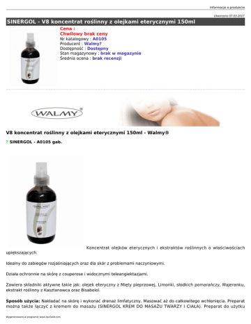 Informacje o produkcie Utworzono 07-03-2017 SINERGOL - V8 koncentrat roślinny z olejkami eterycznymi 150ml Cena : Chwilowy brak ceny Nr katalogowy : A0105 Producent : Walmy? Dostępność : Dostępny Stan magazynowy : brak w magazynie Średnia ocena : brak recenzji V8 koncentrat roślinny z olejkami eterycznymi 150ml - Walmy® ? SINERGOL - A0105 gab. Koncentrat olejków eterycznych i ekstraktów roślinnych o właściwościach upiększających. Idealny do zabiegów rozjaśniających oraz dla skór z problemami naczyniowymi. Działa ochronnie na skórę z couperose i widocznymi teleangiektazjami. Zawiera składniki aktywne takie jak: olejek eteryczny z Mięty pieprzowej, Limonki, słodkich pomarańczy, Majeranku, ekstrakt roślinny z Kasztanowca oraz Bisabolol. Sposób użycia: Nakładać na skórę i wykonać drenaż limfatyczny. Masować aż do całkowitego wchłonięcia. Preparat można także łączyć z kremem do masażu (SINERGOL KREM DO MASAŻU TWARZY I CIAŁA). Preparat do użytku Wygenerowano w programie www.oscGold.com profesjonalnego. Składniki/Ingredients: Aqua, PPG-10 Methyl Glucose Ether, Ethoxydiglycol, Polysorbate- 80, Acetylated Lanolin Alcohol, Cetyl Acetate, PPG-26 Buteth 26, PEG 40 Hydrogenated Castor Oil, PEG-7 Glyceril Cocoate, Bisabolol, Propylene Glycol, Mentha Piperita, Origanum Majorana, Citrus Limonum, Citrus Aurantium, Aesculus Hippocastanum, Hydrolyzed Soy Protein, Dimethicone, Diazolidinyl Urea, Methyl Paraben, Propyl Paraben, Parfum, Lyral, Benzyl Benzoate, Linalool, Limonene, Geraniol, Citral. Dystrybutor: Dermaya Instytut Kosmetyki Profesjonalnej ul. Grota-Roweckiego 2b, 80-112 Gdańsk [email protected]