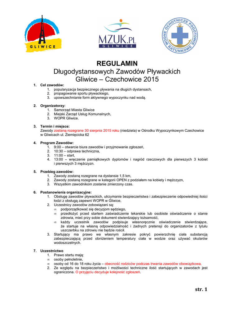 REGULAMIN Długodystansowych Zawodów Pływackich Gliwice – Czechowice 2015 1. Cel zawodów: 1. popularyzacja bezpiecznego pływania na długich dystansach, 2. propagowanie sportu pływackiego, 3. upowszechnianie form aktywnego wypoczynku nad wodą. 2. Organizatorzy: 1. Samorząd Miasta Gliwice 2. Miejski Zarząd Usług Komunalnych, 3. WOPR Gliwice. 3. Termin i miejsce: Zawody zostaną rozegrane 30 sierpnia 2015 roku (niedziela) w Ośrodku Wypoczynkowym Czechowice w Gliwicach ul. Ziemięcicka 62 4. Program Zawodów: 1. 9:00 – otwarcie biura zawodów i przyjmowanie zgłoszeń, 2. 10:30 – odprawa techniczna, 3. 11:00 – start, 4. 13:00 – wręczenie pamiątkowych dyplomów i nagród rzeczowych dla pierwszych 3 kobiet i pierwszych 3 mężczyzn. 5. Przebieg zawodów: 1. Zawody zostaną rozegrane na dystansie 1,5 km, 2. Zawody zostaną rozegrane w kategorii OPEN z podziałem na kobiety i mężczyzn, 3. Wszystkim zawodnikom zostanie zmierzony czas. 6. Postanowienia organizacyjne: 1. Obsługę zawodów pływackich, utrzymanie bezpieczeństwa i zabezpieczenie odpowiedniej ilości łodzi z obsługą zapewni WOPR w Gliwice, 2. Uczestnicy zawodów zobowiązani są: • podporządkować się decyzjom sędziego, • przedłożyć przed startem zaświadczenie lekarskie lub osobiste oświadczenie o stanie zdrowia, mieć przy sobie dokument stwierdzający tożsamość, • każdy uczestnik zawodów podpisuje własnoręcznie oświadczenie stwierdzające, że startuje na własną odpowiedzialność i żadnych pretensji do organizatorów z tytułu uszczerbku na zdrowiu nie będzie rościł. 3. Startujący ma prawo we własnym zakresie pokryć powierzchnię ciała substancją zabezpieczającą przed obniżeniem temperatury ciała w wodzie oraz używać okularów wodoszczelnych. 7. Uczestnictwo 1. Prawo startu mają: • osoby pełnoletnie, • osoby od 16 do 18 roku życia – obecność rodziców podczas trwania zawodów obowiązkowa, 2. Ze względu na bezpieczeństwo i możliwości techniczne ilość startujących w zawodach jest ograniczona. O przyjęciu decyduje kolejność zgłoszeń. str. 1 8. Zgłoszenia: 1. Zgłoszenia do udziału w zawodach należy kierować osobiście na miejscu 30 sierpnia 2015 roku od godz. 9:00 w biurze zawodów przy siedzibie WOPR lub wcześniej mailem [email protected] 2. Zgłoszenie zawodnika następuje po wypełnieniu karty zgłoszenia i przedłożeniu zaświadczenia lekarskiego lub oświadczenia o starcie na własną odpowiedzialność i wpłaceniu wpisowego w kwocie 20 zł. 9. Nagrody 1. Wszyscy uczestnicy otrzymają czepki i pamiątkowe smycze, 2. Trzy pierwsze kobiety i trzech pierwszych mężczyzn otrzyma dyplomy i nagrody rzeczowe, 3. Zawodnik i zawodniczka, którzy pierwsi ukończą dystans otrzymają nagrody rzeczowe, a także możliwość zdobycia specjalnej karty pływackiej - „Żółty czepek”, 4. Pozostali zawodnicy, którzy ukończą zawody otrzymają pamiątkowe dyplomy uczestnictwa (zaliczenie dystansu umożliwia otrzymanie specjalnej karty pływackiej - „Żółtego czepka” po dokonaniu właściwych opłat i dostarczeniu zdjęcia. Wszystkich informacji w tej sprawie udzieli sędzia główny zawodów na odprawie technicznej). 10. Postanowienia końcowe: 1. Za rzeczy osobiste uczestników w razie zaginięcia organizatorzy nie ponoszą odpowiedzialności, 2. Dodatkowych informacji dotyczących Zawodów można uzyskać na stronie pod telefonem 519 197 755 3. We wszystkich sprawach nie ujętych niniejszym regulaminem decyduje sędzia główny i jego decyzja jest ostateczna. Organizatorzy str. 2