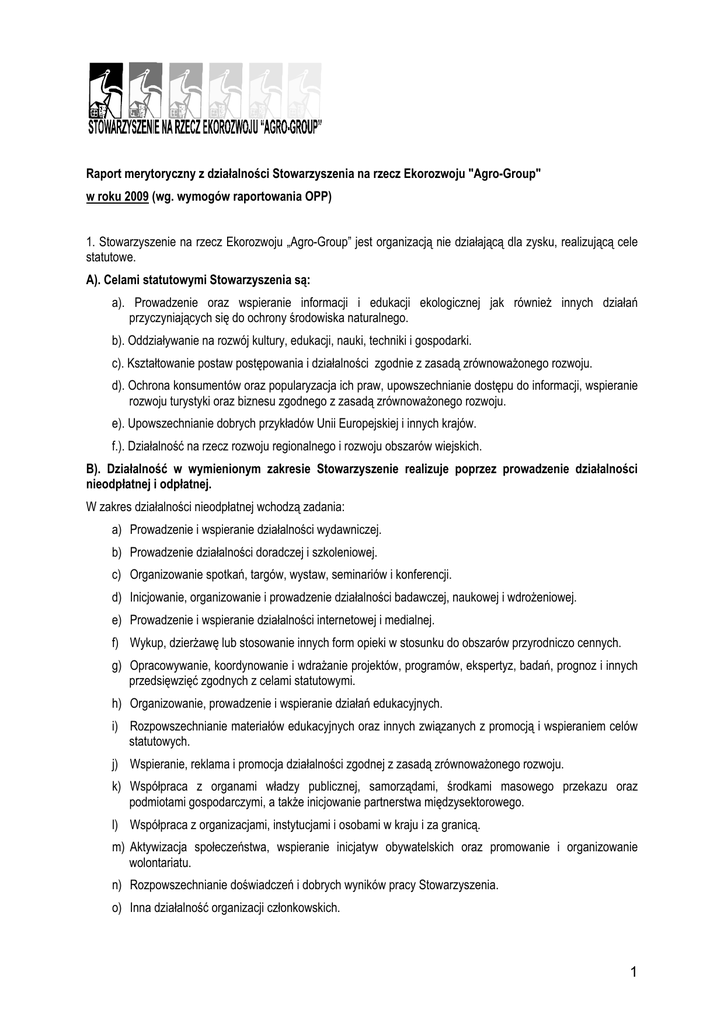 Raport merytoryczny z działalności Stowarzyszenia na rzecz Ekorozwoju "Agro-Group" w roku 2009 (wg. wymogów raportowania OPP) 1. Stowarzyszenie na rzecz Ekorozwoju „Agro-Group” jest organizacją nie działającą dla zysku, realizującą cele statutowe. A). Celami statutowymi Stowarzyszenia są: a). Prowadzenie oraz wspieranie informacji i edukacji ekologicznej jak również innych działań przyczyniających się do ochrony środowiska naturalnego. b). Oddziaływanie na rozwój kultury, edukacji, nauki, techniki i gospodarki. c). Kształtowanie postaw postępowania i działalności zgodnie z zasadą zrównoważonego rozwoju. d). Ochrona konsumentów oraz popularyzacja ich praw, upowszechnianie dostępu do informacji, wspieranie rozwoju turystyki oraz biznesu zgodnego z zasadą zrównoważonego rozwoju. e). Upowszechnianie dobrych przykładów Unii Europejskiej i innych krajów. f.). Działalność na rzecz rozwoju regionalnego i rozwoju obszarów wiejskich. B). Działalność w wymienionym zakresie Stowarzyszenie realizuje poprzez prowadzenie działalności nieodpłatnej i odpłatnej. W zakres działalności nieodpłatnej wchodzą zadania: a) Prowadzenie i wspieranie działalności wydawniczej. b) Prowadzenie działalności doradczej i szkoleniowej. c) Organizowanie spotkań, targów, wystaw, seminariów i konferencji. d) Inicjowanie, organizowanie i prowadzenie działalności badawczej, naukowej i wdrożeniowej. e) Prowadzenie i wspieranie działalności internetowej i medialnej. f) Wykup, dzierżawę lub stosowanie innych form opieki w stosunku do obszarów przyrodniczo cennych. g) Opracowywanie, koordynowanie i wdrażanie projektów, programów, ekspertyz, badań, prognoz i innych przedsięwzięć zgodnych z celami statutowymi. h) Organizowanie, prowadzenie i wspieranie działań edukacyjnych. i) Rozpowszechnianie materiałów edukacyjnych oraz innych związanych z promocją i wspieraniem celów statutowych. j) Wspieranie, reklama i promocja działalności zgodnej z zasadą zrównoważonego rozwoju. k) Współpraca z organami władzy publicznej, samorządami, środkami masowego przekazu oraz podmiotami gospodarczymi, a także inicjowanie partnerstwa międzysektorowego. l) Współpraca z organizacjami, instytucjami i osobami w kraju i za granicą. m) Aktywizacja społeczeństwa, wspieranie inicjatyw obywatelskich oraz promowanie i organizowanie wolontariatu. n) Rozpowszechnianie doświadczeń i dobrych wyników pracy Stowarzyszenia. o) Inna działalność organizacji członkowskich. 1 W zakres działalności odpłatnej, w przypadku posiadania niewystarczającej ilości środków statutowych przeznaczonych na pokrycie kosztów działań, wchodzi działalność wyszczególniona w ustępie 2 punkty a, b, c, d, e, f, g, h, i, j, o. Stowarzyszenie nie prowadzi działalności gospodarczej. 1. Suma bilansowa aktywów i pasywów wynosi – 649.238,86 zł. 2. Uzyskane przychody z działalności statutowej – 440.558,72 w tym: • darowizny w gotówce na konto Stowarzyszenia – 16.000,00zł • darowizny z budżetu gminy – 0,00 zł. • darowizny rzeczowe – 0,00 zł • dotacje łącznie – 405.062,72 zł • przychody ze sprzedaży – 0,00 zł. • dochód bilansowy – 92.522,13 zł 3. Informacja o poniesionych kosztach na: a) realizację zadań statutowych – 344.556,42 zł, w tym: a. zużycie materiałowi i energii – 39.613,82 zł b. usługi obce – 105.159,53 zł c. podatki i opłaty – 592,56 zł d. wynagrodzenia i ubezpieczenia społeczne – 172.432,72 zł e. amortyzacja – 16.264,03 zł f. pozostałe koszty – 10.493,76 zł b) działalność gospodarczą – nie była prowadzona. 4. Dane o: a) liczbie osób zatrudnionych w Stowarzyszeniu – brak pracowników etatowych. b) liczba osób zatrudnionych na umowy-zlecenia, umowy o dzieło, zmienna, łącznie 20 osób w ciągu całego roku 2009 c) łączna kwota wynagrodzeń wypłaconych przez Stowarzyszenie – 172.432,72 zł, w tym z tytułu umów zleceń 172.432,72 zł, z tytułu umów o pracę 0 zł, z tytułu narzutów od wynagrodzeń (ZUS) -0 zł. d) kredyty i pożyczki – 0,00 zł, e) wartości nabytych obligacji – nie nabyto f) wielkości nabytych udziałów lub nabytych akcji – nie nabyto g) nabytych nieruchomościach – nie nabyto h) nabytych pozostałych środkach trwałych – 115.189,00 zł i) wartość zobowiązań Stowarzyszenia – 6.622,55 zł 5. Informacja o rozliczeniach z tytułu ciążących zobowiązań podatkowych – 2.695,00 zł. 6. W okresie sprawozdawczym w Stowarzyszeniu przeprowadzono kontrolę projektu „Zielona agroturystyka” – instytucja kontrolująca: ECORYS. 2 W roku 2009 Stowarzyszenie prowadziło działalność statutową realizując następujące projekty: 1. Wortal projektów proekologicznych ekoprojekty.info Finansowany przez NFOŚiGW projekt stanowiący uzupełnienie i kontynuację wcześniejszego projektu „Monitoring Powiatowych oraz Miejskich/Gminnych Funduszy Ochrony Środowiska”. Portal www.ekoprojekty.info prezentuje prawie 3 tysiące opisów projektów proekologicznych: akcji edukacyjnych, wystaw, publikacji, konkursów i innych działań na rzecz ochrony środowiska zorganizowanych przez szkoły, samorządy, organizacje pozarządowe i inne podmioty. Oprócz krótkiego opisu projektu i jego rezultatów podane zostały dane kontaktowe do realizatorów. Osoby zainteresowane bliższymi informacjami mogą się bezpośrednio kontaktować z wykonawcami projektów i zasięgnąć szczegółowych informacji. 2. Zielona agroturystyka. Projekt skierowany do mieszkańców obszarów wiejskich prowadzących lub planujących rozpoczęcie usług agroturystycznych. Projekt był dofinansowany ze środków EOG. W I kwartale 2009 roku przeprowadzono 7 dni szkoleń agroturystycznych, jednodniową wizytę studyjną do gospodarstw agroturystycznych oraz doradztwo dla uczestników projektu – 66 godzin.. Zostały przeprowadzone szkolenia: - "Podstawy prowadzenia własnej działalno