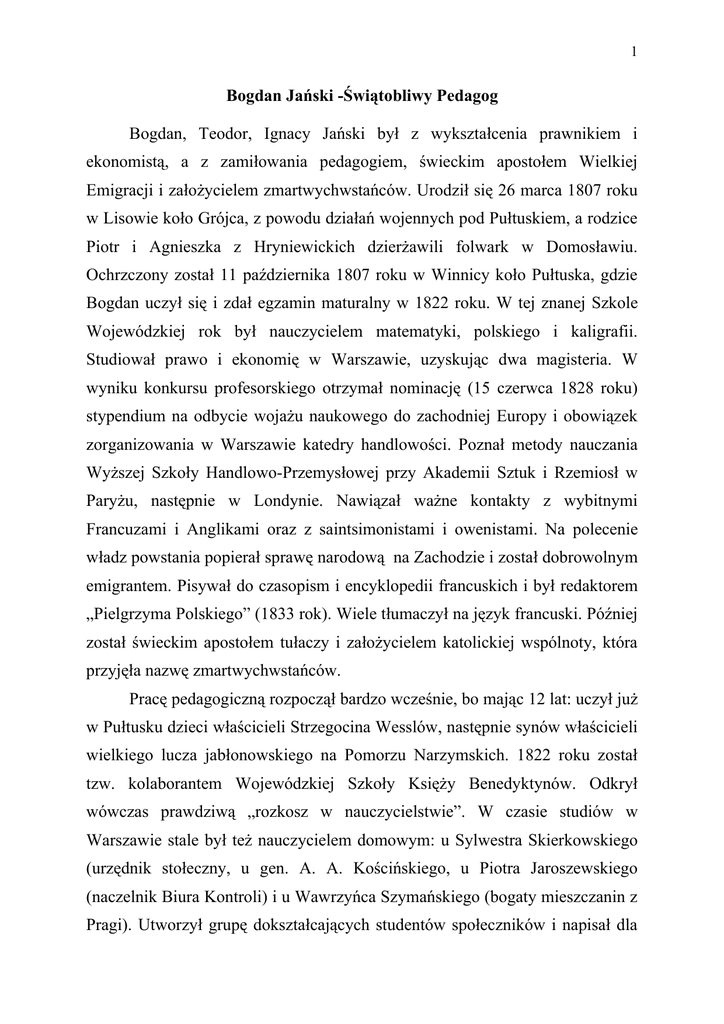 1 Bogdan Jański -Świątobliwy Pedagog Bogdan, Teodor, Ignacy Jański był z wykształcenia prawnikiem i ekonomistą, a z zamiłowania pedagogiem, świeckim apostołem Wielkiej Emigracji i założycielem zmartwychwstańców. Urodził się 26 marca 1807 roku w Lisowie koło Grójca, z powodu działań wojennych pod Pułtuskiem, a rodzice Piotr i Agnieszka z Hryniewickich dzierżawili folwark w Domosławiu. Ochrzczony został 11 października 1807 roku w Winnicy koło Pułtuska, gdzie Bogdan uczył się i zdał egzamin maturalny w 1822 roku. W tej znanej Szkole Wojewódzkiej rok był nauczycielem matematyki, polskiego i kaligrafii. Studiował prawo i ekonomię w Warszawie, uzyskując dwa magisteria. W wyniku konkursu profesorskiego otrzymał nominację (15 czerwca 1828 roku) stypendium na odbycie wojażu naukowego do zachodniej Europy i obowiązek zorganizowania w Warszawie katedry handlowości. Poznał metody nauczania Wyższej Szkoły Handlowo-Przemysłowej przy Akademii Sztuk i Rzemiosł w Paryżu, następnie w Londynie. Nawiązał ważne kontakty z wybitnymi Francuzami i Anglikami oraz z saintsimonistami i owenistami. Na polecenie władz powstania popierał sprawę narodową na Zachodzie i został dobrowolnym emigrantem. Pisywał do czasopism i encyklopedii francuskich i był redaktorem „Pielgrzyma Polskiego” (1833 rok). Wiele tłumaczył na język francuski. Później został świeckim apostołem tułaczy i założycielem katolickiej wspólnoty, która przyjęła nazwę zmartwychwstańców. Pracę pedagogiczną rozpoczął bardzo wcześnie, bo mając 12 lat: uczył już w Pułtusku dzieci właścicieli Strzegocina Wesslów, następnie synów właścicieli wielkiego lucza jabłonowskiego na Pomorzu Narzymskich. 1822 roku został tzw. kolaborantem Wojewódzkiej Szkoły Księży Benedyktynów. Odkrył wówczas prawdziwą „rozkosz w nauczycielstwie”. W czasie studiów w Warszawie stale był też nauczycielem domowym: u Sylwestra Skierkowskiego (urzędnik stołeczny, u gen. A. A. Kościńskiego, u Piotra Jaroszewskiego (naczelnik Biura Kontroli) i u Wawrzyńca Szymańskiego (bogaty mieszczanin z Pragi). Utworzył grupę dokształcających studentów społeczników i napisał dla 2 nich rozprawę o reformie społecznej „Na drodze ewangelicznej”. Po studiach zajął się aplikacją adwokacką i podjął się też wykładać w Szkole Leśnej. W Paryżu miał wykłady dla młodzieży saintsimońskiej. Później uczył języka francuskiego emigrantów oraz był nauczycielem domowym u książąt Ogińskich i Giedroyciów i hrabiostwa Komarów. Uczył też polskiego Francuzów, m.in. hr. Karola Montalemberta. W 1837 roku pisał: „We wszystkich prawie familiach tutejszych (tułaczy) daję lekcje ... dzieci mam u siebie na edukacji”. Oprócz przedmiotówogólnych uczył również katechizmu. Uczniowie bardzo go lubili i długo o nim pamiętali. Jego zabiegi o założenie szkoły polskiej w Paryżu nie akceptowały francuskie władze. Bardzo wiele czasu poświęcił na dokształcanie ogólne i religijne swoich współbraci, po założeniu wspólnoty katolickiej (1836 roku). Dążył do narodowościowych. wyeliminowania Wygłaszał nauki w i niej uprzedzeń organizował stanowych narady i wspólne. Dokształcał nawet swoich kleryków, organizując dla nich w domu wykłady socjologii i lekcje języków biblijnych. Najbardziej znany był w Paryżu jako świecki apostoł katolicki wobec ateuszy, niedowiarków, ignorantów i publicznych grzeszników. Podczas indywidualnych rozmów z nimi umiał zastapić ich złe zainteresowania dobrymi i w ten sposób dokonywał licznych, trwałych nawróceń. Pogłębiał je dalszymi rozmowami i dobrymi lekturami w przemyślanej kolejności. Prowadził również apostolstwo mądrą i serdeczną korespondencją, udzielaniem materialnej pomocy i włączeniem do swego środowiska, ułatwiającego wytrwanie i postęp w dobrym. Umiał oczyścić patriotyzm z szowinizmu i ukazać piękno światłego katolicyzmu. Jański nie był teoretykiem pedagogiki, ale niepospolitym pedagogiem, który umiał kształcić i wychowywać nie tylko dzieci i młodzież, lecz również dorosłych, nawet starszych od siebie, przewyższających go naukowymi i feudalnymi tytułami, rangami wojskowymi, państwowymi urzędami i literacką sławą. Miał szeroką wiedzę i głęboką oraz bogate doświadczenie wychowawcy. Interesował się też historią wychowania i oświaty. Postulował unowocześnienie i rechrystianizację wychowania i nauczania oraz tworzenie nowych typów szkół według zdolności i 3 zainteresowań uczniów. Sam umiał stwarzać atmosferę rodzinnej miłości, szczerości, zaufania, umiłowania prawdy. Wciągał do współpracy i do korzystania z udzielanych rad. Nie piętnował wad, ukazywał piękno dobra i cnót. Uczniowie i świadkowie prac Jańskiego pisali o nim: „dobrocią swoją rzadką wszystkich sobie ujmował, nauką i niepospolitą biegłością oświecał ... przykładnym życiem budował” (S. Witwicki); „swoją osobowością, charakterem rzadkiej słodyczy a przy tym energii i wytrwałości ... intelektualną wyższością ... umiał w krótkim czasie zapanować nad namiętną a burzliwą i niesforną młodzieżą” (W. Ogiński); „uwidaczniał się w nim umysł głęboko myślący” (W. Szokalski); „Bogdan (to) wielki znawca serc ludzkich” (ks. H. Kajsiewicz); „umysł prawdziwie wyższy, mąż ze wszech miar niepospolity ... panujący w naszej historii umysłowej od 1830 do roku 1840” (ks. P. Semenenko); „przed samą śmiercią chodził jeszcze po ulicach (Rzymu) i napotkanych znajomych budował mową i myślami” (Z. Krasiński). Sam Jański radził współbraciom „działać życiem na życie bliźnich”. Ks. Bolesław Micewski CR
