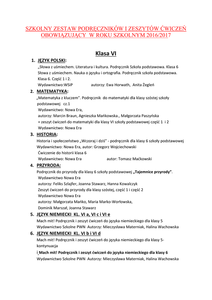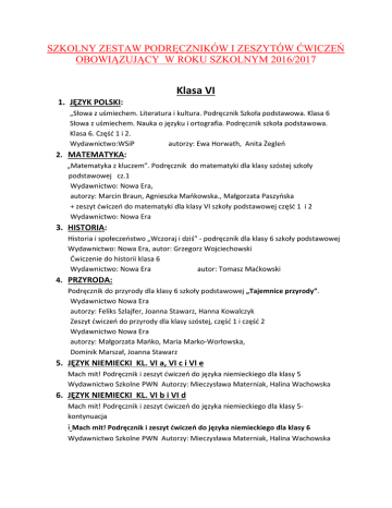 SZKOLNY ZESTAW PODRĘCZNIKÓW I ZESZYTÓW ĆWICZEŃ OBOWIĄZUJĄCY W ROKU SZKOLNYM 2016/2017 Klasa VI 1. JĘZYK POLSKI: „Słowa z uśmiechem. Literatura i kultura. Podręcznik Szkoła podstawowa. Klasa 6 Słowa z uśmiechem. Nauka o języku i ortografia. Podręcznik szkoła podstawowa. Klasa 6. Część 1 i 2. Wydawnictwo:WSiP autorzy: Ewa Horwath, Anita Żegleń 2. MATEMATYKA: „Matematyka z kluczem”. Podręcznik do matematyki dla klasy szóstej szkoły podstawowej cz.1 Wydawnictwo: Nowa Era, autorzy: Marcin Braun, Agnieszka Mańkowska., Małgorzata Paszyńska + zeszyt ćwiczeń do matematyki dla klasy VI szkoły podstawowej część 1 i 2 Wydawnictwo: Nowa Era 3. HISTORIA: Historia i społeczeństwo „Wczoraj i dziś” ‐ podręcznik dla klasy 6 szkoły podstawowej Wydawnictwo: Nowa Era, autor: Grzegorz Wojciechowski Ćwiczenie do historii klasa 6 Wydawnictwo: Nowa Era autor: Tomasz Maćkowski 4. PRZYRODA: Podręcznik do przyrody dla klasy 6 szkoły podstawowej „Tajemnice przyrody”. Wydawnictwo Nowa Era autorzy: Feliks Szlajfer, Joanna Stawarz, Hanna Kowalczyk Zeszyt ćwiczeń do przyrody dla klasy szóstej, część 1 i część 2 Wydawnictwo Nowa Era autorzy: Małgorzata Mańko, Maria Marko‐Worłowska, Dominik Marszał, Joanna Stawarz 5. JĘZYK NIEMIECKI KL. VI a, VI c i VI e Mach mit! Podręcznik i zeszyt ćwiczeń do języka niemieckiego dla klasy 5 Wydawnictwo Szkolne PWN Autorzy: Mieczysława Materniak, Halina Wachowska 6. JĘZYK NIEMIECKI KL. VI b i VI d Mach mit! Podręcznik i zeszyt ćwiczeń do języka niemieckiego dla klasy 5‐ kontynuacja i Mach mit! Podręcznik i zeszyt ćwiczeń do języka niemieckiego dla klasy 6 Wydawnictwo Szkolne PWN Autorzy: Mieczysława Materniak, Halina Wachowska 7. JĘZYK ANGIELSKI kl. VI b i VI d Evolution Plus 2 ‐ kontynuacja Wydawnictwo: Macmillan, autor: Nick Beare 8. MUZYKA: „Lekcja muzyki” ‐ podręcznik dla klasy VI szkoły podstawowej Wydawnictwo: Nowa Era, autorzy: Monika Gromek, Grażyna Kilbach, 9. ZAJĘCIA KOMPUTEROWE: Zajęcia komputerowe dla szkoły podstawowej klas IV – VI Wydawnictwo: MiGra, autor: Grażyna Koba 10. RELIGIA: „Przemienieni przez Boga” Podręcznik i ćwiczenia rok wydania 2014 Wydawnictwo: WAM Kraków, autor zbiorowy 11. PLASTYKA: „Do dzieła” – podręcznik do plastyki dla klasy VI szkoły podstawowej Wydawnictwo: Nowa Era, autorzy: Jadwiga Lukas, Krystyna Onak