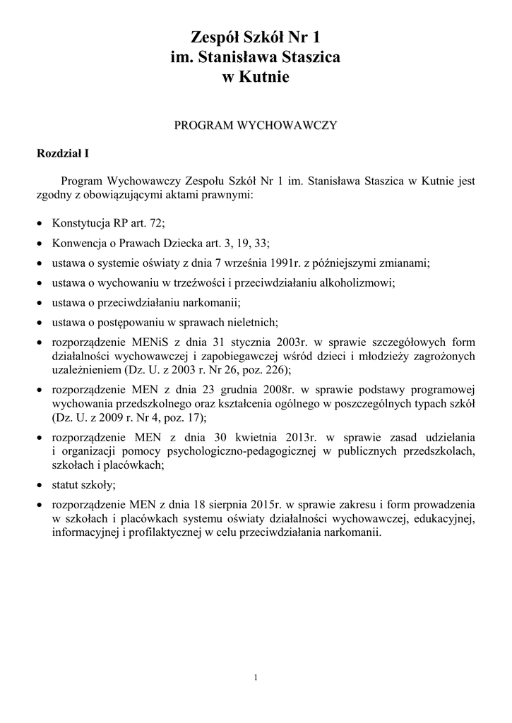 Zespół Szkół Nr 1 im. Stanisława Staszica w Kutnie PROGRAM WYCHOWAWCZY Rozdział I Program Wychowawczy Zespołu Szkół Nr 1 im. Stanisława Staszica w Kutnie jest zgodny z obowiązującymi aktami prawnymi: Konstytucja RP art. 72; Konwencja o Prawach Dziecka art. 3, 19, 33; ustawa o systemie oświaty z dnia 7 września 1991r. z późniejszymi zmianami; ustawa o wychowaniu w trzeźwości i przeciwdziałaniu alkoholizmowi; ustawa o przeciwdziałaniu narkomanii; ustawa o postępowaniu w sprawach nieletnich; rozporządzenie MENiS z dnia 31 stycznia 2003r. w sprawie szczegółowych form działalności wychowawczej i zapobiegawczej wśród dzieci i młodzieży zagrożonych uzależnieniem (Dz. U. z 2003 r. Nr 26, poz. 226); rozporządzenie MEN z dnia 23 grudnia 2008r. w sprawie podstawy programowej wychowania przedszkolnego oraz kształcenia ogólnego w poszczególnych typach szkół (Dz. U. z 2009 r. Nr 4, poz. 17); rozporządzenie MEN z dnia 30 kwietnia 2013r. w sprawie zasad udzielania i organizacji pomocy psychologiczno-pedagogicznej w publicznych przedszkolach, szkołach i placówkach; statut szkoły; rozporządzenie MEN z dnia 18 sierpnia 2015r. w sprawie zakresu i form prowadzenia w szkołach i placówkach systemu oświaty działalności wychowawczej, edukacyjnej, informacyjnej i profilaktycznej w celu przeciwdziałania narkomanii. 1 Rozdział II Zadania wychowawcze określone Podstawą Programową Nauczyciele w swojej pracy wychowawczej, wspierając w tym zakresie obowiązki rodziców, winni zmierzać do tego, aby uczniowie w szczególności: 1) znajdowali w szkole środowisko wszechstronnego rozwoju w wymiarze: - intelektualnym, - psychicznym, - społecznym, - zdrowotnym/fizycznym, - estetycznym, - moralnym, - duchowym. 2) rozwijali w sobie dociekliwość poznawczą ukierunkowaną na poszukiwanie prawdy, dobra i piękna w świecie, 3) mieli świadomość życiowej użyteczności zarówno poszczególnych przedmiotów szkolnych, jak i całej edukacji, 4) stawali się bardziej samodzielni w dążeniu do dobra w jego wymiarze indywidualnym i społecznym, godząc umiejętnie dążenie do dobra własnego z dobrem innych, odpowiedzialność za siebie i odpowiedzialność za innych, wolność własną z wolnością innych, 5) poszukiwali, odkrywali i dążyli poprzez rzetelną pracę do osiągnięcia celów życiowych i wartości ważnych dla odnalezienia własnego miejsca na świecie, 6) uczyli się szacunku dla dobra wspólnego jako podstawy życia społecznego oraz przygotowywali się do życia w rodzinie, w społeczności lokalnej i w państwie w duchu przekazu dziedzictwa kulturowego i kształtowania postaw patriotycznych, 7) przygotowywali się do rozpoznawania wartości moralnych, dokonywania wyborów i hierarchizacji oraz mieli możliwości doskonalenia się, 8) kształtowali w sobie postawę dialogu, umiejętność słuchania innych i rozumienia ich poglądów, umieli współdziałać i współtworzyć w szkole wspólnotę nauczycieli i uczniów. Cele wychowawcze szkoły 1. Tworzenie bezpiecznego środowiska w szkole. 2. Pomoc uczniom w trudnej sytuacji. 3. Integrowanie zespołów klasowych. 4. Stwarzanie możliwości rozwoju indywidualnych zainteresowań. 5. Kształtowanie postaw życzliwości, szacunku, tolerancji i anty-dyskryminacji. 6. Kształtowanie postawy dyspozycyjnej (frekwencja). 2 7. Organizowanie pomocy psychologiczno-pedagogicznej dla uczniów. 8. Profilaktyka zachowań ryzykownych (profilaktyka uniwersalna, selektywna, wskazująca). 9. Kształtowanie umiejętności pozwalających na prowadzenie zdrowego stylu życia i podejmowanie zachowań prozdrowotnych, 10. Włączać się do inicjatyw środowiska lokalnego. Adresaci Programu Wychowawczego: wszyscy uczniowie szkoły rodzice nauczyciele Rozdział III Każdy nauczyciel wywiera określony wpływ na uczniów: wpływa na zachowania i sposób myślenia, obyczaje młodzieży; tym samym wychowuje. W świadomym, celowym i metodycznym wychowaniu szkolnym chodzi o to, aby ten wpływ był pozytywny, aby był podporządkowany wszechstronnemu rozwojowi ucznia. W wychowaniu trzeba być blisko życia. Wartości istnieją albo w osobach i ich działaniach albo wcale. Wychowanie zatem jest rodzajem sztuki, w której tak ważną rolę odgrywa wyczucie POTRZEB, CHWILI, OKOLICZNOŚCI, MIEJSCA I CZASU. Tym samym nauczyciel musi trafnie rozpoznawać i nazywać problemy. Wychowanie jest również łączeniem poznania, przeżywania i działania, te trzy główne elementy decydują o przeobrażeniach osobowości ucznia. Ucznia powinny charakteryzować: - kultura osobista, - pozytywne i życzliwe nastawienie do drugiego człowieka, - wrażliwość na krzywdę innych, - tolerancja, szacunek a zwłaszcza brak antydyskryminacji wobec innych ludzi a mianowicie ich poglądów, rasy, pochodzenia etnicznego, narodowego, wieku, stanu zdrowia, niepełnosprawności, wyznawanej religii, orientacji seksualnej, płci, - zdolność do samodzielnego myślenia i dokonywania samodzielnych osądów moralnych, właściwych wyborów moralnych, działania moralnego, - umiejętność obcowania z przyrodą, - odporność na wpływy patologicznych zjawisk społecznych (subkultury, agresja). 3 Rozdział IV Elementami tworzącymi system wychowawczy w Zespole Szkól Nr 1 w Kutnie są: - Statut Szkoły, - Plany pracy szkoły, - plany pracy poszczególnych klas, - plan pracy Samorządu Uczniowskiego, - kronika szkolna, - premie za wyniki w nauce, - nagrody, - gablota „Nasi najlepsi”, - uroczystości szkolne wynikające z tradycji szkoły, - imprezy szkolne, - święto szkoły. Zatem każdy członek społeczności szkolnej jest osobą wolną, która świadomie do niej wstąpiła i zdecydowała się na jej współtworzenie. - każdy jest świadomy, że wolność niesie ze sobą trud odpowiedzialności za dokonywane wybory, - wszyscy pracownicy szkoły są wychowawcami, - wychowują swoją osobowością i zachowaniem (nikt nie jest obojętny wobec sytuacji, które z