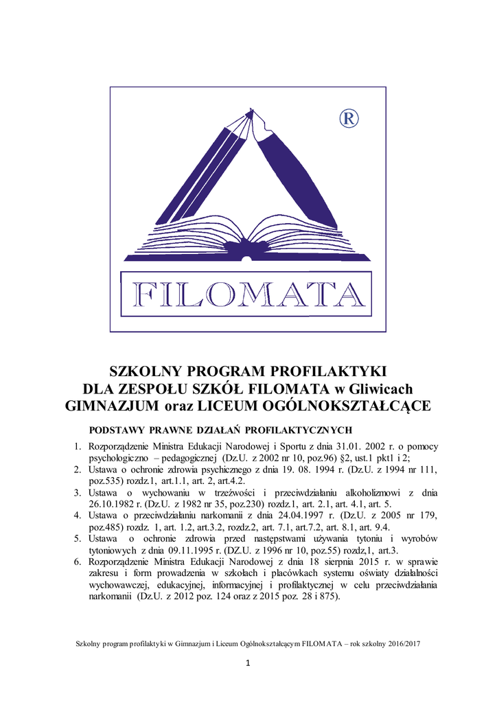 SZKOLNY PROGRAM PROFILAKTYKI DLA ZESPOŁU SZKÓŁ FILOMATA w Gliwicach GIMNAZJUM oraz LICEUM OGÓLNOKSZTAŁCĄCE PODSTAWY PRAWNE DZIAŁAŃ PROFILAKTYCZNYCH 1. Rozporządzenie Ministra Edukacji Narodowej i Sportu z dnia 31.01. 2002 r. o pomocy psychologiczno – pedagogicznej (Dz.U. z 2002 nr 10, poz.96) §2, ust.1 pkt1 i 2; 2. Ustawa o ochronie zdrowia psychicznego z dnia 19. 08. 1994 r. (Dz.U. z 1994 nr 111, poz.535) rozdz.1, art.1.1, art. 2, art.4.2. 3. Ustawa o wychowaniu w trzeźwości i przeciwdziałaniu alkoholizmowi z dnia 26.10.1982 r. (Dz.U. z 1982 nr 35, poz.230) rozdz.1, art. 2.1, art. 4.1, art. 5. 4. Ustawa o przeciwdziałaniu narkomanii z dnia 24.04.1997 r. (Dz.U. z 2005 nr 179, poz.485) rozdz. 1, art. 1.2, art.3.2, rozdz.2, art. 7.1, art.7.2, art. 8.1, art. 9.4. 5. Ustawa o ochronie zdrowia przed następstwami używania tytoniu i wyrobów tytoniowych z dnia 09.11.1995 r. (DZ.U. z 1996 nr 10, poz.55) rozdz,1, art.3. 6. Rozporządzenie Ministra Edukacji Narodowej z dnia 18 sierpnia 2015 r. w sprawie zakresu i form prowadzenia w szkołach i placówkach systemu oświaty działalności wychowawczej, edukacyjnej, informacyjnej i profilaktycznej w celu przeciwdziałania narkomanii (Dz.U. z 2012 poz. 124 oraz z 2015 poz. 28 i 875). Szkolny program profilaktyki w Gimnazjum i Liceum Ogólnokształcącym FILOM ATA – rok szkolny 2016/2017 1 SPIS TREŚCI: 1. ROZDZIAŁ I Profilaktyka w szkole – wprowadzenie. 3 2. ROZDZIAŁ II Cele szkolnego programu profilaktycznego. 3 3. ROZDZIAŁ III Działania w ramach szkolnego programu profilaktycznego 4 4. ROZDZIAŁ IV Zamierzone efekty działań 5 5. ROZDZIAŁ V Sposoby oceny skuteczności programu profilaktycznego 5 Załączniki do niniejszego programu stanowią: ZAŁĄCZNIK 1 – PLAN DZIAŁAŃ PROFILAKTYCZNYCH W ZESPOLE SZKÓŁ FILOMATA NA BIEŻĄCY ROK SZKOLNY Szkolny program profilaktyki w Gimnazjum i Liceum Ogólnokształcącym FILOM ATA – rok szkolny 2016/2017 2 ROZDZIAŁ I PROFILAKTYKA W SZKOLE – WPROWADZENIE 1. Szkolny Program Profilaktyczny adresowany do uczniów, nauczycieli i rodziców jest zgodny ze Statutem Szkoły i Programem Wychowawczym Szkoły. 2. Program jest otwarty i może ulegać modyfikacji, wiąże się z problematyką poszczególnych przedmiotów, godzin wychowawczych i umożliwia wykorzystanie innych programów profilaktycznych, realizowanych przez osoby kompetentne i właściwie przeszkolone. 3. Szkoła opracowuje plan działań profilaktycznych na dany rok szkolny, stanowiący załącznik nr 1 do niniejszego dokumentu. 4. Zadaniem szkolnej profilaktyki jest chronienie młodzieży przed zagrożeniami poprzez działania wychowawczo – profilaktyczne, a także reagowanie w sytuacjach rozpoznawania pierwszych prób podejmowania ryzykownych zachowań. 5. Do najczęstszych zachowań ryzykownych podejmowanych przez młodzież zaliczamy: palenie tytoniu, używanie alkoholu, zażywanie środków psychoaktywnych (szczególnie leków, dopalaczy i narkotyków), wczesną aktywność seksualną, zaburzenia odżywiania, zaburzenia nastroju. Przyczynami tych zjawisk mogą być: niskie poczucie własnej wartości, brak umiejętności radzenia sobie z frustracją i stresem, brak umiejętności przyjęcia postawy asertywnej w sytuacji nacisku ze strony rówieśników, poczucie utraty kontroli nad własnym życiem, brak autorytetów, frustracje spowodowane niezaspokajaniem potrzeb dziecka w rodzinie, rozpadanie się więzi rodzinnych, odrzucenie w grupie rówieśniczej, złe wzorce wychowawcze, niepowodzenia szkolne, gry komputerowe i filmy pełne przemocy. ROZDZIAŁ II CELE SZKOLNEGO PROGRAMU PROFILAKTYCZNEGO Cele: 1. Kształtowanie postawy odpowiedzialności za własne decyzje, ukształtowanie poglądów i przekonań, równowagi i harmonii psychicznej. 2. Kształtowanie stabilnego systemu wartości oraz poczucia sensu istnienia. 3. Wyposażenie uczniów w niezbędną wiedzę i umiejętności pozwalające na prowadzenie zdrowego stylu życia i podejmowania zachowań prozdrowotnych. 4. Rozwijanie umiejętności samodzielnej analizy wzorów i norm społecznych oraz wypełniania ról społecznych. 5. Zapobieganie i zmniejszanie szkód występujących w życiu młodych ludzi w związku z sięganiem przez nich po substancje uzależniające. 6. Ochrona młodego człowieka przed zagrożeniami. 7. Reagowanie na próby podejmowania zachowań ryzykownych poprzez odwołanie się do specjalistycznej pomocy. Szkolny program profilaktyki w Gimnazjum i Liceum Ogólnokształcącym FILOM ATA – rok szkolny 2016/2017 3 8. Podniesienie poziomu świadomości uczniów na temat szkodliwości spożywania napojów alkoholowych, palenia papierosów i stosowania środków psychoaktywnych. 9. Ograniczenie i eliminowanie zachowań problemowych występujących wśród młodzieży, takich jak: wagary, agresja, przemoc i cyberprzemoc, wyłudzenia, wykroczenia przeciw prawu, przedwczesna inicjacja seksualna. 10. Podnoszenie wiedzy i umiejętności rodziców i nauczycieli z zakresu promocji zdrowia i zdrowego stylu życia. 11. Stworzenie warunków bezpiecznego funkcjonowania ucznia w szkole. 12. Monitorowanie skuteczności podjętych działań. ROZDZIAŁ III DZIAŁANIA W RAMACH SZKOLNEGO PROGRAMU PROFILAKTYCZNEGO 1. Działania wychowawcze: a) kształtowanie hierarchii systemu wartości, w którym zdrowie należy do jednych z najważniejszych wartości w życiu; b) kształtowanie w uczniach aktywnej, otwartej, prospołecznej postawy oraz umiejętności psychospołecznych kształtujących więzi interpersonalne między uczniami; c) współpraca z rodzicami lub opiekunami uczniów w celu budowania postawy prozdrowotnej i zdrowego stylu życia; d) wzmacnianie wśród uczniów więzi ze szkołą oraz społecznością lokalną; e) kształtowanie przyjaznego klimatu w szkole, budowanie prawidłowych relacji rówieśniczych oraz relacji uczeń-uczeń, uczeń-nauczyciel, nauczyciel-rodzic, w tym wzmacnianie więzi z rówieśnikami oraz nauczycielami; f) doskonalenie umi