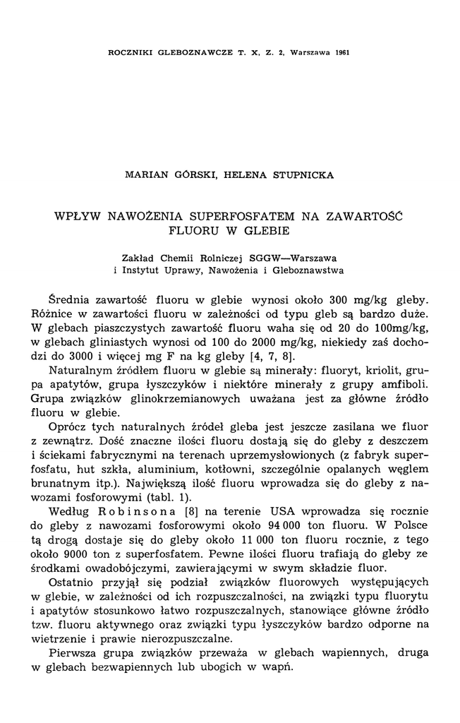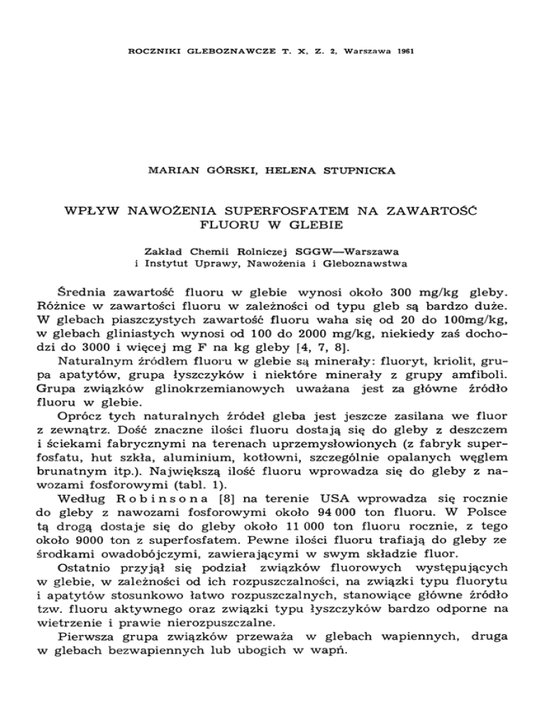 R O C Z N IK I G L E B O Z N A W C Z E T . X , Z . 2, W a r s z a w a 1961 MARIAN GÓRSKI, HELENA STUPNICKA W PŁYW NAW OŻENIA SUPERFOSFATEM NA ZAWARTOŚĆ FLUORU W GLEBIE Zakład Chemii Rolniczej SGGW—Warszawa i Instytut Uprawy, Nawożenia i Gleboznawstwa Średnia zaw artość fluoru w glebie w ynosi około 300 m g/kg gleby. Różnice w zaw artości fluoru w zależności od ty p u gleb są bardzo duże. W glebach piaszczystych zaw artość fluoru w aha się od 20 do 100 m g/kg, w glebach gliniastych w ynosi od 100 do 2000 m g/kg, niekiedy zaś docho dzi do 3000 i więcej mg F na kg gleby [4, 7, 8 ]. N aturalnym źródłem fluoru w glebie są m inerały: fluoryt, kriolit, g ru pa apatytów , grupa łyszczyków i niektóre m inerały z grupy amfiboli. G rupa związków glinokrzem ianow ych uw ażana jest za główne źródło fluoru w glebie. Oprócz tych natu raln y ch źródeł gleba jest jeszcze zasilana we fluor z zew nątrz. Dość znaczne ilości fluoru dostają się do gleby z deszczem i ściekam i fabrycznym i na terenach uprzem ysłow ionych (z fab ry k su p erfosfatu, h u t szkła, alum inium , kotłow ni, szczególnie opalanych w ęglem b ru n atn y m itp.). N ajw iększą ilość fluoru wprow adza się do gleby z n a wozam i fosforow ym i (tabl. 1). W edług R o b i n s o n a [8 ] na teren ie USA wprow adza się rocznie do gleby z nawozam i fosforow ym i około 94 000 ton fluoru. W Polsce tą drogą dostaje się do gleby około 11 000 ton fluoru rocznie, z tego około 9000 ton z superfosfatem . Pew ne ilości fluoru tra fia ją do gleby ze środkam i owadobójczym i, zaw ierającym i w swym składzie fluor. O statnio przyjął się podział związków fluorow ych w ystępujących w glebie, w zależności od ich rozpuszczalności, na związki ty p u fluorytu i apatytów stosunkow o łatw o rozpuszczalnych, stanow iące główne źródło tzw. fluoru aktyw nego oraz związki ty p u łyszczyków bardzo odporne na w ietrzenie i praw ie nierozpuszczalne. Pierw sza grupa związków przew aża w glebach w apiennych, druga w glebach bezw apiennych lub ubogich w w apń. M. Górski, H. Stupnicka 454 Tabl i ca 1 Z aw artość f lu o r u w ró ż n y c h nawozach w ed łu g Bredemanna F lu o r in e c o n te n t in v a r io u s f e r t i l i z e r s a c c . t o B redenann R odzaj nawozu - F e r t i l i z e r 3 6 0 -6 3 0 0 F o s f o r y t y - P h o s p h o r ite s 1 4 0 0 -2 6 0 0 S u p e r f o s f a t - S u p e r p h o sp h a te s P r e c y p it a t - P r e c ip ita te 3 1 -1 4 0 ś r . - n e a n 1900 T e r r a o fo sfa ty - T h erraoph osph ates Mączka k o s t n a Z a w a rto ść :• w „ /1 0 0 F co n ten t in ‘ь ' ° - Bone m eal 2 7 -4 5 1 -2 0 Tomasyna - Thomas n e a l O bornik ś w ie ż y - F r e s h farm yard raanure âr .-in e a n 0 ,3 O bornik p r z e g n i ły - Decomposed farm yard manure d r.-m ea n 0 , 4 S ia r c z a n amonu - Amonium s u lp h a te ś r .-m e a n 0 ,3 V/apno p a lo n e - L in e 5 -1 9 I .'a r g ie l - L'arl 6 -2 7 ś r .-m e a n 22 D o lo m it - D o lo m ite 1-2 K a in it - K a in it e S ó l p otasov/a 40ft - P o t a s s ic s a l t , 4055 2 -3 J a h n - D e e s b a c h [2 ] pow ołując się na prace R a t h j e nad tw o rzeniem się apatytów w glebie podaje, że w ystarczy aby 10 % fluoru w glebach w apiennych było w form ie CaF 2, aby cały w niesiony z naw o zam i fosfor został zam ieniony na a p aty t fluorow y. Tym się tłum aczy w edług autora głód fosforowy u roślin rosnących na glebach w ykazują cych bardzo wysoką zaw artość P 2O 5 ogólnego. W edług R a t h j e na za m ianę 100 części P 2O 5 na a p a ty t potrzeba 6,2 części F, co odpowiada stosunkow i F :P rów nem u 0,141. W superfosfacie, któ ry zaw iera średnio 1,5% F głów nie w form ie C aF 2, stosunek F : P w ynosi 0,191. W prow a dzając superfosfat do gleb w apiennych stw arza się ty m sam ym w arunki do przem iany fosforanu jednow apniow ego na a p a ty t fluorow y. Słuszność tego wniosku potw ierdziły badania M a c I n t i r e ’ a [5], k tó ry w ykazał w pływ fluoru zaw artego w superfosfacie na rozpuszczalność i przysw ajalność P 2O 5 oraz badania N a g e l s m i t h a i N i x o n a [6 ], którzy stw ierdzili rentgenograficznie obecność ap aty tu fluorowego w glebie w a piennej przez 40 la t nawożonej co roku superfosfatem . W związku z powyższym w Zakładzie Chem ii Rolniczej w ram ach prac IUNG podjęto badania, w jakim stopniu nawożenie superfosfatem przyczynia się do nagrom adzenia fluoru w glebie. Badania polegały na oznaczaniu fluoru ogólnego w glebach naw ożonych superfosfatem i w glebach nie naw ożonych przez tak i sam okres czasu. 455 Wpływ superfosfatu na fluor w glebie T a b l i c a 2 Z aw artość f l u o r u ogółem w g le b a c h z p o le te k dośw iadczeń w i e lo le tn ic h w S k ie rn ie w ic a c h T o t a l f l u o r i n e c o n te n t i n th e s o i l s o f many y e a r s e x p e r im e n ta l p l o t s a t S k ie rn ie w ic e Кomb i n ас j a nawo z owa . f e r t i l i z e r co m b in a tio n pH H20 mg F /1 0 0 g g le b y p .s ,. ś r e d n ia z 4 p ow tó rzeń P2 °5 ° б 01пУ r.ç F /1 0 0 g a i r dry s o i] T o t a l P2 0^ mean f r o n 4 r e p e t i t . m g /100 g Pas A j j : IJ ja k o NałlO^, К jalco 40.j s ó l p o ta so w a , P Jako s u p e r f o s f a t S t r i p e k j j t W a s NallO^ , К a s 40-,., p o t a s s i c s a l t , P a s su p e rp h o sp h a te 0 29*5 / ± 1 . 3 / x 48,1 NPK 5,3 7 5 0 ,6 / ± 1 , 1 / 5 9 ,9 NK 5 ,0 4 3 9 ,4 / ± 1 . 9 / 3 8 ,7 Pas AFm ; I-I ja k o /1Ш4 /^ 3 0 ^ , К ja k o 40% s ó l p o taso w a, P ja k o s u p e r f o s f a t , Cr. ja k o CaCO^ 3 t r i p e A F jjjS N a s /NH^/gSO^, К a s 4036 p o ta a s io e a l t , P a s e u p e r - p h o sp h ate» Ca a s CaCO^ Ca 6 , IO3“ 2 9 ,0 / ± 1 , 5 / 3 6 ,8 г о NPK 4 ,6 8 5 2 ,0 / ± 1 , 6 / 5 2 ,0 CaNK 4 ,8 0 3 7 ,5 / ± 1 , 1 / 2 8 ,5 CaNPK 6 ,3 8 4 7 ,5 / ± 0 , 9 / 48 ,3 x Ś re d n i b łą d ś r e d n i e