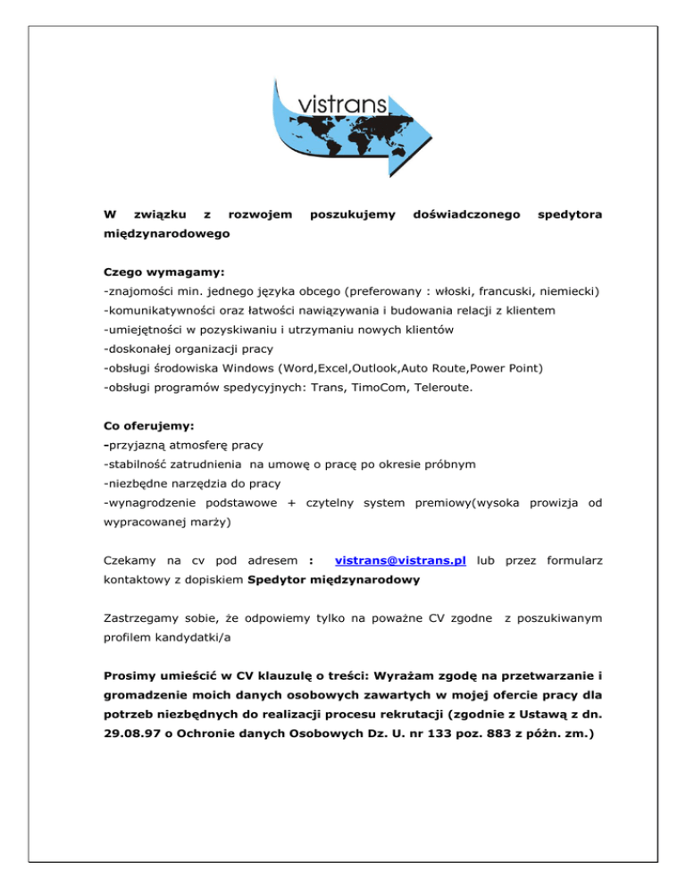 W związku z rozwojem poszukujemy doświadczonego spedytora międzynarodowego Czego wymagamy: -znajomości min. jednego języka obcego (preferowany : włoski, francuski, niemiecki) -komunikatywności oraz łatwości nawiązywania i budowania relacji z klientem -umiejętności w pozyskiwaniu i utrzymaniu nowych klientów -doskonałej organizacji pracy -obsługi środowiska Windows (Word,Excel,Outlook,Auto Route,Power Point) -obsługi programów spedycyjnych: Trans, TimoCom, Teleroute. Co oferujemy: -przyjazną atmosferę pracy -stabilność zatrudnienia na umowę o pracę po okresie próbnym -niezbędne narzędzia do pracy -wynagrodzenie podstawowe + czytelny system premiowy(wysoka prowizja od wypracowanej marży) Czekamy na cv pod adresem : [email protected] lub przez formularz kontaktowy z dopiskiem Spedytor międzynarodowy Zastrzegamy sobie, że odpowiemy tylko na poważne CV zgodne z poszukiwanym profilem kandydatki/a Prosimy umieścić w CV klauzulę o treści: Wyrażam zgodę na przetwarzanie i gromadzenie moich danych osobowych zawartych w mojej ofercie pracy dla potrzeb niezbędnych do realizacji procesu rekrutacji (zgodnie z Ustawą z dn. 29.08.97 o Ochronie danych Osobowych Dz. U. nr 133 poz. 883 z póżn. zm.)