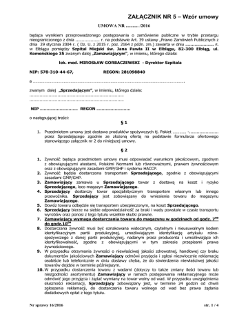 ZAŁĄCZNIK NR 5 – Wzór umowy UMOWA NR ........... /2016 będąca wynikiem przeprowadzonego postępowania o zamówienie publiczne w trybie przetargu nieograniczonego z dnia ................... r. na podstawie Art. 39 ustawy „Prawo Zamówień Publicznych z dnia 29 stycznia 2004 r. ( Dz. U. z 2015 r. poz. 2164 z późn. zm.) zawarta w dniu ...................... r. w Elblągu pomiędzy Szpital Miejski św. Jana Pawła II w Elblągu, 82-300 Elbląg, ul. Komeńskiego 35 zwanym dalej „Zamawiającym", w imieniu, którego działa: lek. med. MIROSŁAW GORBACZEWSKI - Dyrektor Szpitala NIP: 578-310-44-67, REGON: 281098840 a ……………………………………………………………………………………………………………………. zwanym dalej „Sprzedającym”, w imieniu, którego działa: .......................................................................... .......................................................................... NIP ............................. REGON .......................... o następującej treści: §1 1. Przedmiotem umowy jest dostawa produktów spoŜywczych tj. Pakiet ………… -....................... przez Sprzedającego zgodnie ze złoŜoną ofertą na podstawie formularza ofertowego stanowiącego załącznik nr 2 do niniejszej umowy. §2 1. śywność będąca przedmiotem umowy musi odpowiadać warunkom jakościowym, zgodnym z obowiązującymi atestami, Polskimi Normami lub równowaŜnymi, prawem Ŝywnościowym oraz z obowiązującymi zasadami GMP/GHP i systemu HACCP. 2. śywność będzie dostarczona transportem Sprzedającego, zgodnie z obowiązującymi zasadami GMP/GHP. 3. Zamawiający zamawia u Sprzedającego towar z dostawą na koszt i ryzyko Sprzedającego, loco magazyn Zamawiającego. 4. Sprzedający dostarczy towar specjalistycznym transportem własnym lub innego przewoźnika. Sprzedający jest zobowiązany do wniesienia towaru do magazynu Zamawiającego. 5. Dowóz towaru odbędzie się transportem ubezpieczonym, na koszt Sprzedającego. 6. Sprzedający bierze na siebie odpowiedzialność za braki i wady powstałe w czasie transportu wyrobów oraz ponosi z tego tytułu wszelkie skutki prawne. 7. Zamawiający wymaga dostarczania towaru do magazynu w godzinach od godz. 700 do godz.1000 8. Dostarczana Ŝywność musi być oznakowana widocznym, czytelnym i nieusuwalnym kodem identyfikacyjnym partii produkcyjnej, umoŜliwiającym identyfikację artykułu rolnospoŜywczego z danej partii produkcyjnej, nadanym przez producenta i umoŜliwiające ich identyfikowalność, zgodne z obowiązującymi w tym zakresie przepisami prawa Ŝywnościowego. 9. W przypadku otrzymania Ŝywności o niewłaściwej jakości zdrowotnej, handlowej czy braku dokumentów jakościowych Zamawiający odmówi przyjęcia i zgłosi niezwłocznie reklamację osobiście lub telefonicznie w dniu dostawy chyba, Ŝe do stwierdzenia niewłaściwej jakości towarów dojdzie w terminie późniejszym. 10. W przypadku dostarczenia towaru z wadami (dotyczy to takŜe zmiany ilości towaru lub niezgodności asortymentu) Zamawiający w ramach postępowania reklamacyjnego moŜe odmówić jego przyjęcia i Ŝądać wymiany na towar wolny od wad. W przypadku uwzględnienia słuszności reklamacji, Sprzedający zobowiązany jest, w terminie 24 godzin od chwili zgłoszenia reklamacji, do dostarczenia towaru wolnego od wad bez prawa Ŝądania dodatkowych opłat z tego tytułu. Nr sprawy 16/2016 str. 1 / 4 ZAŁĄCZNIK NR 5 – Wzór umowy 11. Zamawiający, wedle własnego uznania moŜe zrezygnować z Ŝądania wymiany towaru na towar wolny od wad w przypadku, gdy otrzymanie towaru, wskutek braku zachowania terminu, stało się dla Zamawiającego zbędne. 12. Zamawiający zastrzega sobie prawo do decydowania o sposobie regulowania powstałych niedoborów, wymianie towaru na wolny od wad lub korekcie faktury. 13. W przypadku dostarczenia towaru środkiem transportu niespełniającym wymagań ustawowych, Zamawiający moŜe odmówić jego przyjęcia, Ŝądając wymiany towaru i ponownego dostarczenia go środkiem transportu spełniającym wymagania, w czasie do 24 godzin licząc od momentu stwierdzenia dostawy wadliwym środkiem transportu. Zamawiający, wedle własnego uznania, moŜe zrezygnować z Ŝądania wymiany towaru na towar wolny od wad w przypadku, gdy otrzymanie towaru, wskutek braku zachowania terminu, stało się dla Zamawiającego zbędne. W takim przypadku Zamawiającemu słuŜy prawo Ŝądania korekty faktury. 14. Sprzedający zobowiązuje się przekazywać Ŝywność bezpośrednio osobie upowaŜnionej do odbioru i kontroli ilościowej i jakościowej. Nie dopuszcza się pozostawiania Ŝywności przez Sprzedającego bez nadzoru lub osobom nieupowaŜnionym. 15. Odbiór ilościowo-jakościowy dostarczonej Ŝywności, będzie potwierdzany przez upowaŜnionego pracownika Zamawiającego. 16. Sprzedający zobowiązuje się do udostępnienia przy dostawie wszystkich niezbędnych informacji w celu dokonania oceny ilościowo – jakościowej odbieranej Ŝywności. 17. Jako koordynatora w zakresie obowiązków wynikających z niniejszej umowy Zamawiający wyznacza Kierownika Działu śywienia – p. Danutę Karwacką tel. (55) 239-45-60 18. Jako koordynatora w zakresie obowiązków wynikających z niniejszej umowy Sprzedający wyznacza ............................................................................. tel. .................................... . §3 1. Strony zgodnie ustalają, iŜ dostawy towaru będą odbywały się wg cen jednostkowych zawartych w ofercie Sprzedającego. 2. Całkowita wartość zamówienia wynosi .............. zł netto + .......... zł VAT = ............ zł brutto (słownie: .............................................................................................................................. ). 3. W powyŜszej kwocie zawarty jest koszt naleŜnych opłat celnych i opłat podatkowych. 4. Zapłata naleŜności za dostarczony towar nast