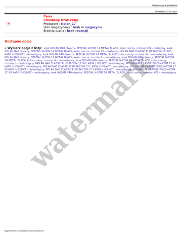 Informacje o produkcie Utworzono 07-03-2017 Cena : Chwilowy brak ceny Producent : Nolan_17 Stan magazynowy : brak w magazynie Średnia ocena : brak recenzji Dostępne opcje » Wybierz opcje z listy: kask NOLAN N40 otwarty, SPECIAL N-COM 14 METAL BLACK, kolor czarny, rozmiar XXL - dostępny, kask w at er m ar k NOLAN N40 otwarty, SPECIAL N-COM 14 METAL BLACK, kolor czarny, rozmiar XS - dostępny, NOLAN N40 CLASSIC PLUS N-COM 17 XXS KASK / HELMET - niedostępny, kask NOLAN N40 otwarty, SPECIAL N-COM 14 METAL BLACK, kolor czarny, rozmiar XL - niedostępny, kask NOLAN N40 otwarty, SPECIAL N-COM 14 METAL BLACK, kolor czarny, rozmiar S - niedostępny, kask NOLAN N40 otwarty, SPECIAL N-COM 14 METAL BLACK, kolor czarny, rozmiar M - niedostępny, kask NOLAN N40 otwarty, SPECIAL N-COM 14 METAL BLACK, kolor czarny, rozmiar L - niedostępny, NOLAN N40 CLASSIC PLUS N-COM 17 XXL KASK / HELMET - niedostępny, NOLAN N40 CLASSIC PLUS N-COM 17 XL KASK / HELMET - niedostępny, NOLAN N40 CLASSIC PLUS N-COM 17 L KASK / HELMET - niedostępny, NOLAN N40 CLASSIC PLUS N-COM 17 M KASK / HELMET - niedostępny, NOLAN N40 CLASSIC PLUS N-COM 17 S KASK / HELMET - niedostępny, NOLAN N40 CLASSIC PLUS N-COM 17 XS KASK / HELMET - niedostępny, kask NOLAN N40 otwarty, SPECIAL N-COM 14 METAL BLACK, kolor czarny, rozmiar XXS - niedostępny. Wygenerowano w programie www.oscGold.com