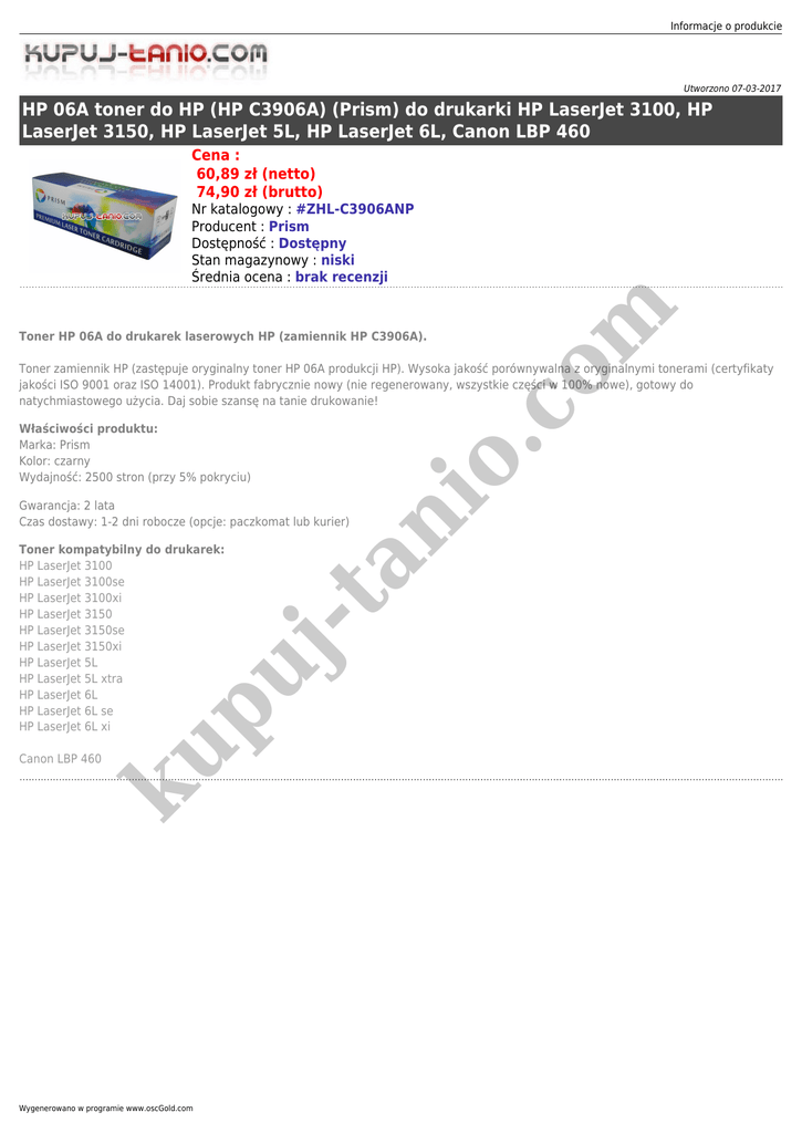 Informacje o produkcie Utworzono 07-03-2017 HP 06A toner do HP (HP C3906A) (Prism) do drukarki HP LaserJet 3100, HP LaserJet 3150, HP LaserJet 5L, HP LaserJet 6L, Canon LBP 460 Cena : 60,89 zł (netto) 74,90 zł (brutto) io .c om Nr katalogowy : #ZHL-C3906ANP Producent : Prism Dostępność : Dostępny Stan magazynowy : niski Średnia ocena : brak recenzji Toner HP 06A do drukarek laserowych HP (zamiennik HP C3906A). Toner zamiennik HP (zastępuje oryginalny toner HP 06A produkcji HP). Wysoka jakość porównywalna z oryginalnymi tonerami (certyfikaty jakości ISO 9001 oraz ISO 14001). Produkt fabrycznie nowy (nie regenerowany, wszystkie części w 100% nowe), gotowy do natychmiastowego użycia. Daj sobie szansę na tanie drukowanie! Właściwości produktu: Marka: Prism Kolor: czarny Wydajność: 2500 stron (przy 5% pokryciu) -t ku p uj Toner kompatybilny do drukarek: HP LaserJet 3100 HP LaserJet 3100se HP LaserJet 3100xi HP LaserJet 3150 HP LaserJet 3150se HP LaserJet 3150xi HP LaserJet 5L HP LaserJet 5L xtra HP LaserJet 6L HP LaserJet 6L se HP LaserJet 6L xi an Gwarancja: 2 lata Czas dostawy: 1-2 dni robocze (opcje: paczkomat lub kurier) Canon LBP 460 Wygenerowano w programie www.oscGold.com