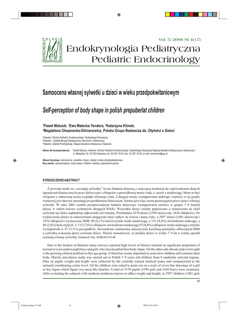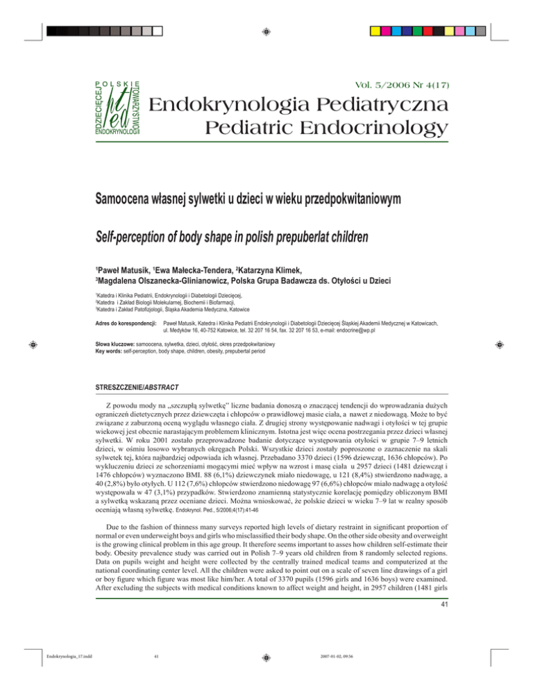 Vol. 5/2006 Nr 4(17) Endokrynologia Pediatryczna Pediatric Endocrinology Samoocena własnej sylwetki u dzieci w wieku przedpokwitaniowym Self-perception of body shape in polish prepuberlat children Paweł Matusik, 1Ewa Małecka-Tendera, 2Katarzyna Klimek, 3 Magdalena Olszanecka-Glinianowicz, Polska Grupa Badawcza ds. Otyłości u Dzieci 1 Katedra i Klinika Pediatrii, Endokrynologii i Diabetologii Dziecięcej, Katedra i Zakład Biologii Molekularnej, Biochemii i Biofarmacji, 3 Katedra i Zakład Patofizjologii, Śląska Akademia Medyczna, Katowice 1 2 Adres do korespondencji: Paweł Matusik, Katedra i Klinika Pediatrii Endokrynologii i Diabetologii Dziecięcej Śląskiej Akademii Medycznej w Katowicach, ul. Medyków 16, 40-752 Katowice, tel. 32 207 16 54, fax. 32 207 16 53, e-mail: [email protected] Słowa kluczowe: samoocena, sylwetka, dzieci, otyłość, okres przedpokwitaniowy Key words: self-perception, body shape, children, obesity, prepubertal period STRESZCZENIE/ABSTRACT Z powodu mody na „szczupłą sylwetkę” liczne badania donoszą o znaczącej tendencji do wprowadzania dużych ograniczeń dietetycznych przez dziewczęta i chłopców o prawidłowej masie ciała, a nawet z niedowagą. Może to być związane z zaburzoną oceną wyglądu własnego ciała. Z drugiej strony występowanie nadwagi i otyłości w tej grupie wiekowej jest obecnie narastającym problemem klinicznym. Istotna jest więc ocena postrzegania przez dzieci własnej sylwetki. W roku 2001 zostało przeprowadzone badanie dotyczące występowania otyłości w grupie 7–9 letnich dzieci, w ośmiu losowo wybranych okręgach Polski. Wszystkie dzieci zostały poproszone o zaznaczenie na skali sylwetek tej, która najbardziej odpowiada ich własnej. Przebadano 3370 dzieci (1596 dziewcząt, 1636 chłopców). Po wykluczeniu dzieci ze schorzeniami mogącymi mieć wpływ na wzrost i masę ciała u 2957 dzieci (1481 dziewcząt i 1476 chłopców) wyznaczono BMI. 88 (6,1%) dziewczynek miało niedowagę, u 121 (8,4%) stwierdzono nadwagę, a 40 (2,8%) było otyłych. U 112 (7,6%) chłopców stwierdzono niedowagę 97 (6,6%) chłopców miało nadwagę a otyłość występowała w 47 (3,1%) przypadków. Stwierdzono znamienną statystycznie korelację pomiędzy obliczonym BMI a sylwetką wskazaną przez oceniane dzieci. Można wnioskować, że polskie dzieci w wieku 7–9 lat w realny sposób oceniają własną sylwetkę. Endokrynol. Ped., 5/2006;4(17):41-46 Due to the fashion of thinness many surveys reported high levels of dietary restraint in significant proportion of normal or even underweight boys and girls who misclassified their body shape. On the other side obesity and overweight is the growing clinical problem in this age group. It therefore seems important to asses how children self-estimate their body. Obesity prevalence study was carried out in Polish 7–9 years old children from 8 randomly selected regions. Data on pupils weight and height were collected by the centrally trained medical teams and computerized at the national coordinating center level. All the children were asked to point out on a scale of seven line drawings of a girl or boy figure which figure was most like him/her. A total of 3370 pupils (1596 girls and 1636 boys) were examined. After excluding the subjects with medical conditions known to affect weight and height, in 2957 children (1481 girls 41 Endokrynologia_17.indd 41 2007-01-02, 09:56 Praca oryginalna Endokrynol. Ped., 5/2006;4(17):41-46 and 1476 boys) BMI was calculated. 88 (6.1%) of girls were underweight, 121 (8.4%) of girls were found overweight by national standard and 40 (2.8%) were obese. 112 (7.6%) of boys were underweight, 97 (6.6%) of boys were found overweight and 47 (3.1%) obese by the same standard. Statistically significant correlation between BMI and figure selected by children was found. It is concluded that Polish prepubertal children express realistic self-perception of their body shape. Pediatr. Endocrinol., 5/2006;4(17):41-46 Wstęp Zaburzenia odżywiania u dzieci są obecnie bardzo istotnym problemem klinicznym. Na jednym biegunie mamy do czynienia ze zbytnimi ograniczeniami, kalorycznymi związanymi z lansowaną przez media i powszechnie akceptowaną społecznie modą na „szczupłą sylwetkę”. Z drugiej strony w ostatnich dwóch dekadach obserwuje się znaczący wzrost występowania nadwagi i otyłości w tej grupie wiekowej [1, 2]. Uważa się, że jednym z czynników odpowiedzialnych za zwiększenie zapadalności na schorzenia z grupy zaburzeń odżywiania jest nieprawidłowa ocena własnej sylwetki przez dzieci i młodzież, a także ich rodziców. Problem ten dotyczy głównie młodzieży w okresie dojrzewania. Obecnie jednak już w bardzo wczesnym okresie życia społeczne oddziaływanie kształtuje u dzieci model „idealnej” sylwetki, np. poprzez kie- rowanie reklam do bardzo małych dzieci czy rewie mody i konkursy małej miss w przedszkolu i szkole. Celem pracy była zatem ocena, czy polskie dzieci w wieku przedpokwitaniowym (7–9 lat) prawidłowo oceniają swoją sylwetkę. Material i metody Badanie dotyczące występowania otyłości zostało przeprowadzone w roku 2001 w grupie 7–9letnich polskich dzieci na podstawie protokołu zaproponowanego przez European Childhood Obesity Group [1]. Badanie przeprowadzono w ośmiu losowo wybranych okręgach Polski. Dalszy losowy dobór dzieci prowadzony był metodą klastrów sporządzonych w oparciu o listy uczniów uczęszczających do klas I i II szkół podstawowych. Pomiary antropometryczne (wzrost, masa ciała, obwód talii, obwód bioder) były wykonywane przez cen- A B Rycina 1. Zestaw siedmiu sylwetek wykorzystany do samooceny własnego ciała dla (A) chłopców i (B) dziewczynek Figure 1. The seven figure silhouettes for self-estimation of body shape for (A) boys and (B) girls 42 Endokrynologia_17.indd 42 2007-01-02, 09:56 Matusik P. i inni – Samoocena własnej sylwetki u dzieci w wieku przedpokwitani