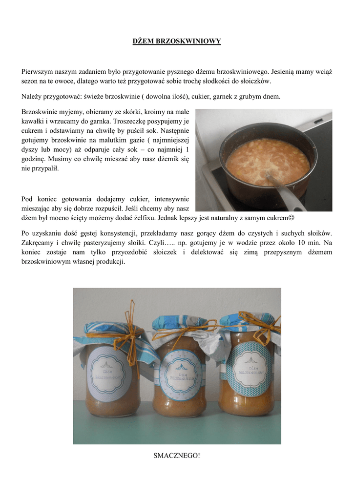 DŻEM BRZOSKWINIOWY Pierwszym naszym zadaniem było przygotowanie pysznego dżemu brzoskwiniowego. Jesienią mamy wciąż sezon na te owoce, dlatego warto też przygotować sobie trochę słodkości do słoiczków. Należy przygotować: świeże brzoskwinie ( dowolna ilość), cukier, garnek z grubym dnem. Brzoskwinie myjemy, obieramy ze skórki, kroimy na małe kawałki i wrzucamy do garnka. Troszeczkę posypujemy je cukrem i odstawiamy na chwilę by puścił sok. Następnie gotujemy brzoskwinie na malutkim gazie ( najmniejszej dyszy lub mocy) aż odparuje cały sok – co najmniej 1 godzinę. Musimy co chwilę mieszać aby nasz dżemik się nie przypalił. Pod koniec gotowania dodajemy cukier, intensywnie mieszając aby się dobrze rozpuścił. Jeśli chcemy aby nasz dżem był mocno ścięty możemy dodać żelfixu. Jednak lepszy jest naturalny z samym cukrem Po uzyskaniu dość gęstej konsystencji, przekładamy nasz gorący dżem do czystych i suchych słoików. Zakręcamy i chwilę pasteryzujemy słoiki. Czyli….. np. gotujemy je w wodzie przez około 10 min. Na koniec zostaje nam tylko przyozdobić słoiczek i delektować się zimą przepysznym dżemem brzoskwiniowym własnej produkcji. SMACZNEGO!