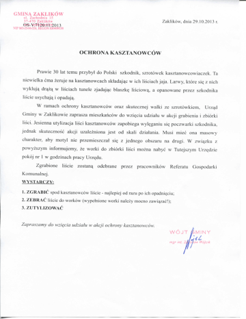 GMINA Z A K L I K 6 W ul. Zachodnia 15 37-470 Zaklik6w Zaklikow, dnia 29.10.2013 r. NIP865-23-96-324. RF.GON 830409130 O C H R O N A K A S Z T A N O W C O W Prawie 30 lat temu przybyt do Polski szkodnik, szrotowek kasztanowcowiaczek. Ta niewielka cma zeruje na kasztanowcach skladaj^c w ich lisciach jaja. Larwy, ktore siQ z nich wykluj^ dr^z^ w lisciach tunele zjadaj^c blaszkQ lisciow^, a opanowane przez szkodnika liscie usychaj^ i opadaj^. W ramach ochrony kasztanowcow oraz skutecznej walki ze szrotowkiem, Urz^d Gminy w Zaklikowie zaprasza mieszkancow do wziqcia udzialu w akcji grabienia i zbiorki lisci. Jesienna utylizacja lisci kasztanowcow zapobiega wylQganiu siQ poczwarki szkodnika, jednak skutecznosc akcji uzalezniona jest od skali dzialania. Musi mice ona masowy . charakter, aby motyl nie przemieszczal siQ z jednego obszaru na drugi. W zwi^zku z powyzszym informujemy, ze worki do zbiorki lisci mozna nabyc w Tutejszym Urz^dzie pokoj nr 1 w godzinach pracy Urzqdu. Zgrabione liscie zostan^ odebrane przez pracownikow Referatu Gospodarki Komunalnej. WYSTARCZY: 1. Z G R A B I C sped kasztanowcow liscie - najlcpicj od razu po ich opadniqciu; 2. Z E B R A C liscie do workow (wypelnionc worki nalczy mocno zawi^zac!); 3. Z U T Y L I Z O W A C Zapraszamy do wziqcia udzialu w akcji ochrony kasztanowcow. WOJT EMINY mgr inz. Zdlisfaw Wdjcik