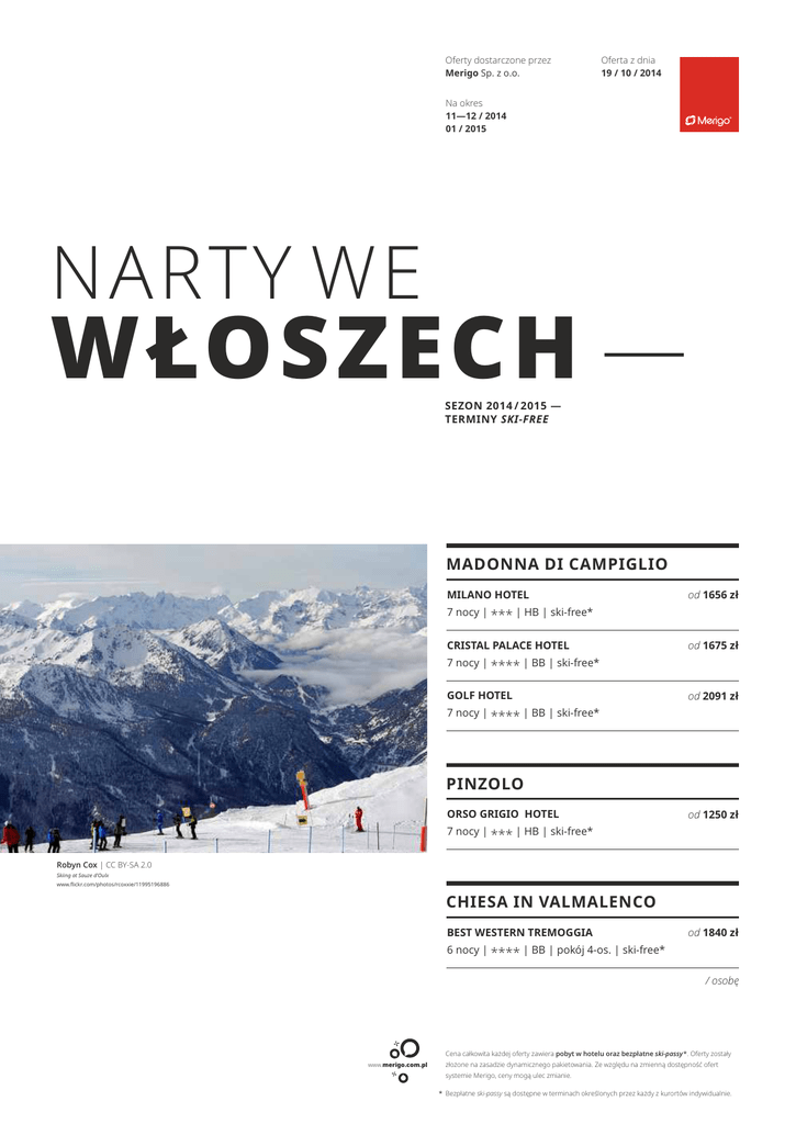 Oferty dostarczone przez Meri o Sp. z o.o. Oferta z dnia 19 / 10 / 2014 Na okres 11—12 / 2014 01 / 2015 ® NARTY WE WŁOSZECH — SEZON 2014 / 2015 — TERM NY SK -FREE MADONNA D CAMP GL O M LANO HOTEL od 1656 zł 7 nocy | *** | HB | ski-free* CR STAL PALACE HOTEL od 1675 zł 7 nocy | **** | BB | ski-free* GOLF HOTEL od 2091 zł 7 nocy | **** | BB | ski-free* P NZOLO ORSO GR G O HOTEL od 1250 zł 7 nocy | *** | HB | ski-free* Robyn Cox | CC BY-SA 2.0 Skiin at Sauze d'Oulx www.flickr.com/photos/rcoxxie/11995196886 CH ESA N VALMALENCO BEST WESTERN TREMOGG A od 1840 zł 6 nocy | **** | BB | pokój 4-os. | ski-free* / osobę Cena całkowita każdej oferty zawiera pobyt w hotelu oraz bezpłatne ski-passy *. Oferty zostały www.meri o.com.pl złożone na zasadzie dynamiczne o pakietowania. Ze wz lędu na zmienną dostępność ofert systemie Meri o, ceny mo ą ulec zmianie. * Bezpłatne ski-passy są dostępne w terminach określonych przez każdy z kurortów indywidualnie. Oferty dostarczone przez Meri o Sp. z o.o. Oferta z dnia 19 / 10 / 2014 Na okres 11—12 / 2014 01 / 2015 ® NARTY W AUSTRII — SEZON 2014 / 2015 — TERM NY SK -FREE GLS BON ALP NA od 1570 zł 7 nocy | *** | HB | ski-free* SPORTHOTEL GLS od 1590 zł 7 nocy | **** | BB | ski-free* NNSBRUCK RAMADA NNSBRUCK T VOL od 1334 zł 7 nocy | *** | BB | ski-free* ALPHOTEL od 1360 zł 7 nocy | **** | BB | ski-free* / osobę Then ineer | CC BY-SA 2.0 Panoramic www.flickr.com/photos/then ineer/5486532865 Cena całkowita każdej oferty zawiera pobyt w hotelu oraz bezpłatne ski-passy *. Oferty zostały www.meri o.com.pl złożone na zasadzie dynamiczne o pakietowania. Ze wz lędu na zmienną dostępność ofert systemie Meri o, ceny mo ą ulec zmianie. * Bezpłatne ski-passy są dostępne w terminach określonych przez każdy z kurortów indywidualnie.