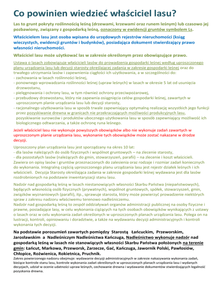 Co powinien wiedzieć właściciel lasu? Las to grunt pokryty roślinnością leśną (drzewami, krzewami oraz runem leśnym) lub czasowo jej pozbawiony, związany z gospodarką leśną, oznaczony w ewidencji gruntów symbolem Ls. Właścicielem lasu jest osoba wpisana do urzędowych rejestrów nieruchomości (ksiąg wieczystych, ewidencji gruntów i budynków), posiadająca dokument stwierdzający prawo własności nieruchomości. Właściciel lasu może użytkować las w zakresie określonym przez obowiązujące prawo. Ustawa o lasach zobowiązuje właścicieli lasów do prowadzenia gospodarki leśnej według uproszczonego planu urządzania lasu lub decyzji starosty określającej zadania w zakresie gospodarki leśnej oraz do trwałego utrzymania lasów i zapewnienia ciągłości ich użytkowania, a w szczególności do: - zachowania w lasach roślinności leśnej, - ponownego wprowadzania roślinności leśnej (upraw leśnych) w lasach w okresie 5 lat od usunięcia drzewostanu, - pielęgnowania i ochrony lasu, w tym również ochrony przeciwpożarowej, - przebudowy drzewostanu, który nie zapewnia osiągnięcia celów gospodarki leśnej, zawartych w uproszczonym planie urządzania lasu lub decyzji starosty, - racjonalnego użytkowania lasu w sposób trwale zapewniający optymalną realizację wszystkich jego funkcji przez pozyskiwanie drewna w granicach nie przekraczających możliwości produkcyjnych lasu, pozyskiwanie surowców i produktów ubocznego użytkowania lasu w sposób zapewniający możliwość ich biologicznego odtwarzania, a także ochronę runa leśnego. Jeżeli właściciel lasu nie wykonuje powyższych obowiązków albo nie wykonuje zadań zawartych w uproszczonym planie urządzania lasu, wykonanie tych obowiązków może zostać nakazane w drodze decyzji. Uproszczony plan urządzania lasu jest sporządzany na okres 10 lat: - dla lasów należących do osób fizycznych i wspólnot gruntowych – na zlecenie starosty, - dla pozostałych lasów (należących do gmin, stowarzyszeń, parafii) – na zlecenie i koszt właścicieli. Zawiera on opisy lasów i gruntów przeznaczonych do zalesienia oraz rodzaje i rozmiar zadań koniecznych do wykonania. Integralną częścią uproszczonego planu urządzania lasu jest rejestr działek leśnych i ich właścicieli. Decyzja Starosty określająca zadania w zakresie gospodarki leśnej wydawana jest dla lasów rozdrobnionych na podstawie inwentaryzacji stanu lasu. Nadzór nad gospodarką leśną w lasach niestanowiących własności Skarbu Państwa (niepaństwowych), będących własnością osób fizycznych (prywatnych), wspólnot gruntowych, spółek, stowarzyszeń, gmin, związków wyznaniowych (parafii), itp., sprawuje starosta, który może powierzyć prowadzenie niektórych spraw z zakresu nadzoru właściwemu terenowo nadleśniczemu. Nadzór nad gospodarką leśną to zespół oddziaływań organów administracji publicznej na osoby fizyczne i prawne, posiadające lasy, w celu wykonania ciążących na tych osobach obowiązków wynikających z ustawy o lasach oraz w celu wykonania zadań określonych w uproszczonych planach urządzania lasu. Polega on na lustracji, kontroli, opiniowaniu i doradztwie, a także na wydawaniu decyzji administracyjnych i kontroli wykonania tych decyzji. Na podstawie porozumień zawartych pomiędzy Starostą Łańcuckim, Przeworskim, Jarosławskim a Nadleśniczym Nadleśnictwa Kańczuga, Nadleśnictwo wykonuje nadzór nad gospodarką leśną w lasach nie stanowiących własności Skarbu Państwa położonych na terenie gmin: Łańcut, Markowa, Przeworsk, Zarzecze, Gać, Kańczuga, Jawornik Polski, Pawłosiów, Chłopice, Roźwienica, Rokietnica, Pruchnik. Zakres powierzonego nadzoru obejmuje: wydawanie decyzji administracyjnych w zakresie nakazywania wykonania zadań, bieżące kontrole stanu lasu, kontrole wykonania zadań określonych w uproszczonych planach urządzania lasu i wydanych decyzjach, udział w ocenie udatności upraw leśnych, cechowanie drewna i wydawanie dokumentów stwierdzających legalność pozyskania drewna. Pozyskiwanie drewna w lasach niestanowiących własności Skarbu Państwa może być wykonywane na podstawie uproszczonego planu urządzania lasu lub decyzji starosty określającej zadania w zakresie gospodarki leśnej. Pozyskiwanie drewna niezgodnie z wyżej wymienionymi dokumentami jest możliwe wyłącznie w przypadkach losowych, decyzję w tej sprawie na wniosek właściciela lasu, wydaje starosta. Drewno pozyskane w lasach podlega ocechowaniu. Cechowanie drewna wykonuje pracownik Nadleśnictwa Kańczuga prowadzący nadzór nad gospodarką leśną, w miejscu jego pozyskania, to jest na działce leśnej, gdzie zostało wycięte, po uprzednim złożeniu przez właściciela lasu zawiadomienia o pozyskaniu drewna. Druk zawiadomienia o pozyskaniu drewna dostępny jest w biurze Nadleśnictwa Kańczuga, na stronie internetowej http://www.kanczuga.krosno.lasy.gov.pl, u pracownika dokonującego cechowania drewna lub w Urzędzie Gminy. Wskazane jest składanie zawiadomienia o pozyskaniu drewna w terminie co najmniej 7 dni przed przystąpieniem do wycinki drzew w celu sprawdzenia rozmiaru pozyskania drewna planowanego w uproszczonym planie urządzania lasu oraz sprawdzenia, czy osoba składająca zawiadomienie jest wpisana w rejestrze działek leśnych i ich właścicieli. W przypadku braku wpisu do rejestru działek leśnych i ich właścicieli osoba składająca zawiadomienie jest proszona o przedłożenie dokumentu stwierdzającego prawo do władania działką leśną. Jeżeli tytuł własności posiada więcej niż jedna osoba, (działka stanowi współwłasność), osoba składająca zawiadomienie przed przystąpieniem do wyrębu drzew winna uzyskać pisemną zgodę w formie oświadczenia wszystkich współwłaścicieli na dokonanie wyrębu. Oświadczenia te należy dołączyć do zawiadomienia o pozyskaniu drewna. W przypadku współwłasności małżeńskiej zawiadomieni