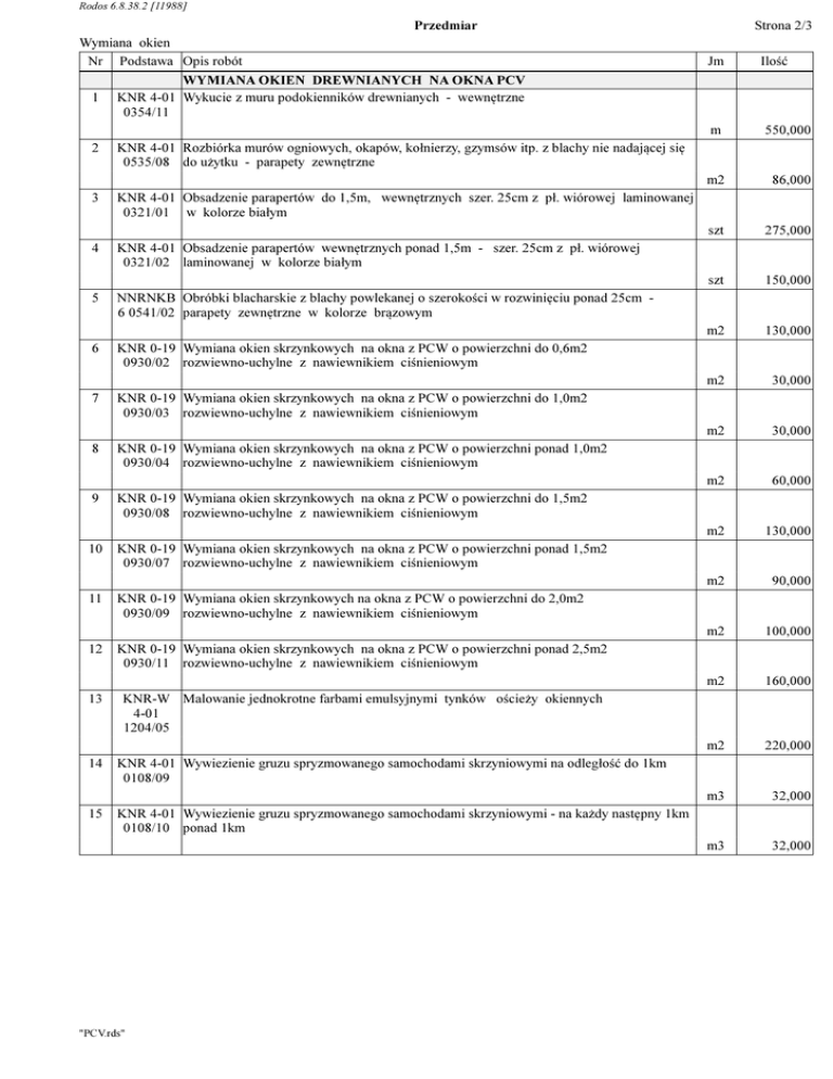 Rodos 6.8.38.2 [11988] Strona 2/3 Przedmiar Wymiana okien Nr Podstawa Opis robót WYMIANA OKIEN DREWNIANYCH NA OKNA PCV 1 KNR 4-01 Wykucie z muru podokienników drewnianych - wewnętrzne 0354/11 2 3 4 550,000 m2 86,000 szt 275,000 szt 150,000 m2 130,000 m2 30,000 m2 30,000 m2 60,000 m2 130,000 m2 90,000 m2 100,000 m2 160,000 m2 220,000 m3 32,000 m3 32,000 KNR 4-01 Obsadzenie parapertów wewnętrznych ponad 1,5m - szer. 25cm z pł. wiórowej 0321/02 laminowanej w kolorze białym 6 KNR 0-19 Wymiana okien skrzynkowych na okna z PCW o powierzchni do 0,6m2 0930/02 rozwiewno-uchylne z nawiewnikiem ciśnieniowym 7 KNR 0-19 Wymiana okien skrzynkowych na okna z PCW o powierzchni do 1,0m2 0930/03 rozwiewno-uchylne z nawiewnikiem ciśnieniowym KNR 0-19 Wymiana okien skrzynkowych na okna z PCW o powierzchni ponad 1,0m2 0930/04 rozwiewno-uchylne z nawiewnikiem ciśnieniowym 9 KNR 0-19 Wymiana okien skrzynkowych na okna z PCW o powierzchni do 1,5m2 0930/08 rozwiewno-uchylne z nawiewnikiem ciśnieniowym 10 KNR 0-19 Wymiana okien skrzynkowych na okna z PCW o powierzchni ponad 1,5m2 0930/07 rozwiewno-uchylne z nawiewnikiem ciśnieniowym 11 KNR 0-19 Wymiana okien skrzynkowych na okna z PCW o powierzchni do 2,0m2 0930/09 rozwiewno-uchylne z nawiewnikiem ciśnieniowym 13 m KNR 4-01 Obsadzenie parapertów do 1,5m, wewnętrznych szer. 25cm z pł. wiórowej laminowanej 0321/01 w kolorze białym NNRNKB Obróbki blacharskie z blachy powlekanej o szerokości w rozwinięciu ponad 25cm 6 0541/02 parapety zewnętrzne w kolorze brązowym 12 Ilość KNR 4-01 Rozbiórka murów ogniowych, okapów, kołnierzy, gzymsów itp. z blachy nie nadającej się 0535/08 do użytku - parapety zewnętrzne 5 8 Jm KNR 0-19 Wymiana okien skrzynkowych na okna z PCW o powierzchni ponad 2,5m2 0930/11 rozwiewno-uchylne z nawiewnikiem ciśnieniowym KNR-W Malowanie jednokrotne farbami emulsyjnymi tynków ościeży okiennych 4-01 1204/05 14 KNR 4-01 Wywiezienie gruzu spryzmowanego samochodami skrzyniowymi na odległość do 1km 0108/09 15 KNR 4-01 Wywiezienie gruzu spryzmowanego samochodami skrzyniowymi - na każdy następny 1km 0108/10 ponad 1km "PCV.rds"