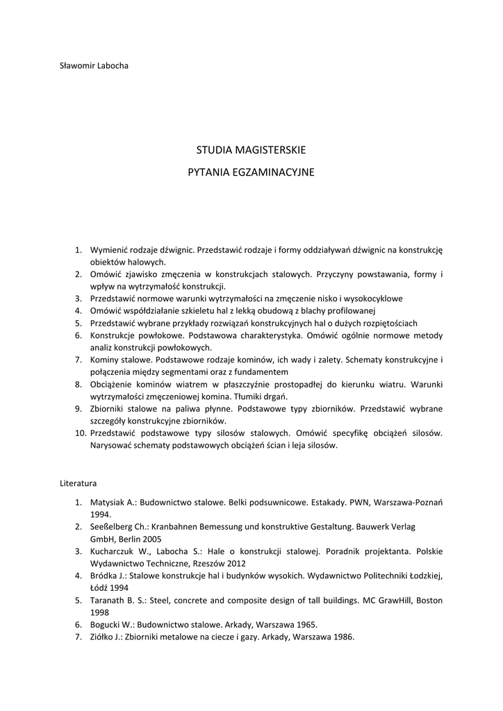 Sławomir Labocha STUDIA MAGISTERSKIE PYTANIA EGZAMINACYJNE 1. Wymienić rodzaje dźwignic. Przedstawić rodzaje i formy oddziaływań dźwignic na konstrukcję obiektów halowych. 2. Omówić zjawisko zmęczenia w konstrukcjach stalowych. Przyczyny powstawania, formy i wpływ na wytrzymałość konstrukcji. 3. Przedstawić normowe warunki wytrzymałości na zmęczenie nisko i wysokocyklowe 4. Omówić współdziałanie szkieletu hal z lekką obudową z blachy profilowanej 5. Przedstawić wybrane przykłady rozwiązań konstrukcyjnych hal o dużych rozpiętościach 6. Konstrukcje powłokowe. Podstawowa charakterystyka. Omówić ogólnie normowe metody analiz konstrukcji powłokowych. 7. Kominy stalowe. Podstawowe rodzaje kominów, ich wady i zalety. Schematy konstrukcyjne i połączenia między segmentami oraz z fundamentem 8. Obciążenie kominów wiatrem w płaszczyźnie prostopadłej do kierunku wiatru. Warunki wytrzymałości zmęczeniowej komina. Tłumiki drgań. 9. Zbiorniki stalowe na paliwa płynne. Podstawowe typy zbiorników. Przedstawić wybrane szczegóły konstrukcyjne zbiorników. 10. Przedstawić podstawowe typy silosów stalowych. Omówić specyfikę obciążeń silosów. Narysować schematy podstawowych obciążeń ścian i leja silosów. Literatura 1. Matysiak A.: Budownictwo stalowe. Belki podsuwnicowe. Estakady. PWN, Warszawa‐Poznań 1994. 2. Seeßelberg Ch.: Kranbahnen Bemessung und konstruktive Gestaltung. Bauwerk Verlag GmbH, Berlin 2005 3. Kucharczuk W., Labocha S.: Hale o konstrukcji stalowej. Poradnik projektanta. Polskie Wydawnictwo Techniczne, Rzeszów 2012 4. Bródka J.: Stalowe konstrukcje hal i budynków wysokich. Wydawnictwo Politechniki Łodzkiej, Łódź 1994 5. Taranath B. S.: Steel, concrete and composite design of tall buildings. MC GrawHill, Boston 1998 6. Bogucki W.: Budownictwo stalowe. Arkady, Warszawa 1965. 7. Ziółko J.: Zbiorniki metalowe na ciecze i gazy. Arkady, Warszawa 1986.