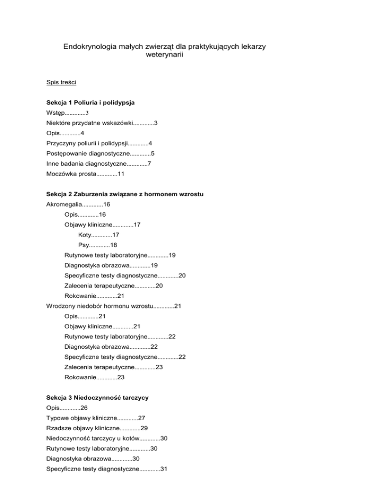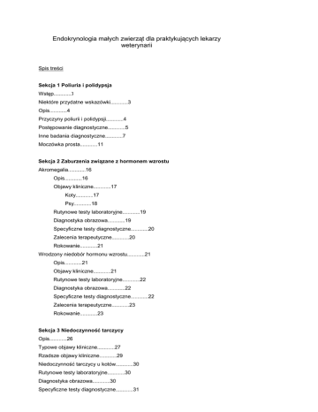 Endokrynologia małych zwierząt dla praktykujących lekarzy weterynarii Spis treści Sekcja 1 Poliuria i polidypsja Wstęp.............3 Niektóre przydatne wskazówki.............3 Opis.............4 Przyczyny poliurii i polidypsji.............4 Postępowanie diagnostyczne.............5 Inne badania diagnostyczne.............7 Moczówka prosta.............11 Sekcja 2 Zaburzenia związane z hormonem wzrostu Akromegalia.............16 Opis.............16 Objawy kliniczne.............17 Koty.............17 Psy.............18 Rutynowe testy laboratoryjne.............19 Diagnostyka obrazowa.............19 Specyficzne testy diagnostyczne.............20 Zalecenia terapeutyczne.............20 Rokowanie.............21 Wrodzony niedobór hormonu wzrostu.............21 Opis.............21 Objawy kliniczne.............21 Rutynowe testy laboratoryjne.............22 Diagnostyka obrazowa.............22 Specyficzne testy diagnostyczne.............22 Zalecenia terapeutyczne.............23 Rokowanie.............23 Sekcja 3 Niedoczynność tarczycy Opis.............26 Typowe objawy kliniczne.............27 Rzadsze objawy kliniczne.............29 Niedoczynność tarczycy u kotów.............30 Rutynowe testy laboratoryjne.............30 Diagnostyka obrazowa.............30 Specyficzne testy diagnostyczne.............31 Zalecenia terapeutyczne.............36 Sekcja 4 Nadczynność tarczycy Opis.............40 Typowe objawy kliniczne.............40 Nadczynność tarczycy u psów.............42 Rutynowe testy laboratoryjne.............42 Diagnostyka obrazowa.............43 Dodatkowe testy diagnostyczne.............44 Specyficzne testy diagnostyczne.............44 Zalecenia terapeutyczne.............47 Sekcja 5 Nadczynność kory nadnerczy Nadczynność kory nadnerczy u psów.............54 Opis.............54 Objawy kliniczne.............55 Rutynowe testy laboratoryjne.............57 Diagnostyka obrazowa.............57 Testy skriningowe przy diagnozowaniu nadczynności kory nadnerczy.............59 Testy róŜnicujące PDH od guza nadnerczy.............66 Zalecenia terapeutyczne.............68 Rokowanie.............76 Nadczynność kory nadnerczy u kotów.............76 Opis.............77 Objawy kliniczne.............77 Rutynowe testy laboratoryjne.............79 Diagnostyka obrazowa.............79 Testy przy diagnozowaniu nadczynności kory nadnerczy.............79 Zalecenia terapeutyczne.............82 Rokowanie.............85 Sekcja 6 Niedoczynność kory nadnerczy Opis.............88 Typowe objawy kliniczne.............89 Rzadsze objawy kliniczne.............91 Rutynowe testy laboratoryjne.............91 Diagnostyka obrazowa.............92 Specyficzne testy diagnostyczne.............92 Zalecenia terapeutyczne.............93 Rokowanie.............97 Niedoczynność kory nadnerczy u kotów.............97 Sekcja 7 Hiperaldosteronizm Opis.............100 Objawy kliniczne.............100 Rutynowe testy laboratoryjne.............101 Diagnostyka obrazowa.............101 Specyficzne testy diagnostyczne.............101 Zalecenia terapeutyczne.............102 Rokowanie.............103 Sekcja 8 Pheochromocytoma Opis.............106 Objawy kliniczne.............106 Rutynowe testy laboratoryjne.............107 Diagnostyka obrazowa.............107 Specyficzne testy diagnostyczne.............108 Zalecenia terapeutyczne.............108 Rokowanie.............108 Sekcja 9 Cukrzyca Opis.............110 Objawy kliniczne.............111 Rutynowe testy laboratoryjne.............112 Diagnostyka obrazowa.............112 Specyficzne testy diagnostyczne.............113 Zalecenia terapeutyczne.............114 Ćwiczenia fizyczne.............114 Dieta.............114 Leczenie insuliną.............115 Monitorowanie leczenia insuliną.............116 Doustne leki hipoglikemiczne.............126 Leczenie insuliną i znieczulenie ogólne.............127 Powikłania cukrzycowe.............128 Rokowanie.............129 Sekcja 10 Cukrzycowa kwasica ketonowa Opis.............132 Objawy kliniczne.............133 Rutynowe testy laboratoryjne.............133 Diagnostyka obrazowa.............134 Specyficzne testy diagnostyczne.............134 Zalecenia terapeutyczne.............134 DoŜylna terapia płynami............. 134 Terapia insulinowa.............135 Terapia kwaśnym węglanem sodu.............137 Uzupełnianie fosforanów.............137 Uzupełnianie potasu.............138 Rokowanie.............139 Nieketonowa cukrzyca hiperosmolarna.............139 Sekcja 11 Hipoglikemia Opis.............142 Przyczyny hipoglikemii.............142 Objawy kliniczne.............143 Rutynowe testy laboratoryjne.............143 Diagnostyka obrazowa.............144 Specyficzne testy diagnostyczne.............145 Zalecenia terapeutyczne.............145 Leczenie nagłego kryzysu hipoglikemicznego.............145 Postępowanie z przewlekłą hipoglikemią............. 146 Rokowanie.............146 Insulinoma.............147 Opis.............147 Objawy kliniczne.............147 Rutynowe testy laboratoryjne.............147 Diagnostyka obrazowa.............147 Specyficzne testy diagnostyczne.............147 Leczenie.............147 Rokowanie.............149 Sekcja 12 Hiperkalcemia Opis.............152 Przyczyny hiperkalcemii............. 152 Postępowanie diagnostyczne.............153 Wywiad i badanie fizykalne.............153 Typowe objawy kliniczne.............154 Rutynowe testy laboratoryjne.............155 Inne testy diagnostyczne.............155 Diagnostyka obrazowa.............157 Specyficzne testy diagnostyczne.............158 Zalecenia terapeutyczne.............159 Rokowanie.............160 Pierwotna nadczynność przytarczyc.............160 Sekcja 13 Hipokalcemia Opis.............154 Przyczyny hipokalcemii.............164 Objawy kliniczne.............165 Rutynowe testy laboratoryjne.............165 Diagnostyka obrazowa.............166 Specyficzne testy diagnostyczne.............166 Zalecenia terapeutyczne.............166 Leczenie nagłych przypadków
