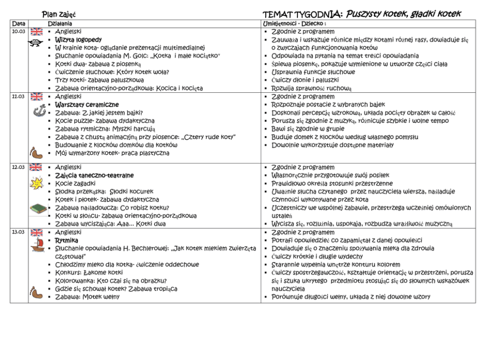 Plan zajęć Data 10.03 11.03 12.03 13.03 Działania TEMAT TYGODNIA: Puszysty kotek, gładki kotek Umiejętności - Dziecko : Angielski Wizyta logopedy W krainie kota- oglądanie prezentacji multimedialnej Słuchanie opowiadania M. Golc: „Kotka i małe kociątko" Kotki dwa- zabawa z piosenką Ćwiczenie słuchowe: Który kotek woła? Trzy kotki- zabawa paluszkowa Zabawa orientacyjno-porządkowa: Kocica i kocięta Angielski Warsztaty ceramiczne Zabawa: Z jakiej jestem bajki? Kocie puzzle- zabawa dydaktyczna Zabawa rytmiczna: Myszki harcują Zabawa z chustą animacyjną przy piosence: „Cztery rude koty” Budowanie z klocków domków dla kotków Mój wymarzony kotek- praca plastyczna Zgodnie z programem Zauważa i wskazuje różnice między kotami różnej rasy, dowiaduje się o zwyczajach funkcjonowania kotów Odpowiada na pytania na temat treści opowiadania Śpiewa piosenkę, pokazuje wymienione w utworze części ciała Usprawnia funkcje słuchowe Ćwiczy dłonie i paluszki Rozwija sprawność ruchową Zgodnie z programem Rozpoznaje postacie z wybranych bajek Doskonali percepcję wzrokową, układa pocięty obrazek w całość Porusza się zgodnie z muzyką, różnicuje szybkie i wolne tempo Bawi się zgodnie w grupie Buduje domek z klocków według własnego pomysłu Dowolnie wykorzystuje dostępne materiały Angielski Zajęcia taneczno-teatralne Kocie zagadki Słodka przekąska: Słodki kocurek Kotek i płotek- zabawa dydaktyczna Zabawa naśladowcza: Co robisz kotku? Kotki w słońcu- zabawa orientacyjno-porządkowa Zabawa wyciszająca: Aaa... Kotki dwa Angielski Rytmika Słuchanie opowiadania H. Bechlerowej: „Jak kotek mlekiem zwierzęta częstował” Chłodzimy mleko dla kotka- ćwiczenie oddechowe Konkurs: Łakome kotki Kolorowanka: Kto czai się na obrazku? Gdzie się schował kotek? Zabawa tropiąca Zabawa: Motek wełny Zgodnie z programem Własnoręcznie przygotowuje swój posiłek Prawidłowo określa stosunki przestrzenne Uważnie słucha czytanego przez nauczyciela wiersza, naśladuje czynności wykonywane przez kota Uczestniczy we wspólnej zabawie, przestrzega wcześniej omówionych ustaleń Wycisza się, rozluźnia, uspokaja, rozbudza wrażliwość muzyczną Zgodnie z programem Potrafi opowiedzieć co zapamiętał z danej opowieści Dowiaduje się o znaczeniu spożywania mleka dla zdrowia Ćwiczy krótkie i długie wydechy Starannie wypełnia wnętrze konturu kolorem Ćwiczy spostrzegawczość, kształtuje orientację w przestrzeni, porusza się i szuka ukrytego przedmiotu stosując się do słownych wskazówek nauczyciela Porównuje długości wełny, układa z niej dowolne wzory 14.03 Angielski Basen- zajęcia fakultatywne Słuchanie „Bajki o kocie i myszach” Ustalenie kolejności wydarzeń Poznajemy zwierzęce menu Dotknij i sprawdź: Czy kotek jest mięciutki? Kot i myszki- zabawa ruchowa Ćwiczenie logopedyczna: Co kotek miał? Myszki- praca plastyczna Zgodnie z programem Słucha opowiadania, ćwiczy pamięć Dzieli zwierzęta na te żywiące się jedynie mięsem, roślinami oraz wszystkożerne, z pomocą nauczyciela układa prosty łańcuch pokarmowy Rozwija zmysł dotyku, poznaje różne rodzaje powierzchni Przestrzega zasad bezpieczeństwa podczas wspólnej zabawy, Ćwiczy narządy mowy Rozwija zdolności manualne